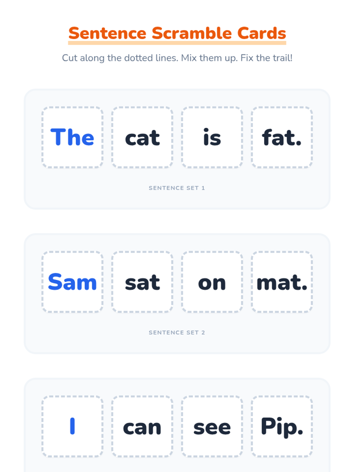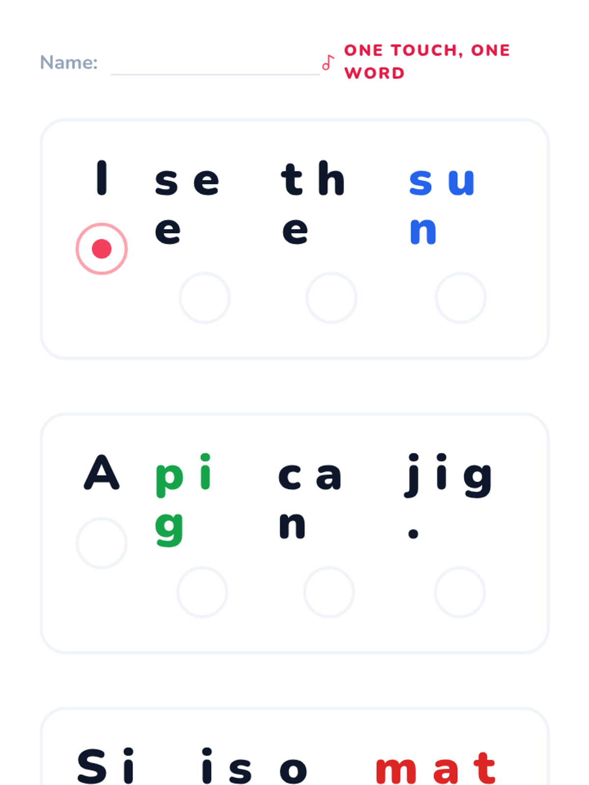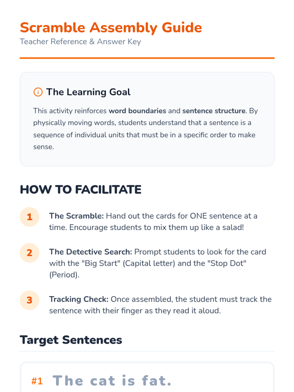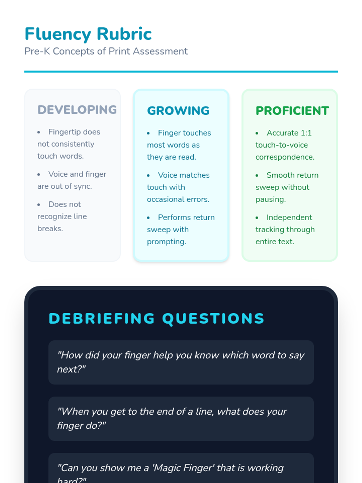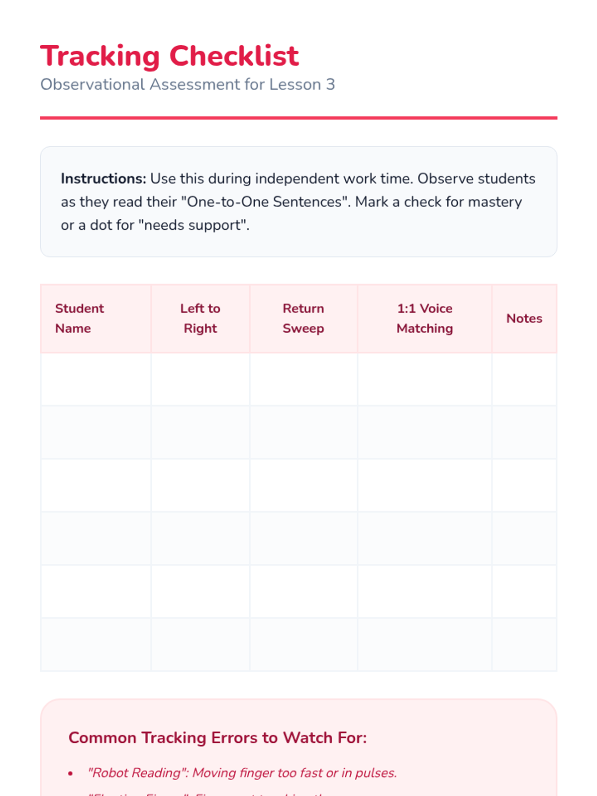 A comprehensive Pre-K sequence focused on teaching print awareness, directionality, and tracking using decodable text foundations. Students transition from teacher-led modeling to independent tracking through engaging, multisensory activities.