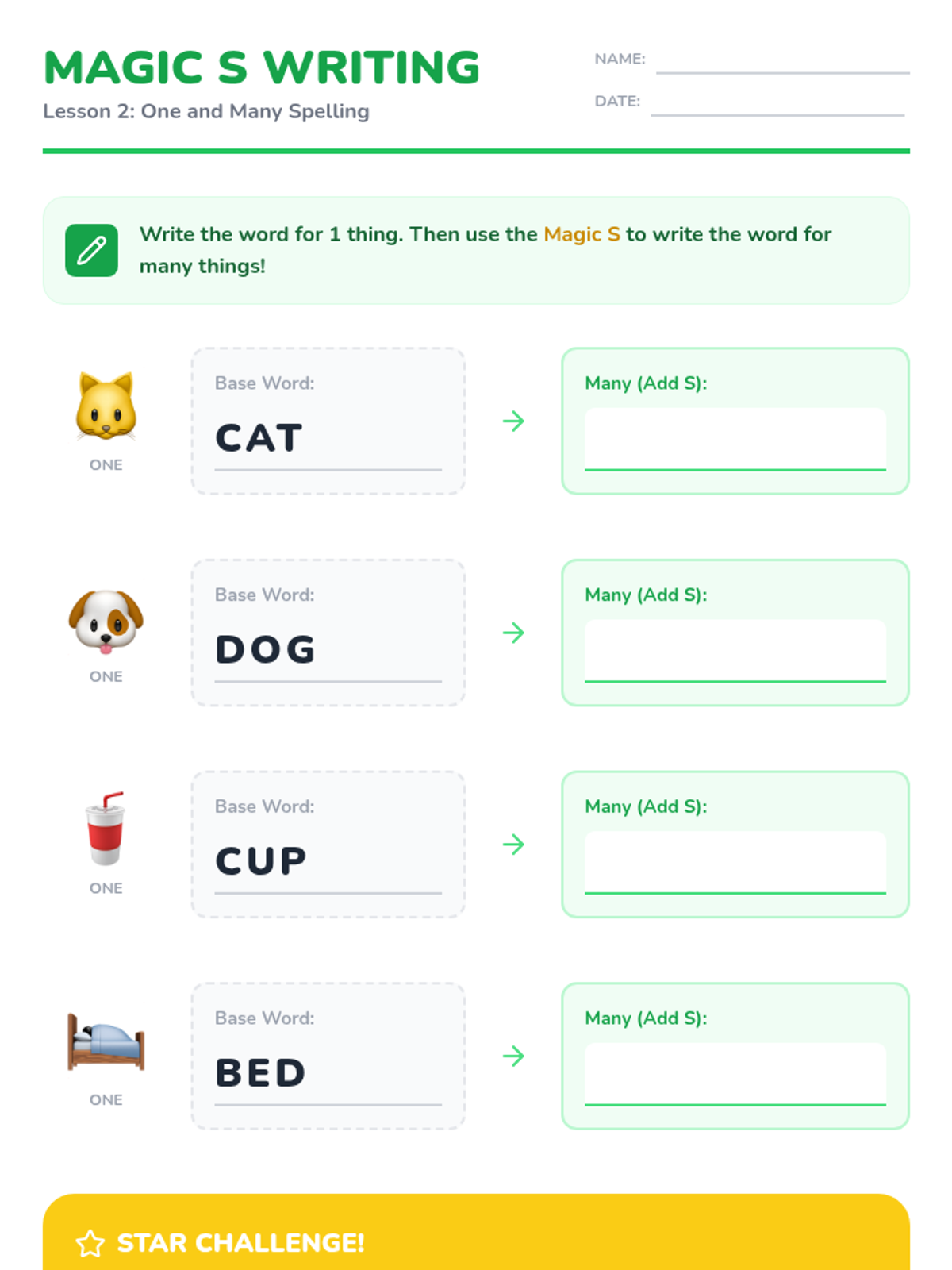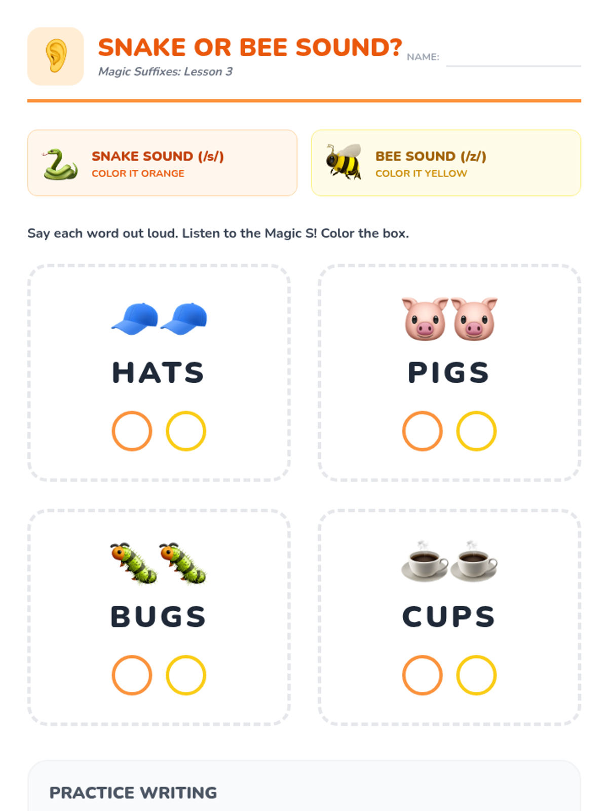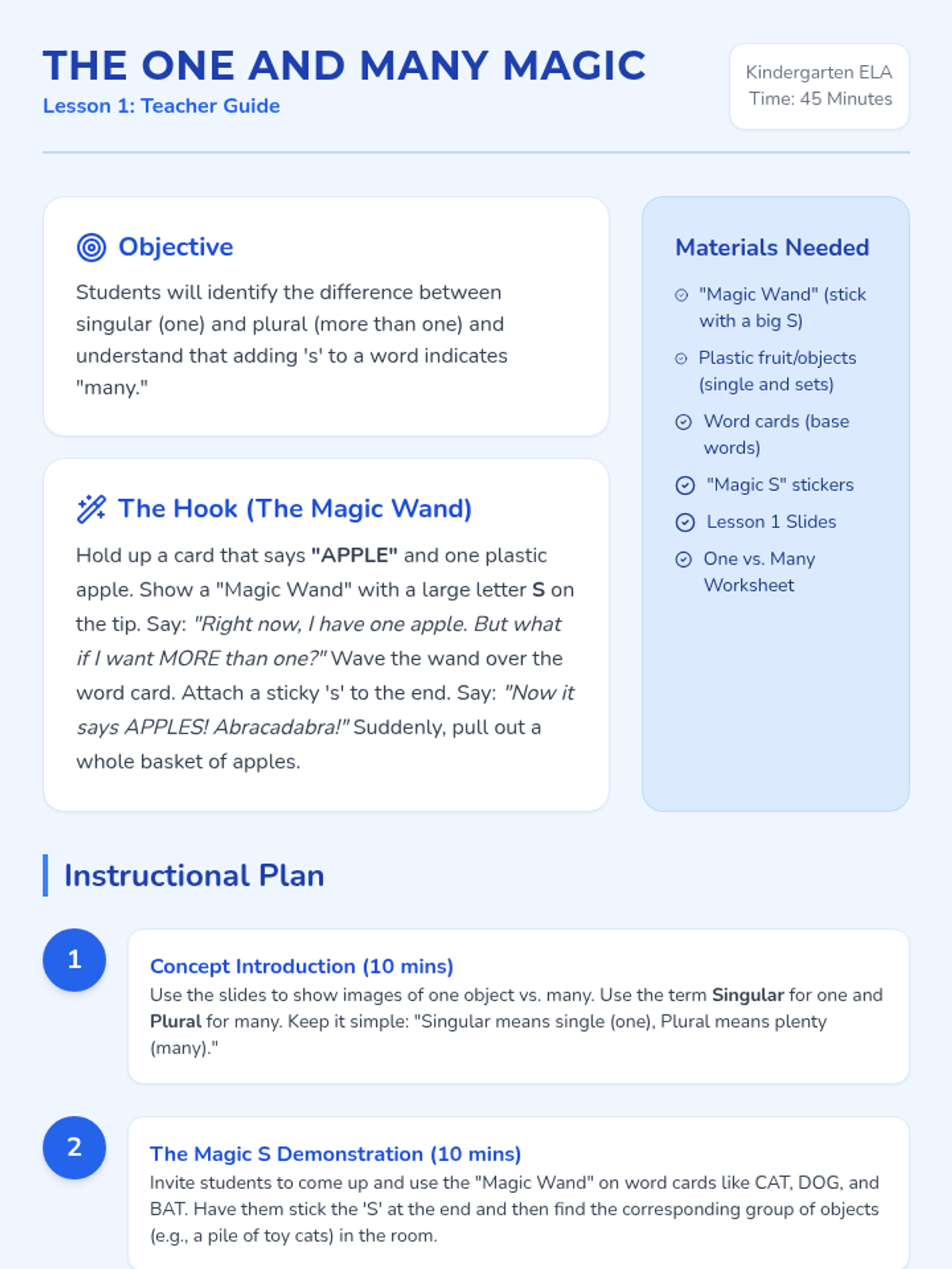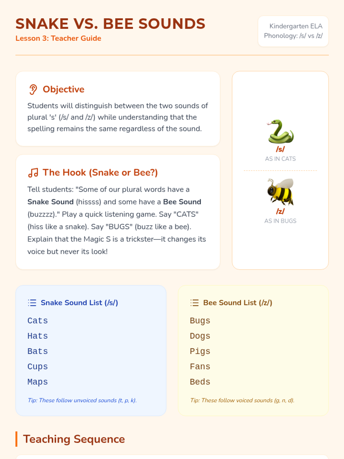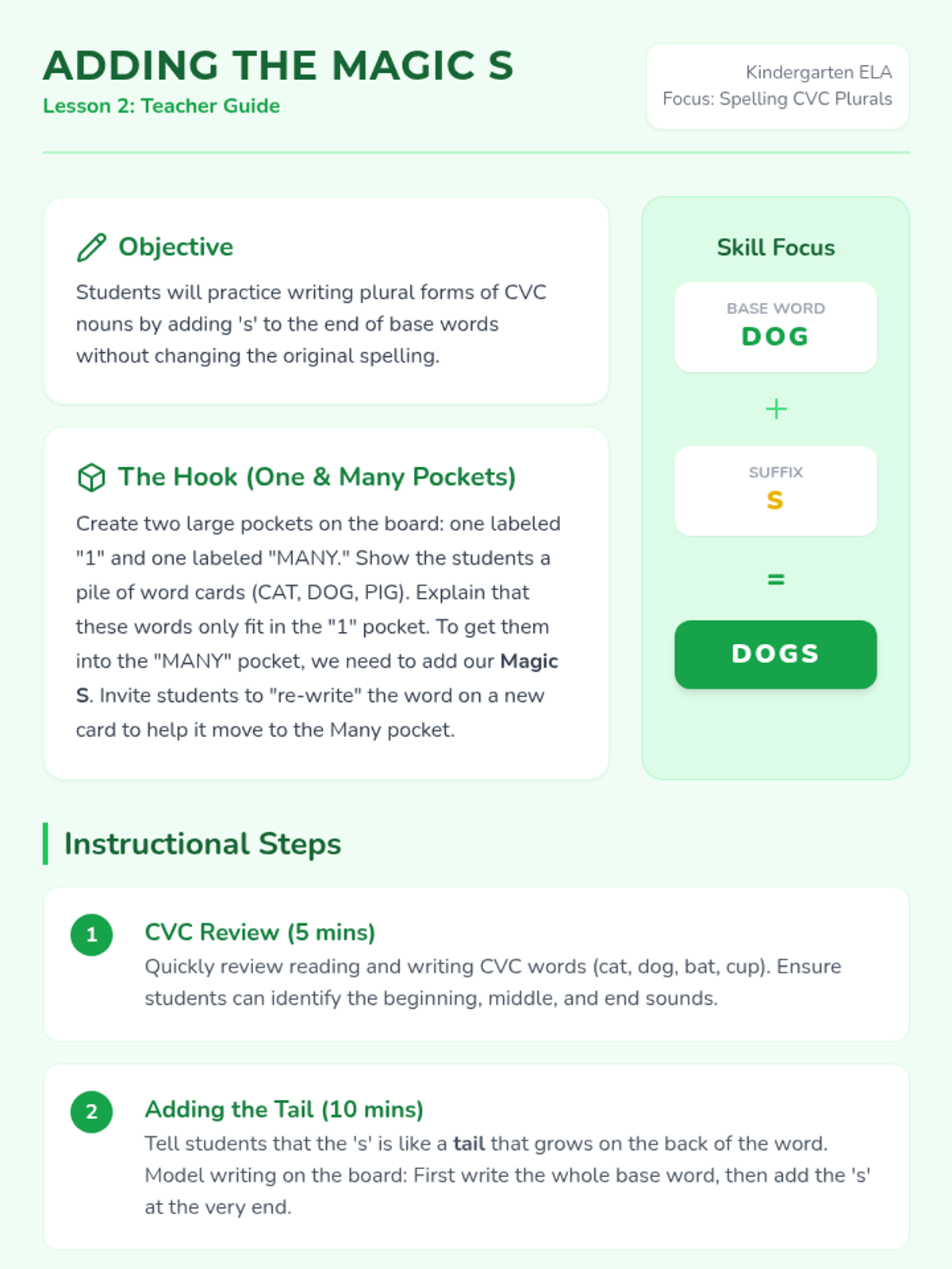 A Kindergarten ELA sequence introducing simple morphology through plural 's' and the '-ing' suffix. Students explore singular vs. plural concepts, the different sounds of 's', and how suffixes change word meanings through games, sorting, and sentence building.