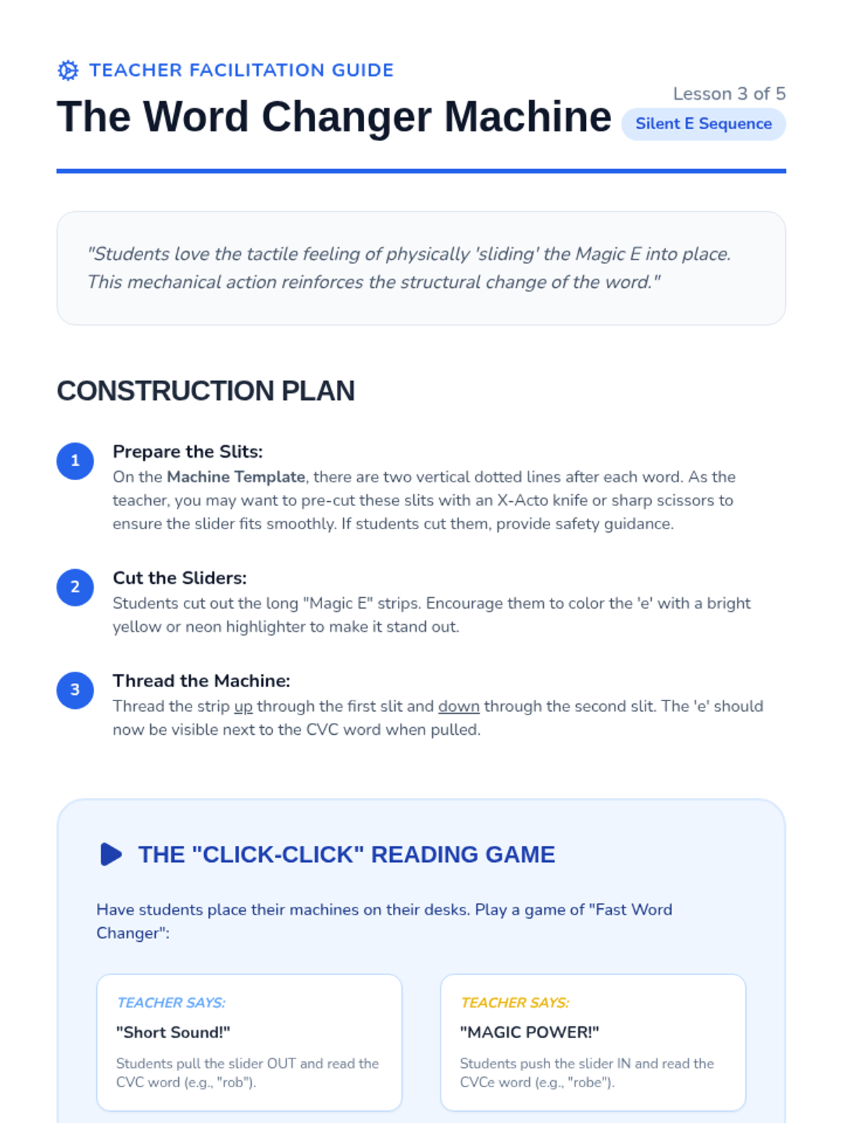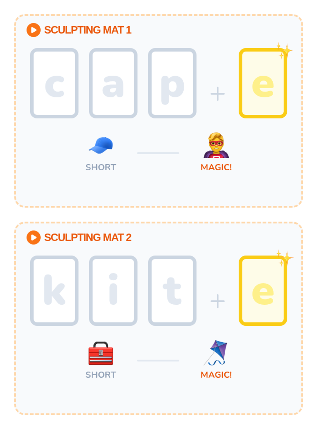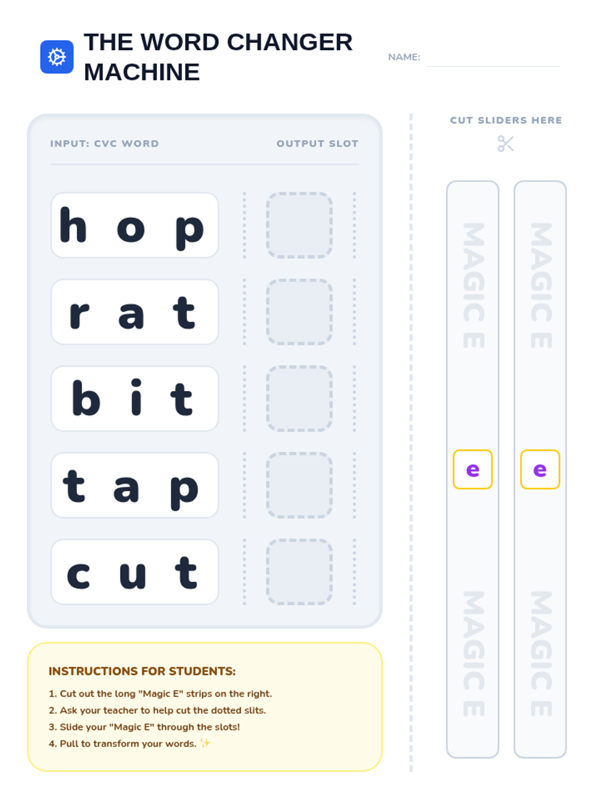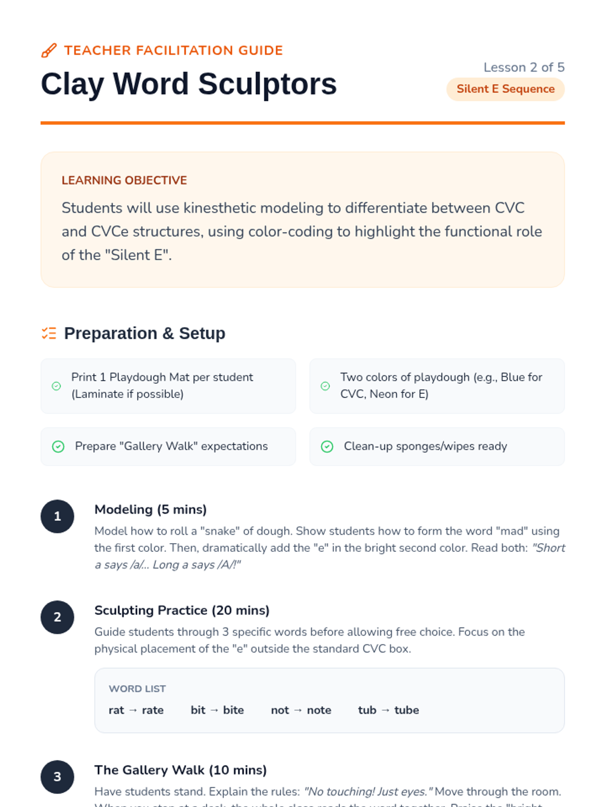 A hands-on kindergarten sequence focused on encoding and spelling CVCe words. Students use manipulatives like magnets, clay, and paper sliders to transform short vowel sounds into long vowel sounds by adding a 'silent e'.