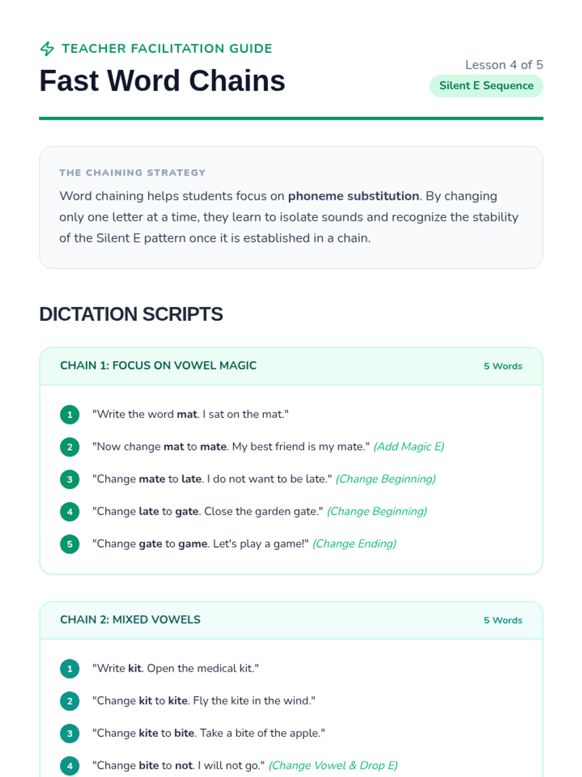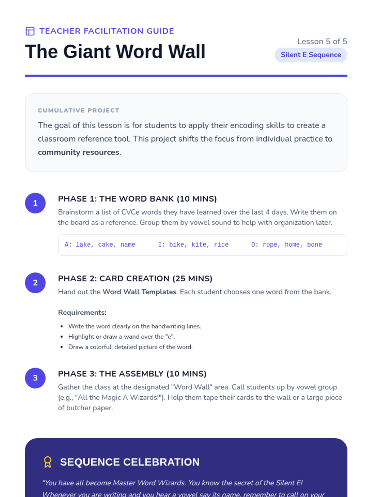 A Kindergarten phonics sequence introducing the Silent E (CVCe) syllable pattern through a 'Magic E' narrative. Students explore how the addition of a silent 'e' transforms vowel sounds from short to long through storytelling, hands-on manipulation, and writing.