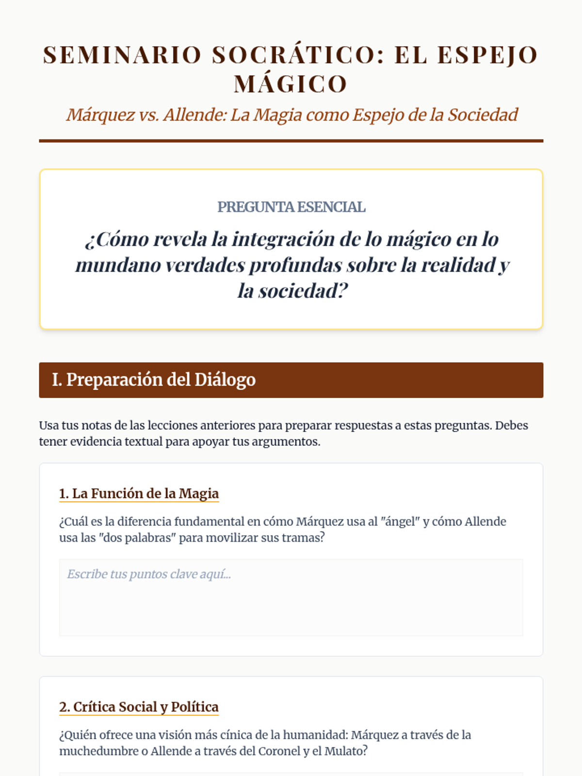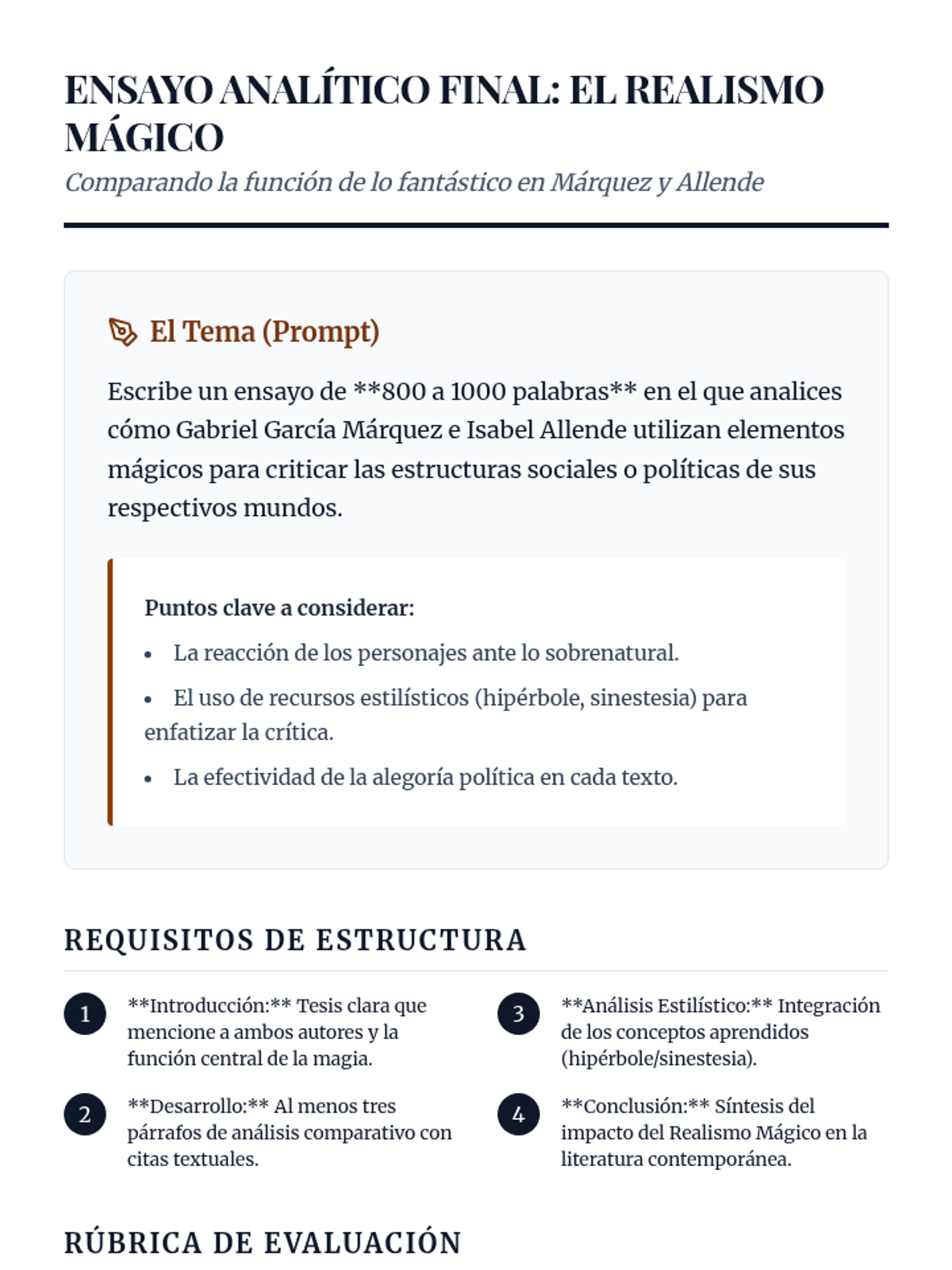 A comprehensive 12th-grade Advanced Spanish unit exploring Magical Realism through short fiction by Gabriel García Márquez and Isabel Allende, focusing on social critique, allegory, and stylistic devices.