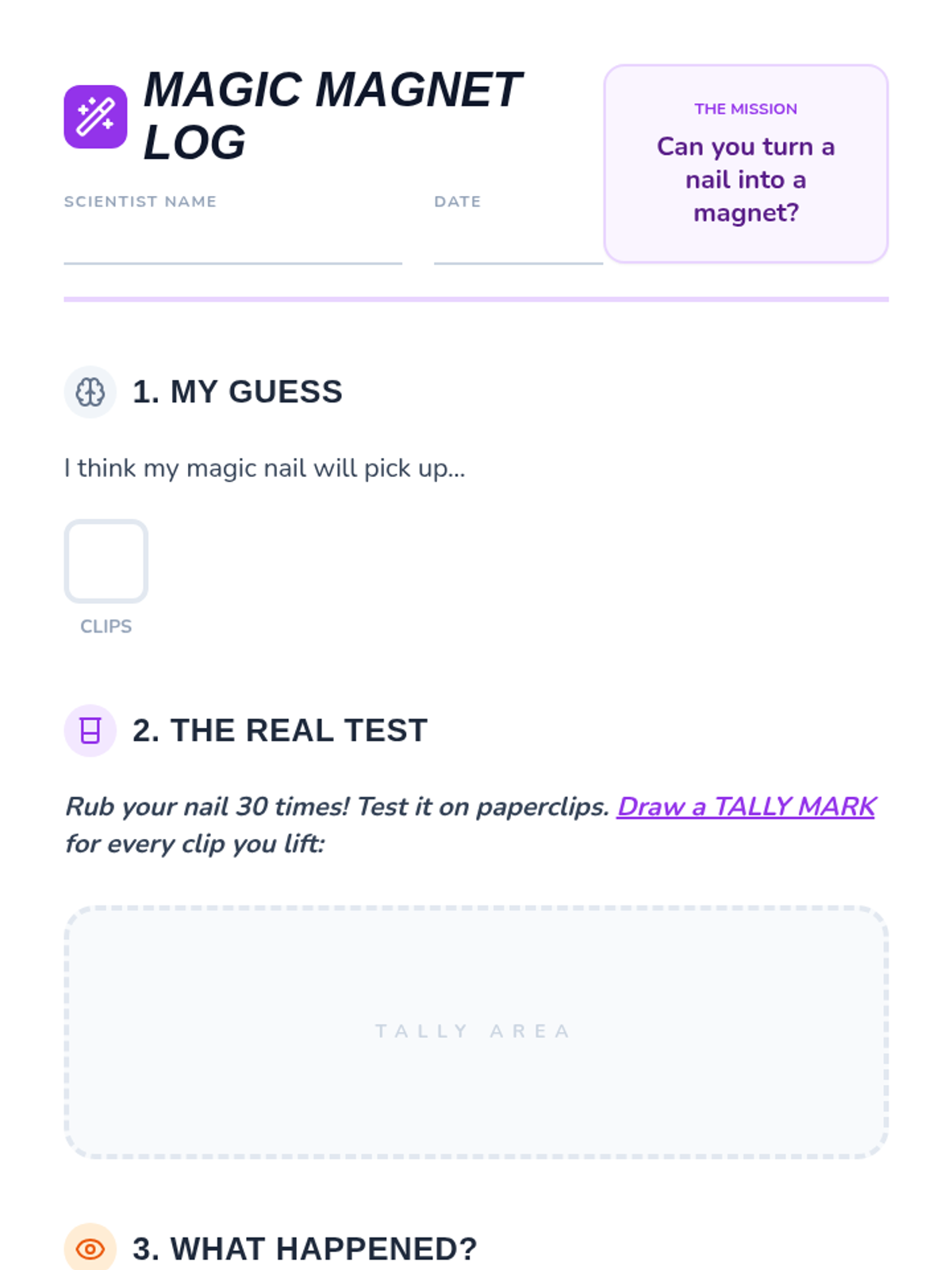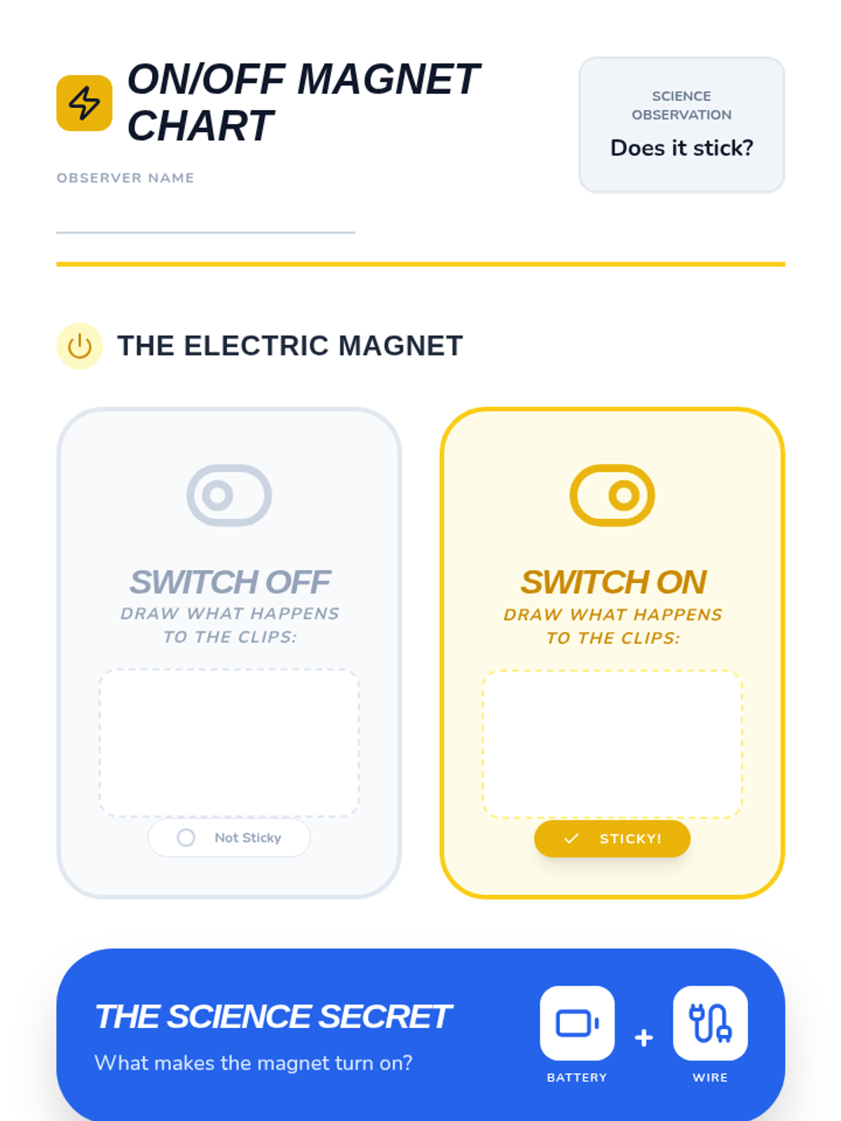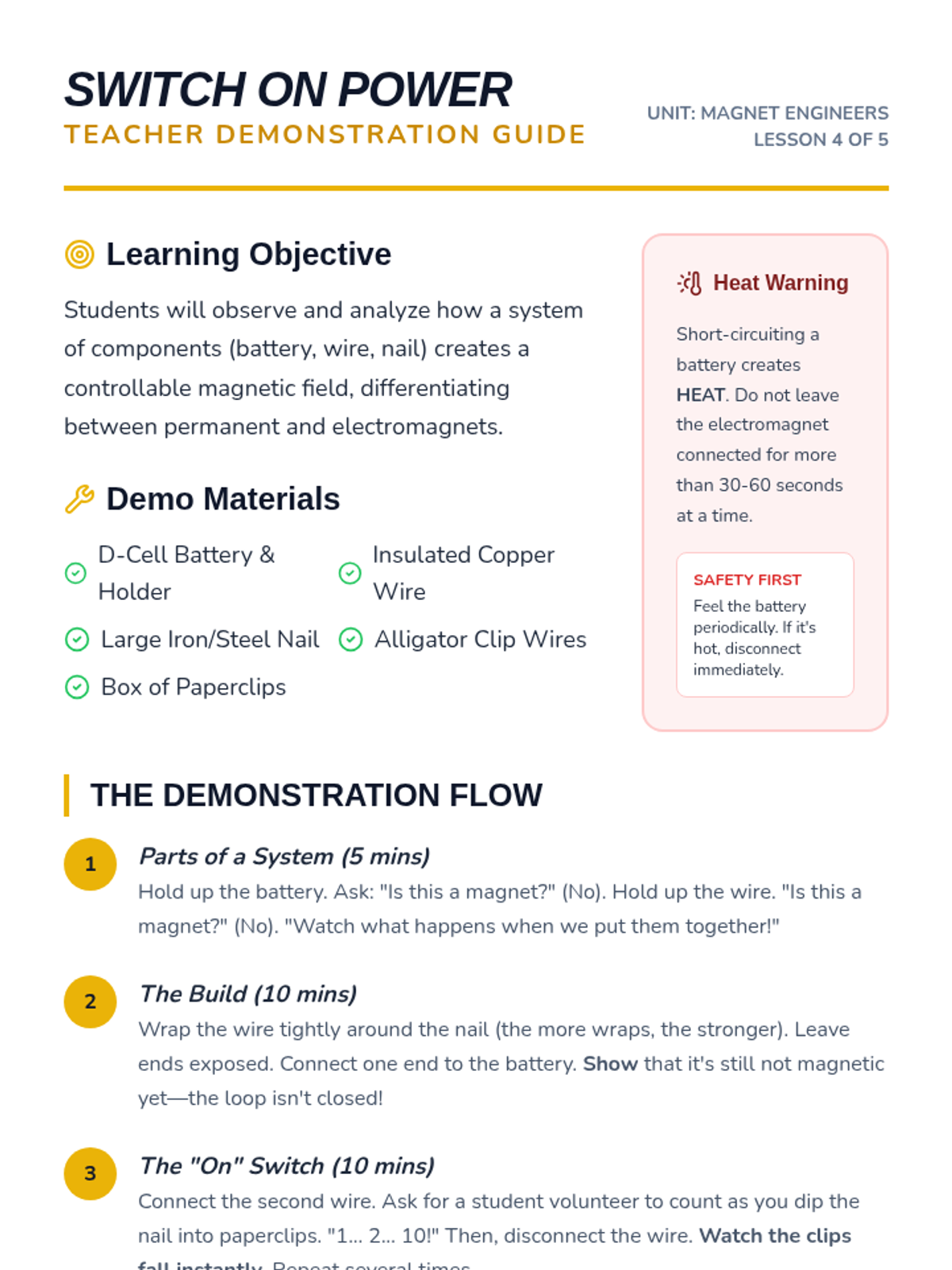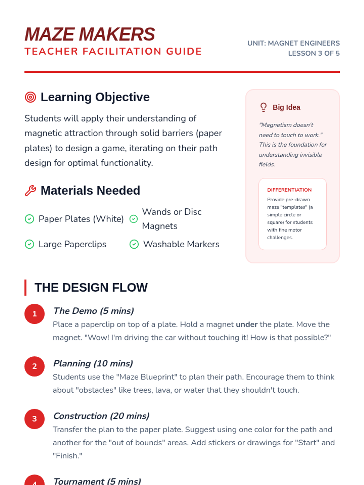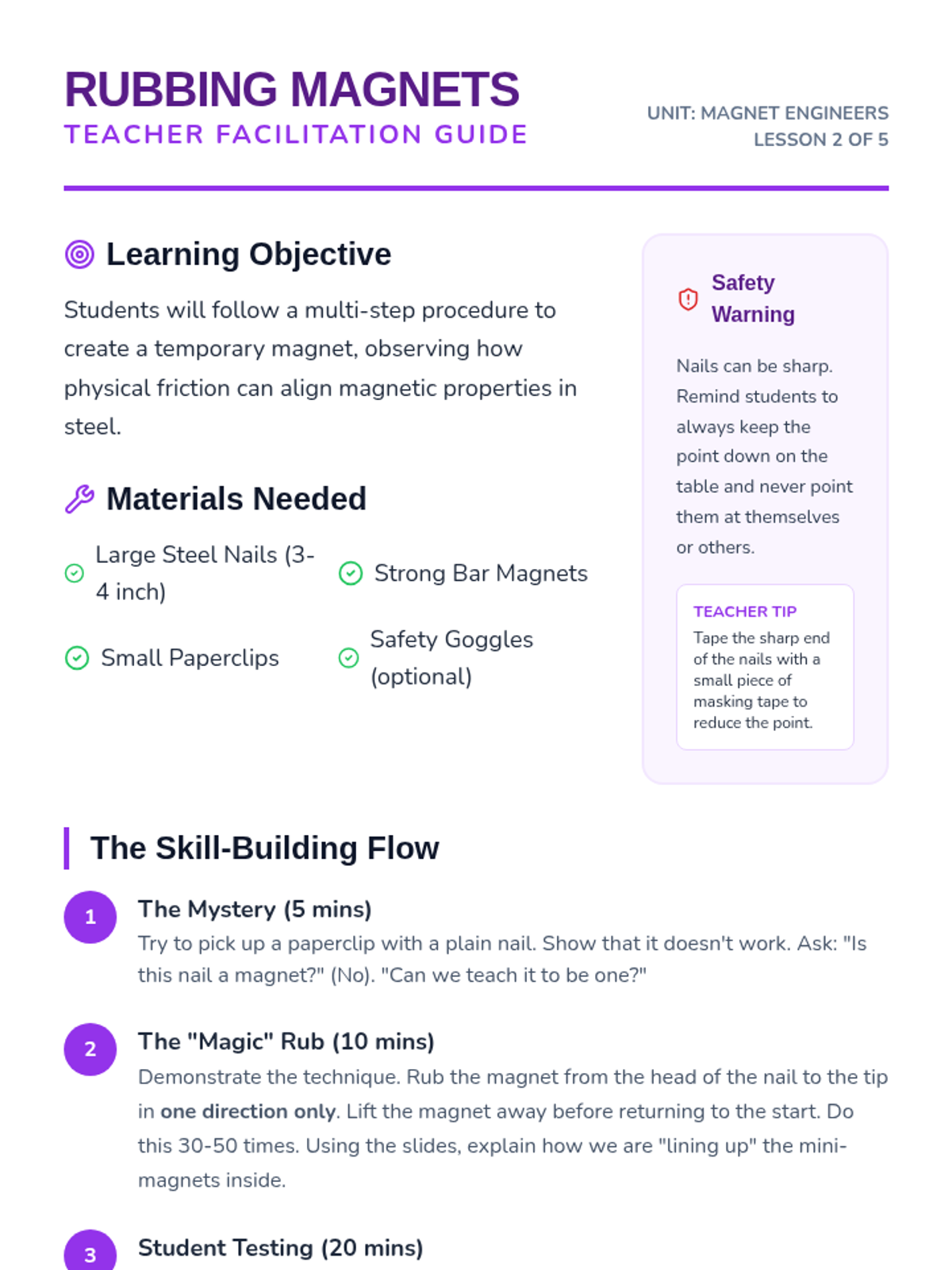 A Kindergarten science and engineering sequence that explores the properties of magnets through hands-on building challenges, temporary magnet creation, and artistic design. Students progress from basic construction to understanding how magnets can be 'made' and used to solve design problems.