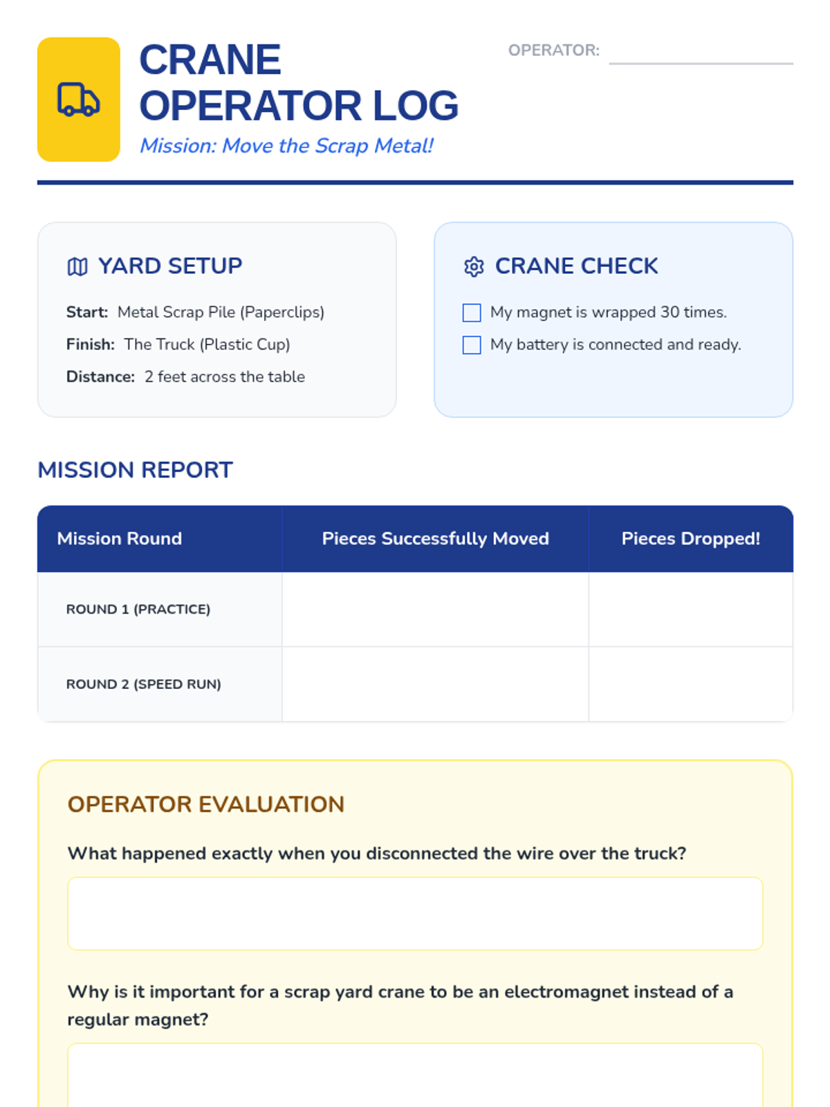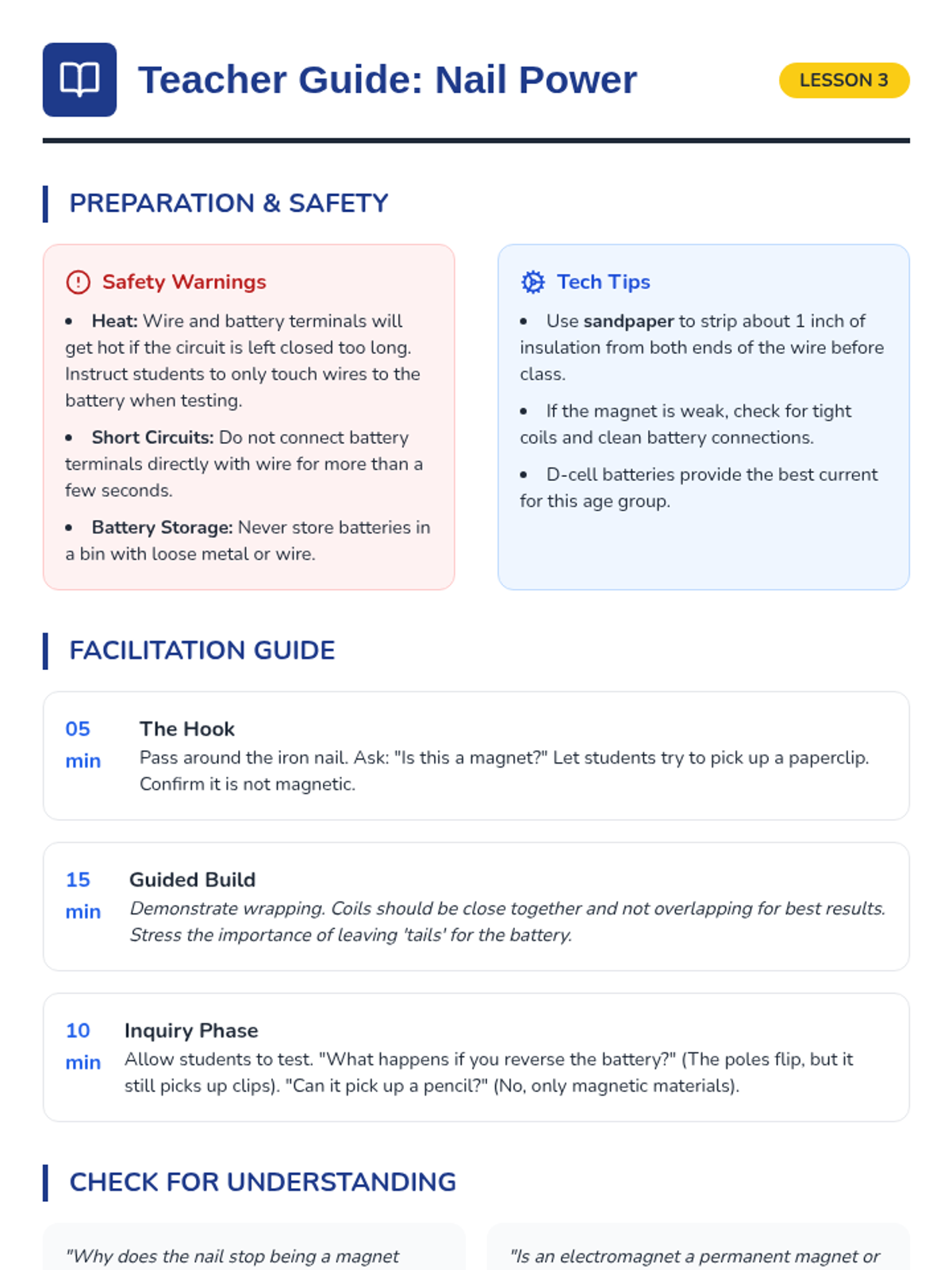 This sequence bridges the gap between electricity and magnetism by introducing simple electromagnets. Students discover that electricity can create a temporary magnetic field that can be turned on and off, contrasting with the permanent magnets they studied previously. The sequence builds from a simple circuit to constructing a functional electromagnet and simulating a scrap yard crane. By the end, students understand that magnetism can be controlled electronically.