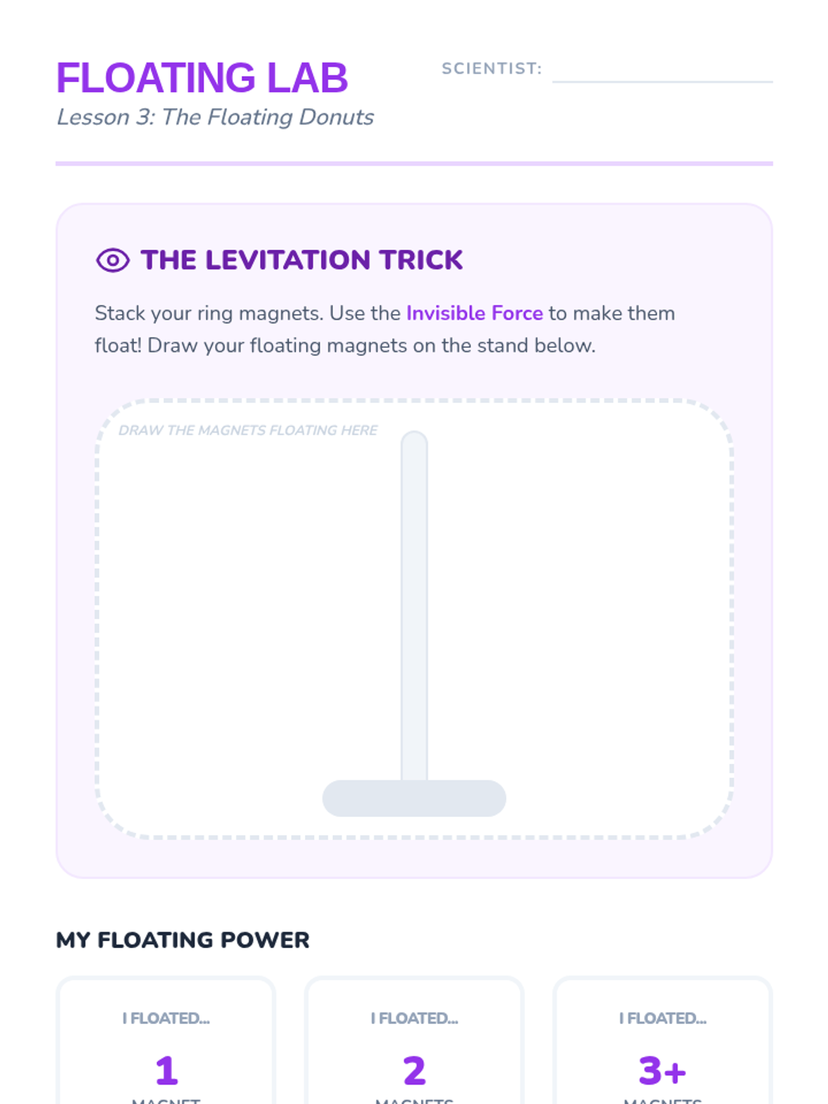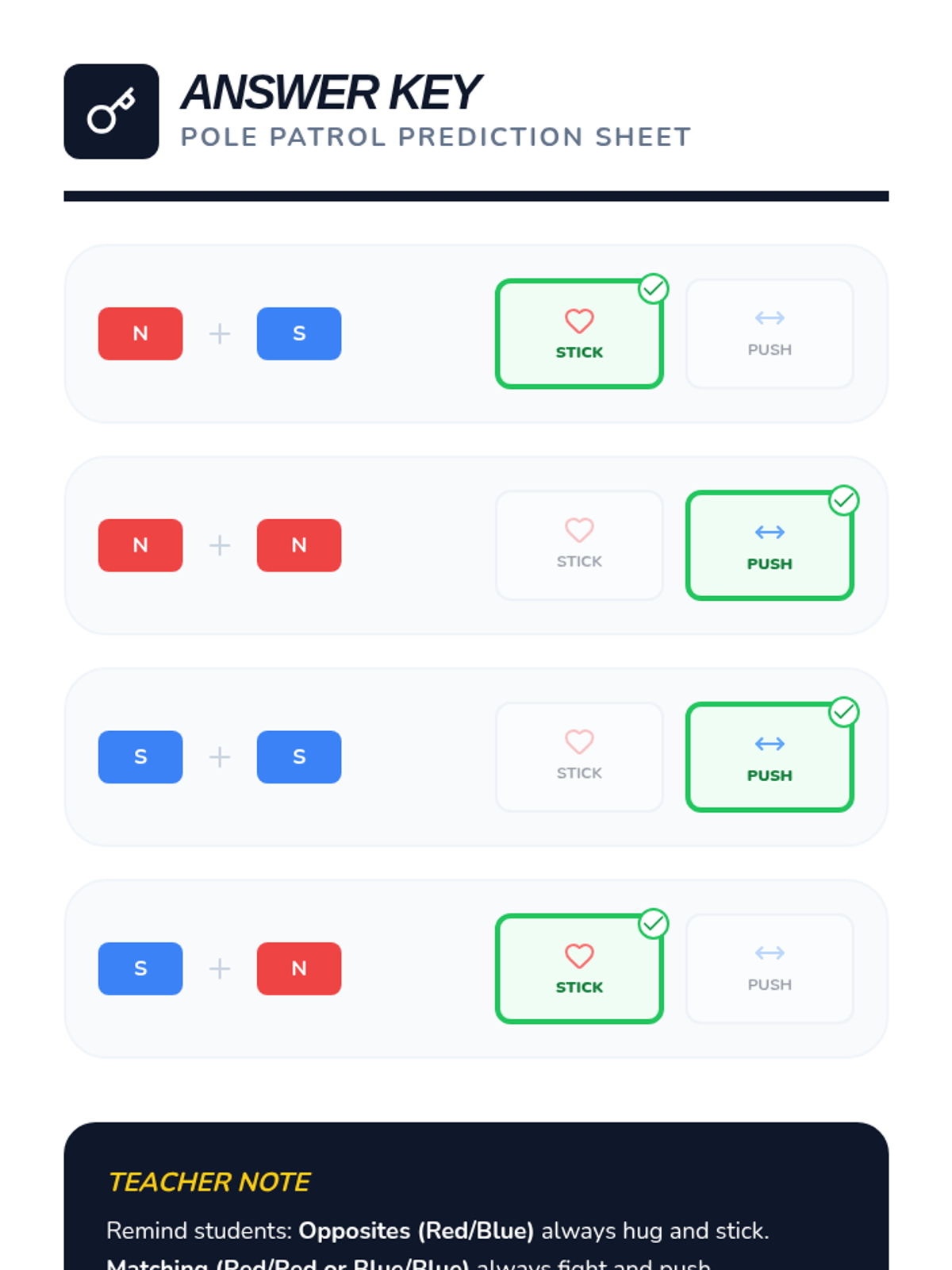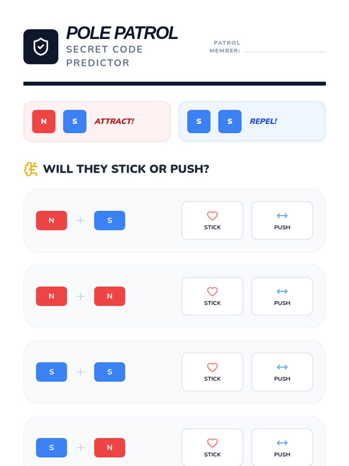 A kindergarten physics sequence exploring the invisible forces of magnetism, polarity, and how magnets can move objects without physical contact. Students engage in tactile, game-based learning to master the concepts of attract and repel.