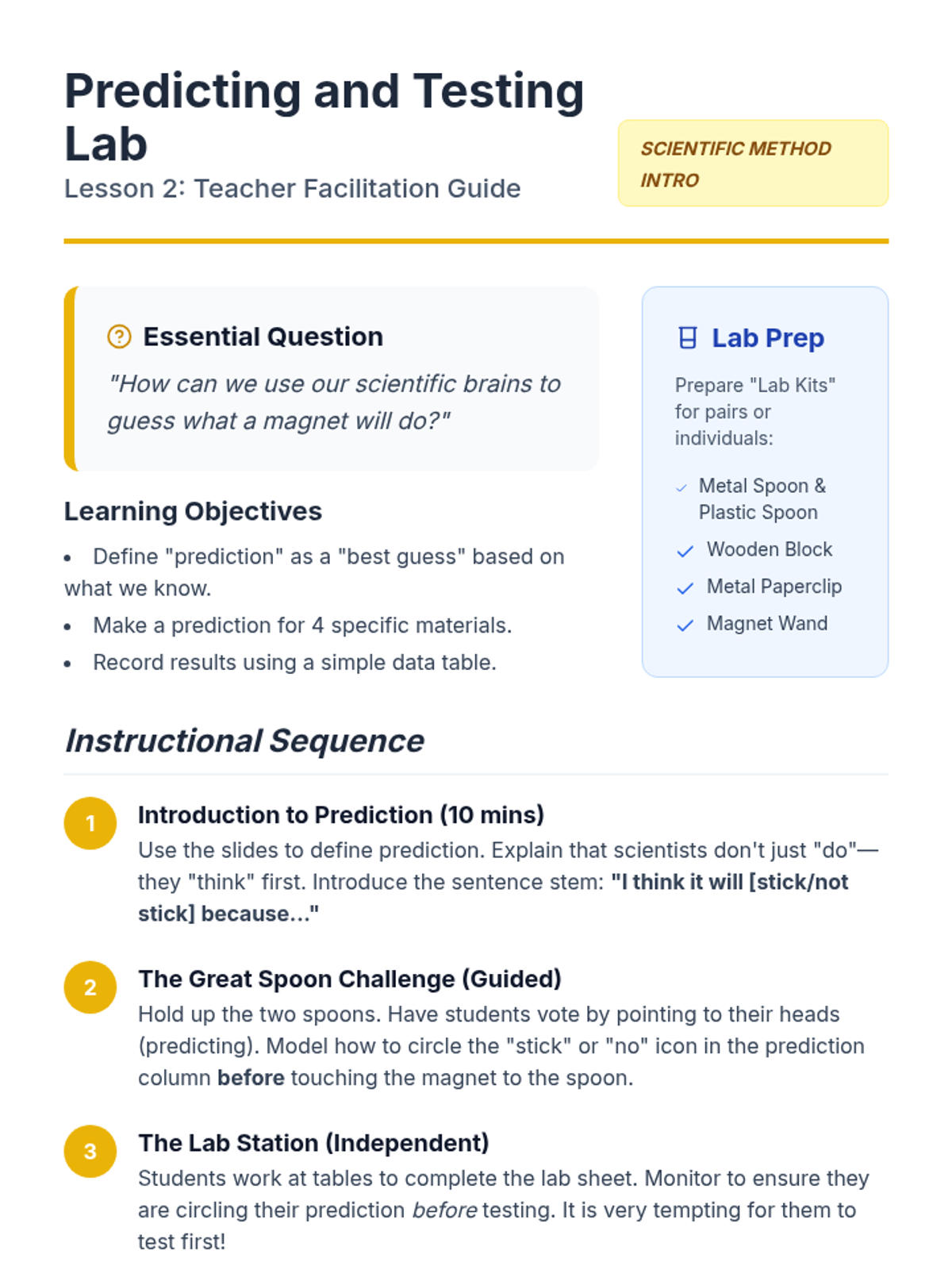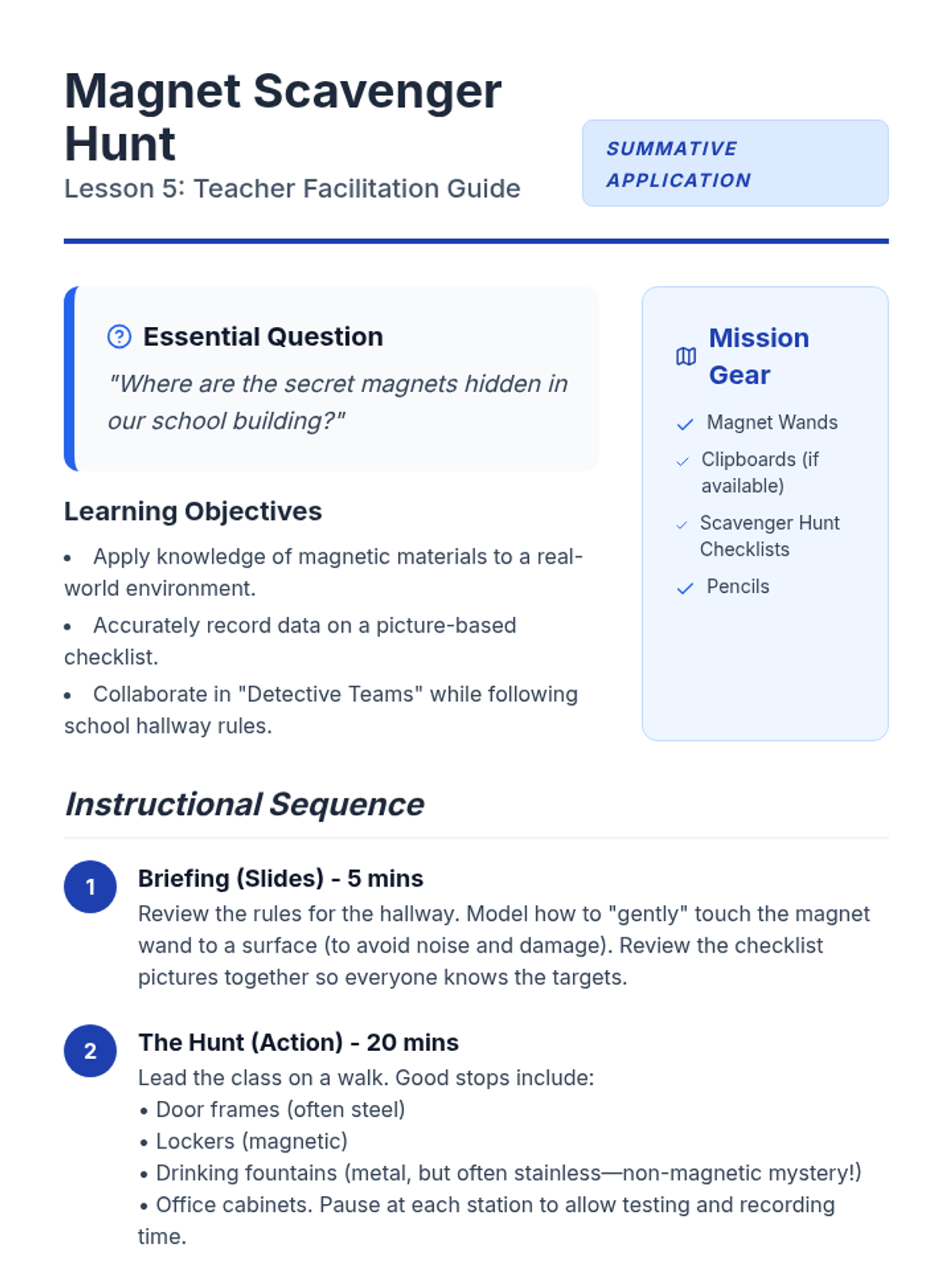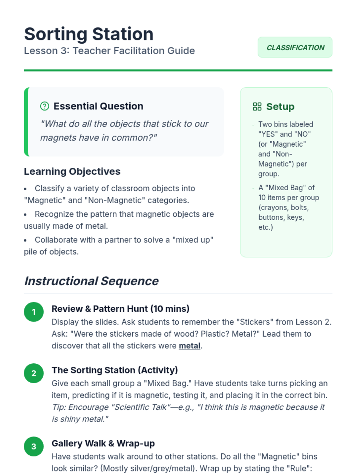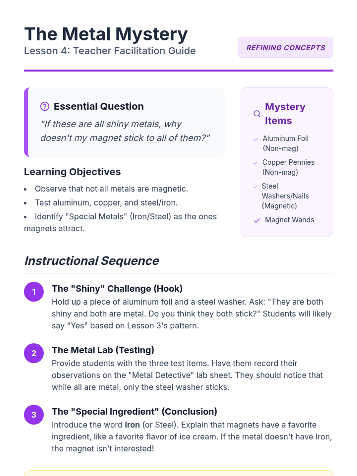 A Kindergarten sequence introducing the fundamentals of magnetism through hands-on exploration, prediction, and classification. Students progress from open discovery to understanding that magnets attract specific metals like iron and steel.