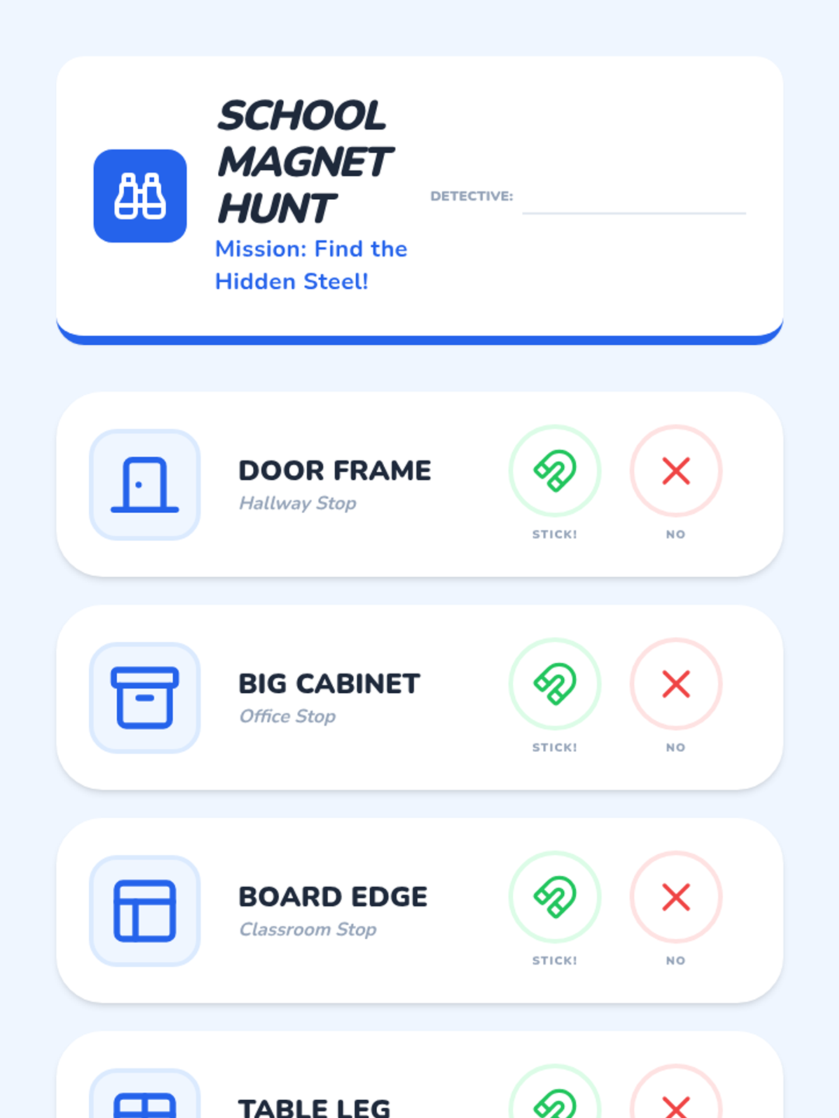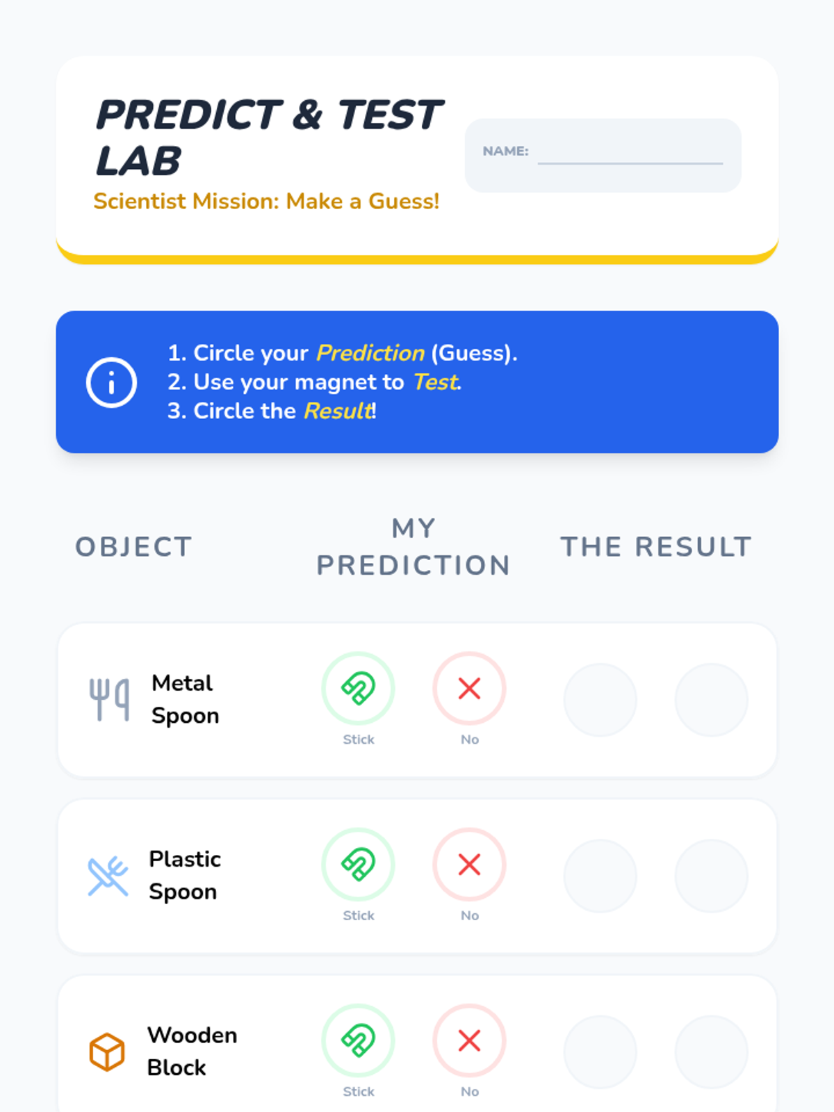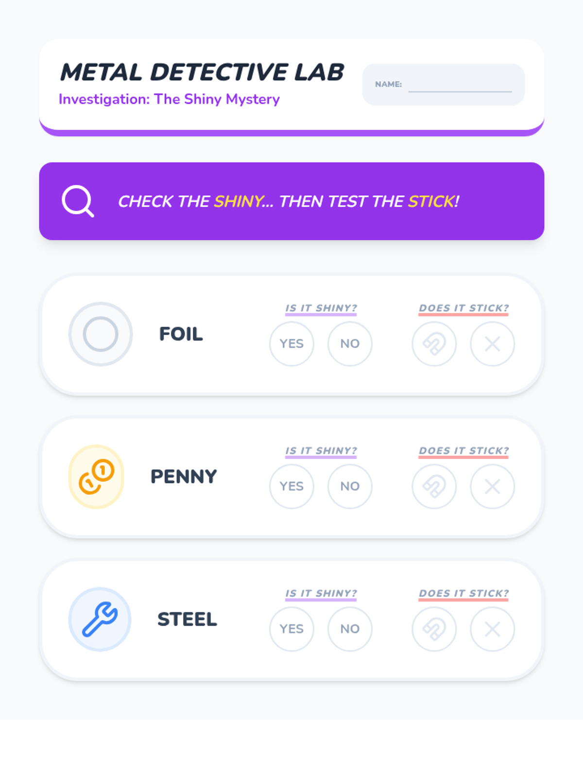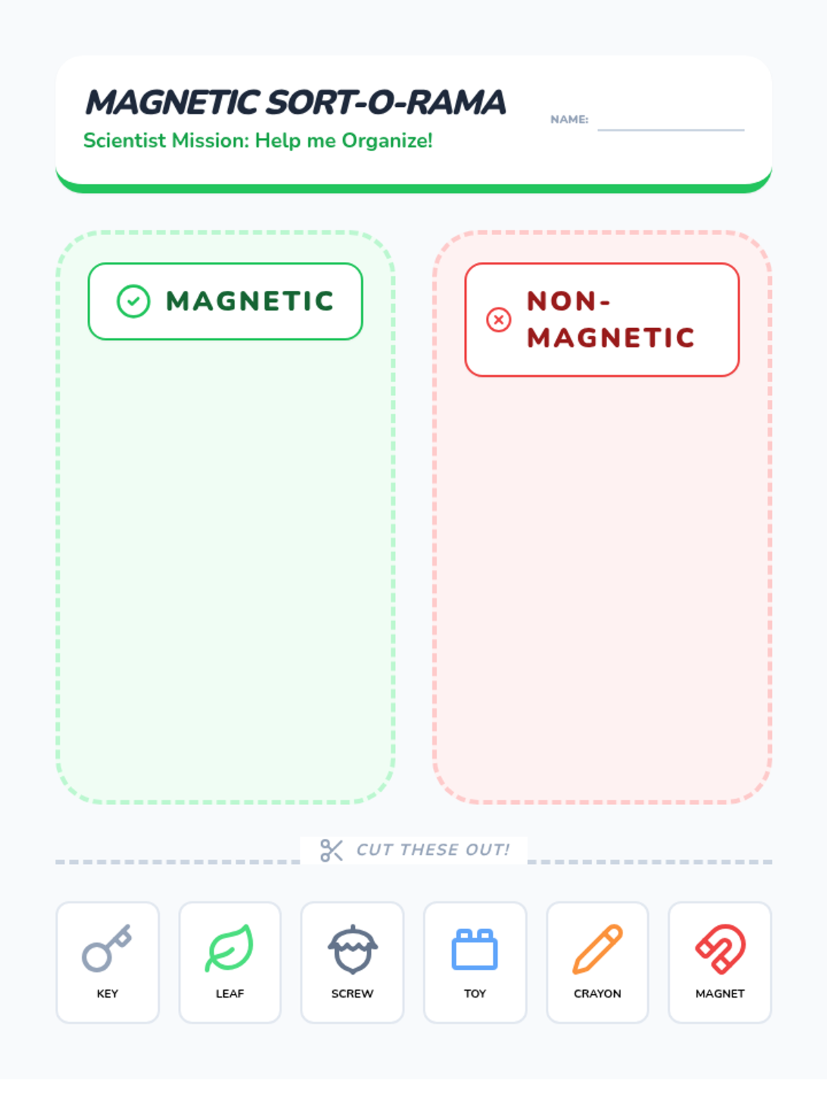A Kindergarten sequence introducing the fundamentals of magnetism through hands-on exploration, prediction, and classification. Students progress from open discovery to understanding that magnets attract specific metals like iron and steel.