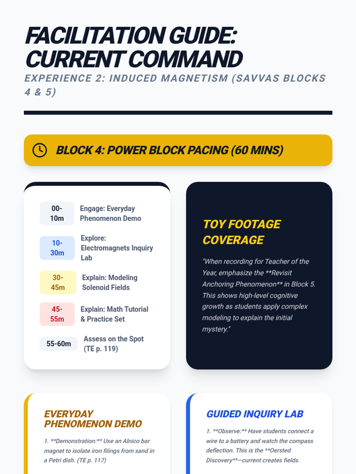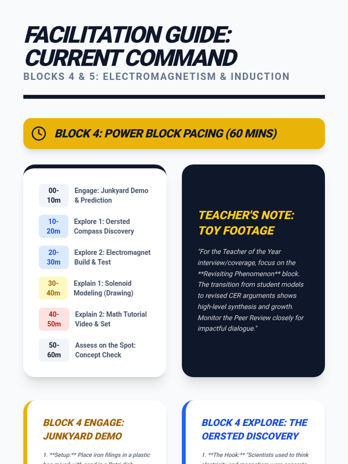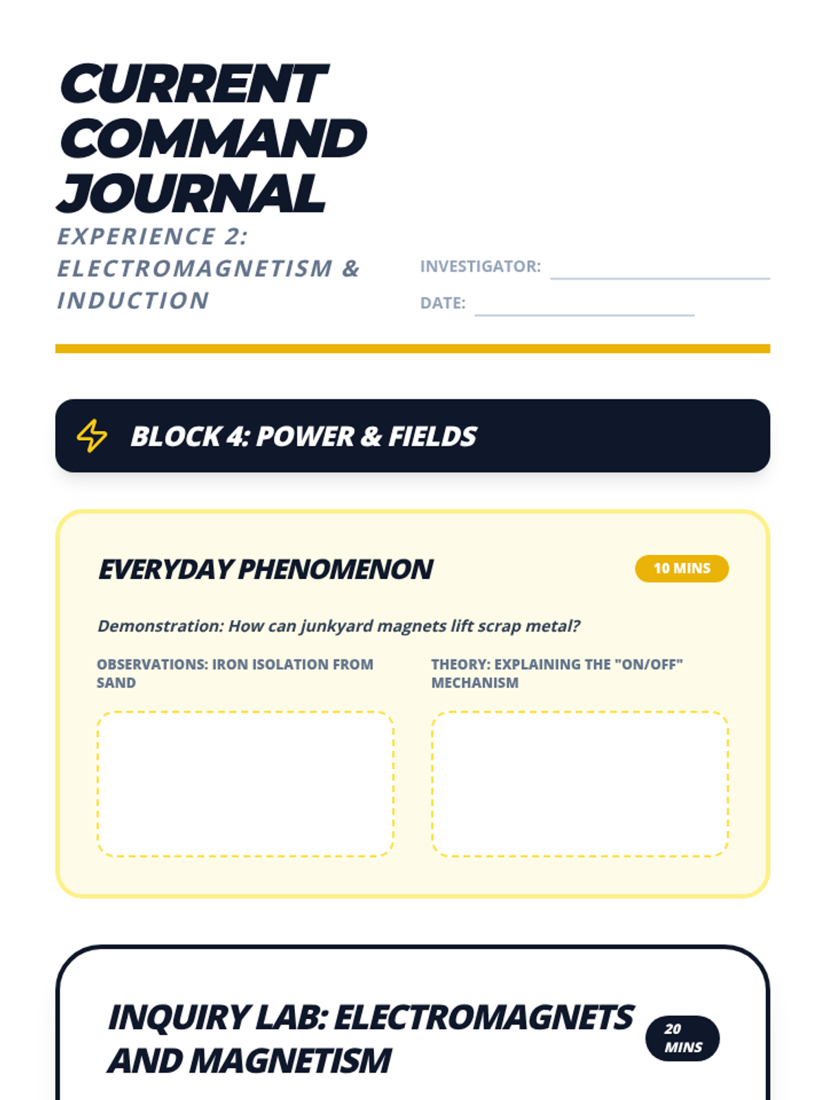A 5-day intensive exploration of magnetic forces and fields, focusing on atomic-level causes, field interactions, and mathematical modeling of forces on charged particles. Students progress from anchoring phenomena to complex mathematical applications and a comprehensive unit review.