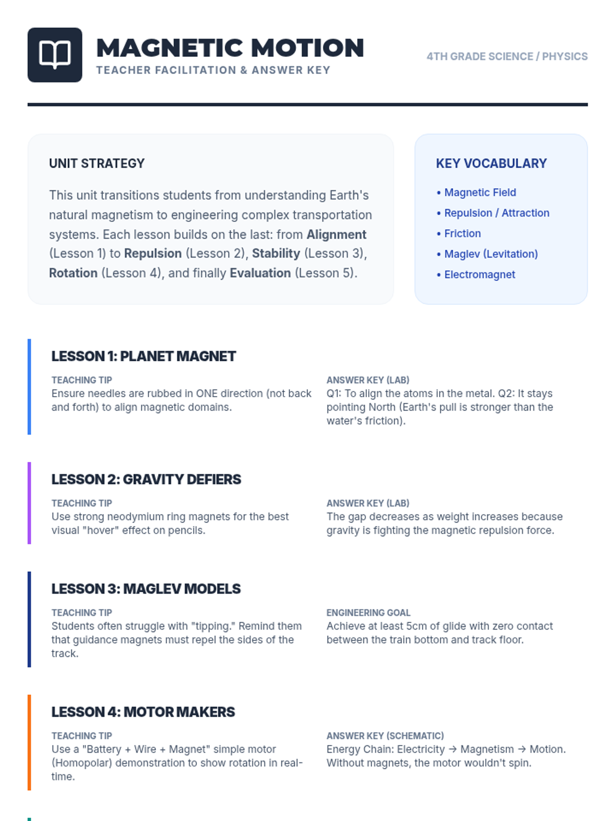 This sequence explores the practical applications of magnetism in transportation and navigation. Students investigate Earth's magnetic field, the mechanics of magnetic levitation (Maglev), the function of magnetic motors, and the trade-offs of implementing high-tech magnetic infrastructure.