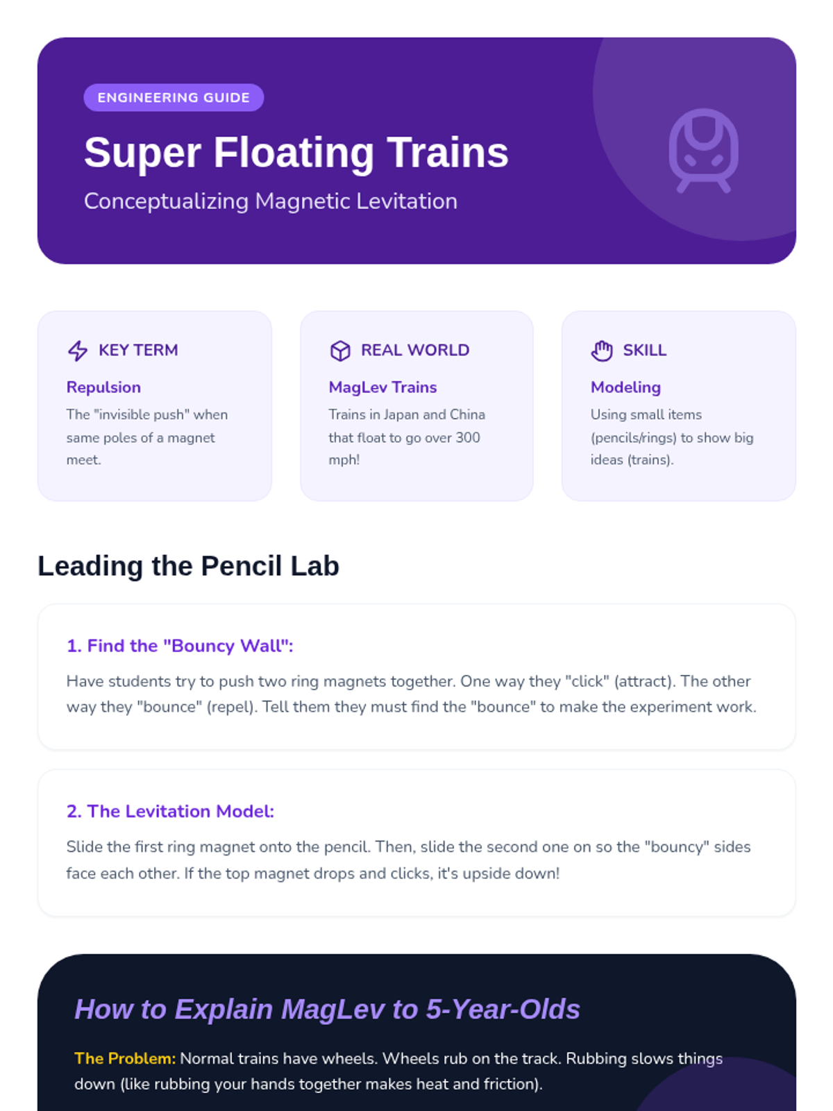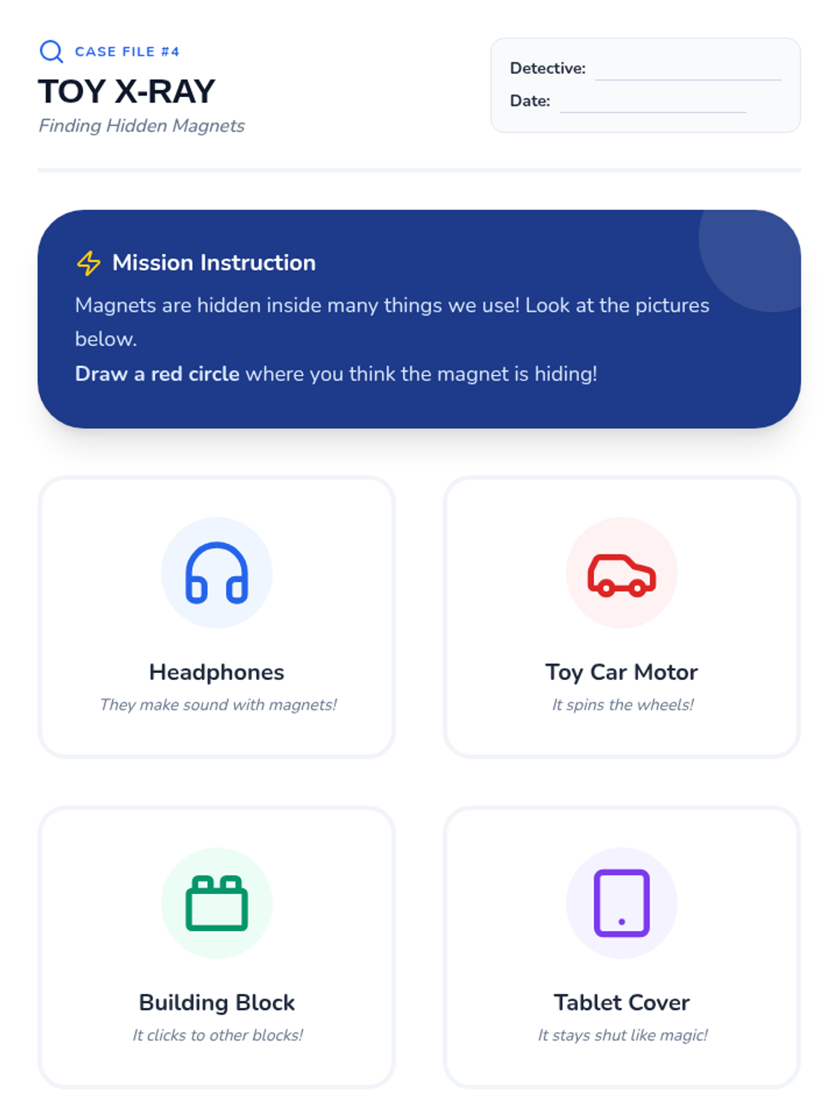 A Kindergarten science sequence exploring the practical uses of magnets in daily life, from kitchen gadgets to high-speed trains and navigation. Students learn through hands-on inquiry, case studies, and safety workshops to understand that magnetism is a foundational part of modern technology.