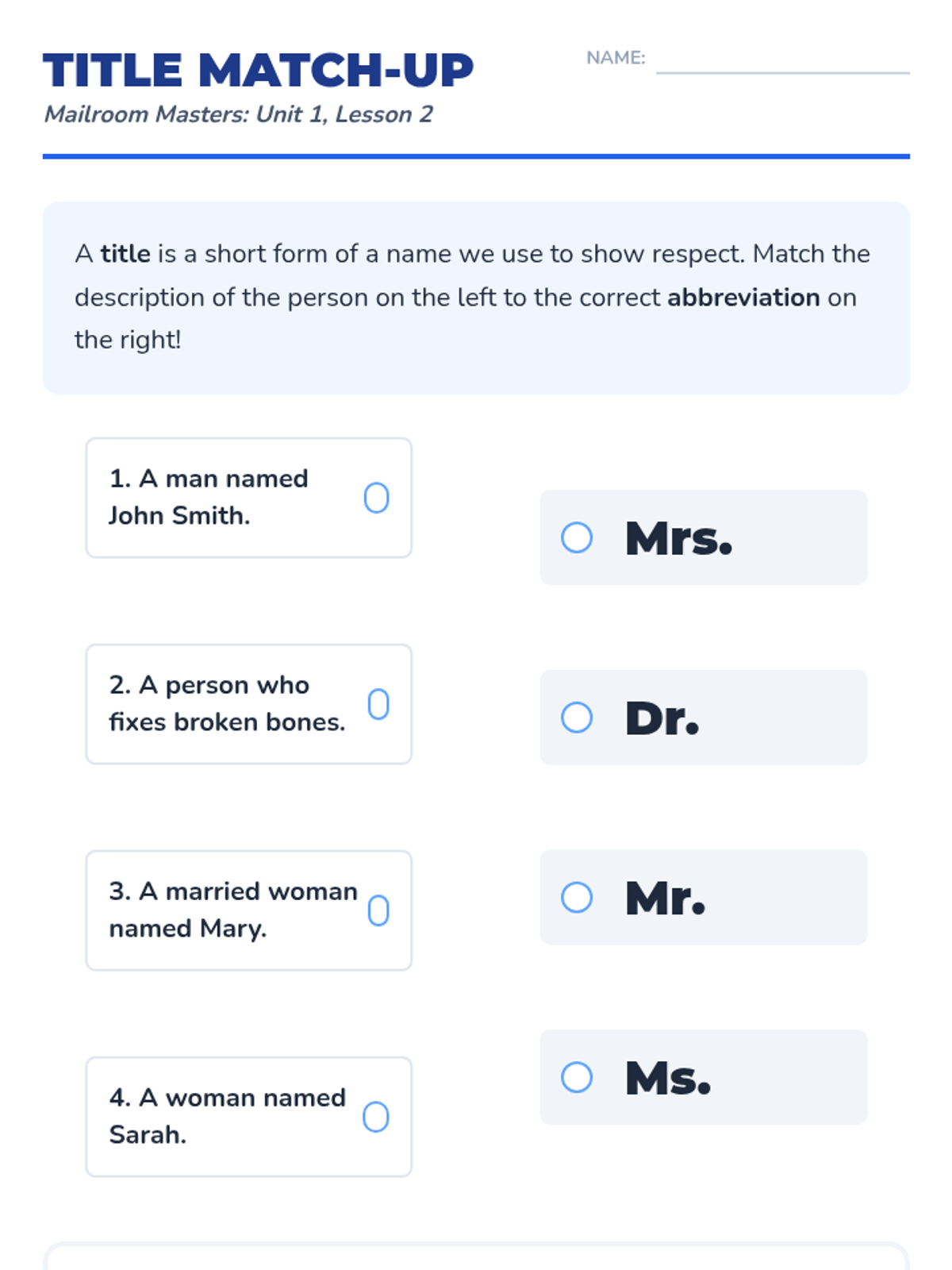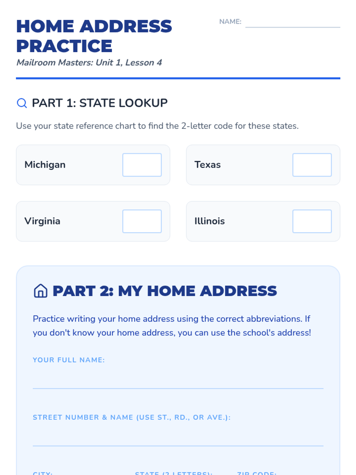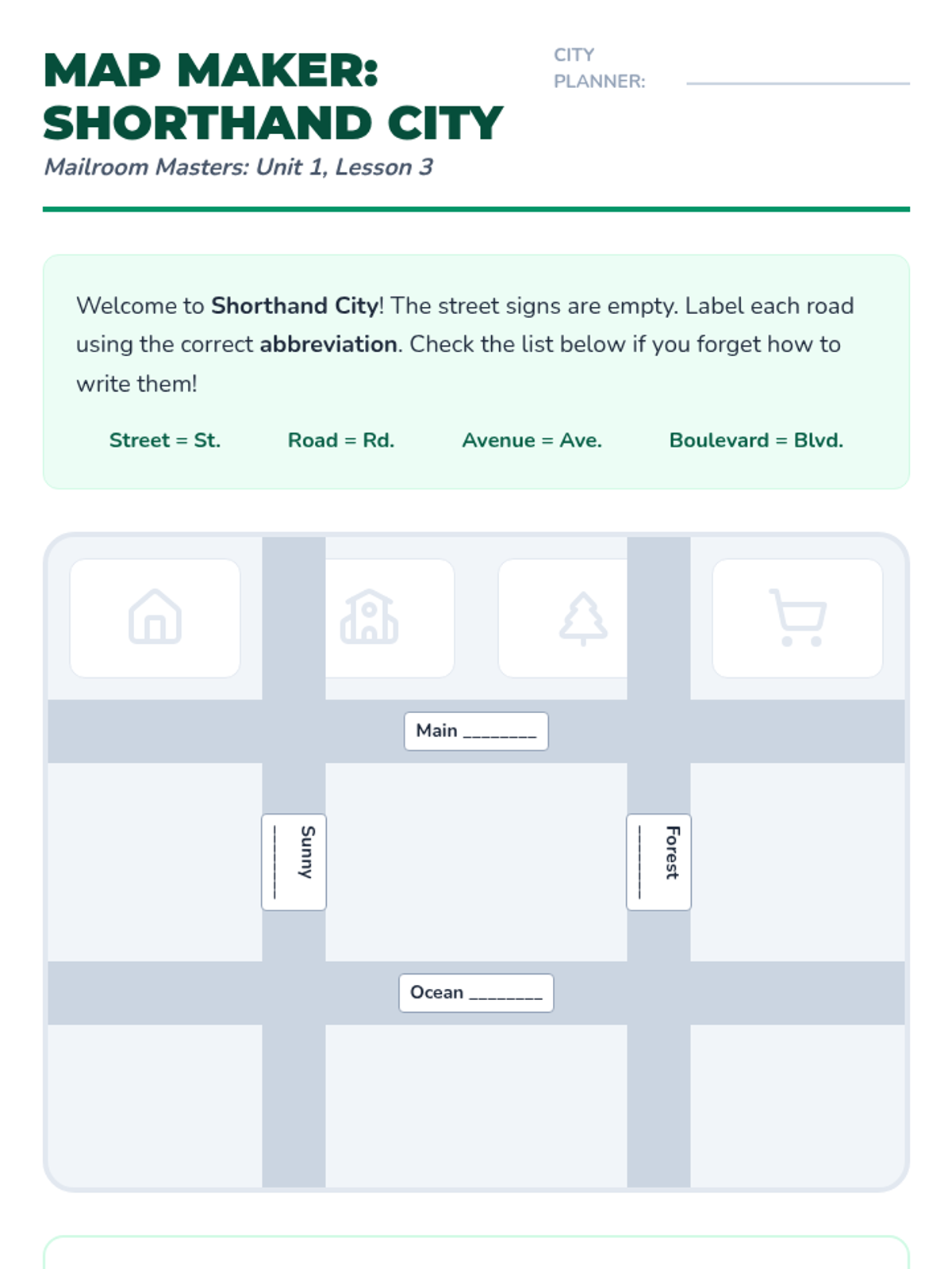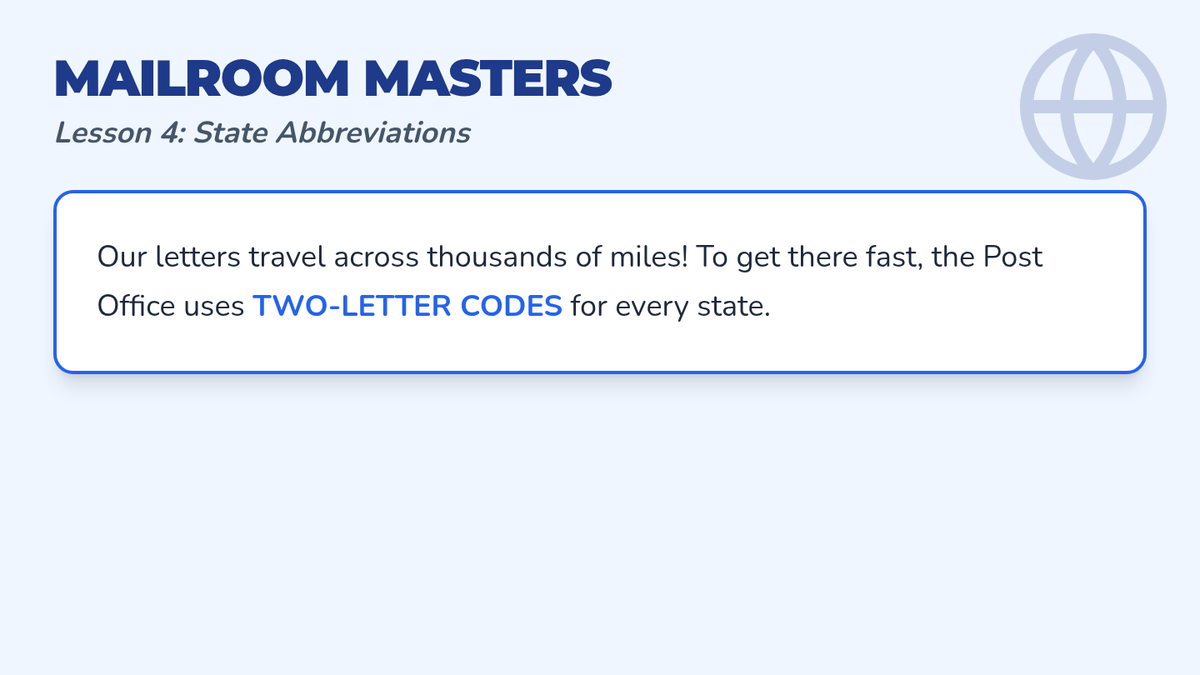 A 2nd-grade grammar sequence focusing on abbreviations in the context of writing and addressing mail. Students learn titles, street names, and state codes through a project-based simulation of a classroom post office.