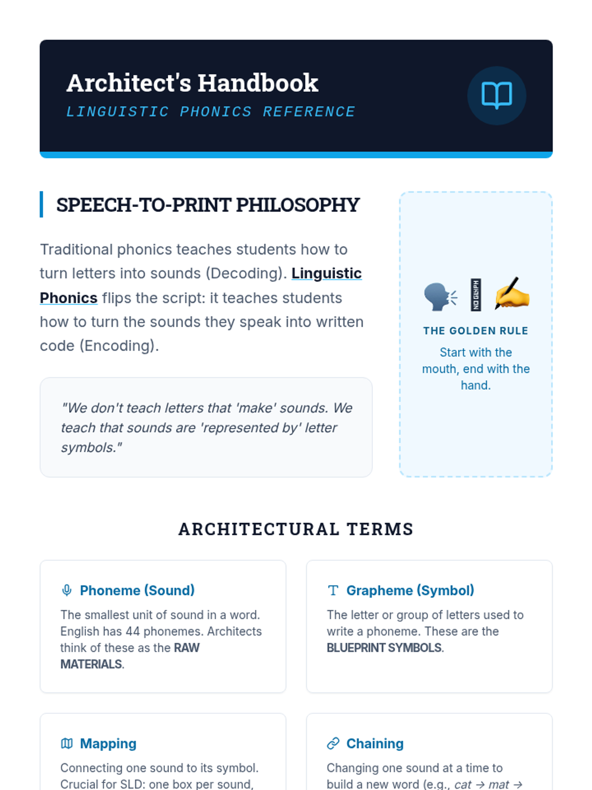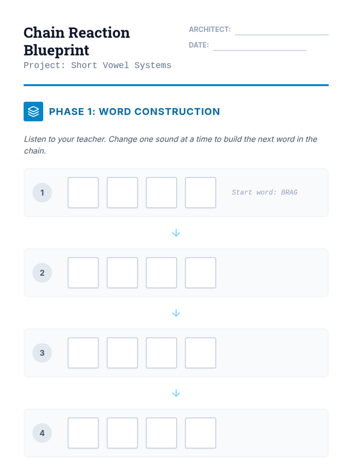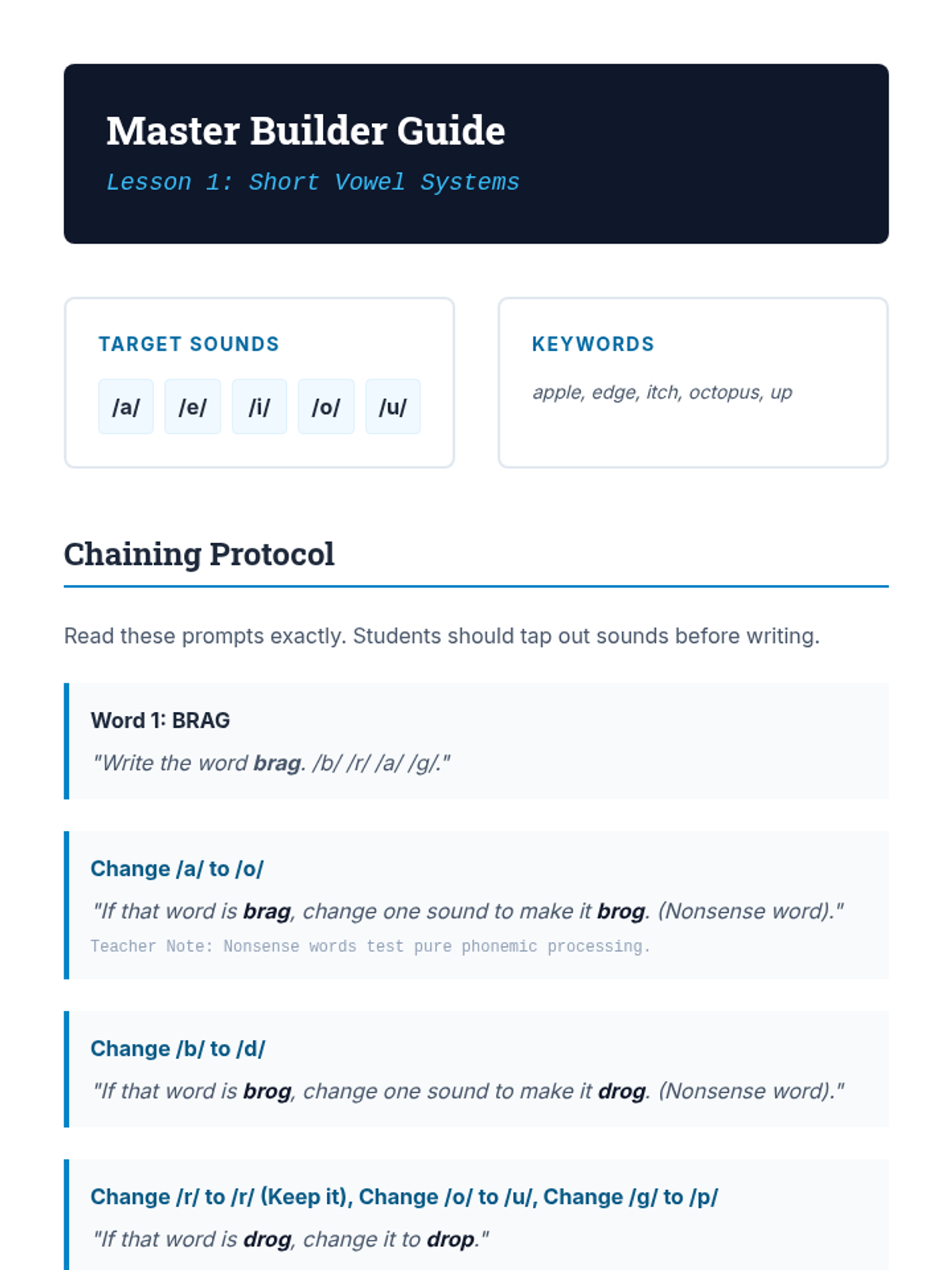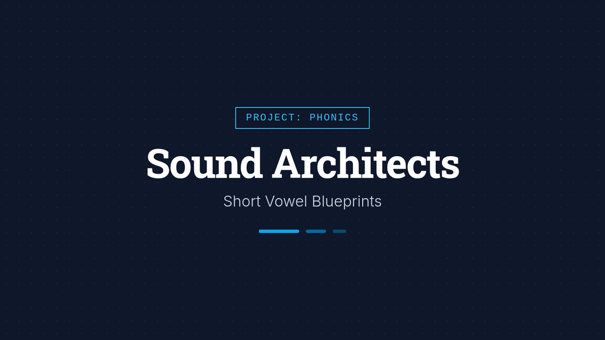 A comprehensive linguistic phonics sequence for older students (Grades 3-8) with learning disabilities, focusing on the 15 primary vowel sounds and vowel-r combinations through a 'Sound Architect' blueprint theme. Each lesson uses speech-to-print methods, word chaining, and connected text to build spelling mastery.