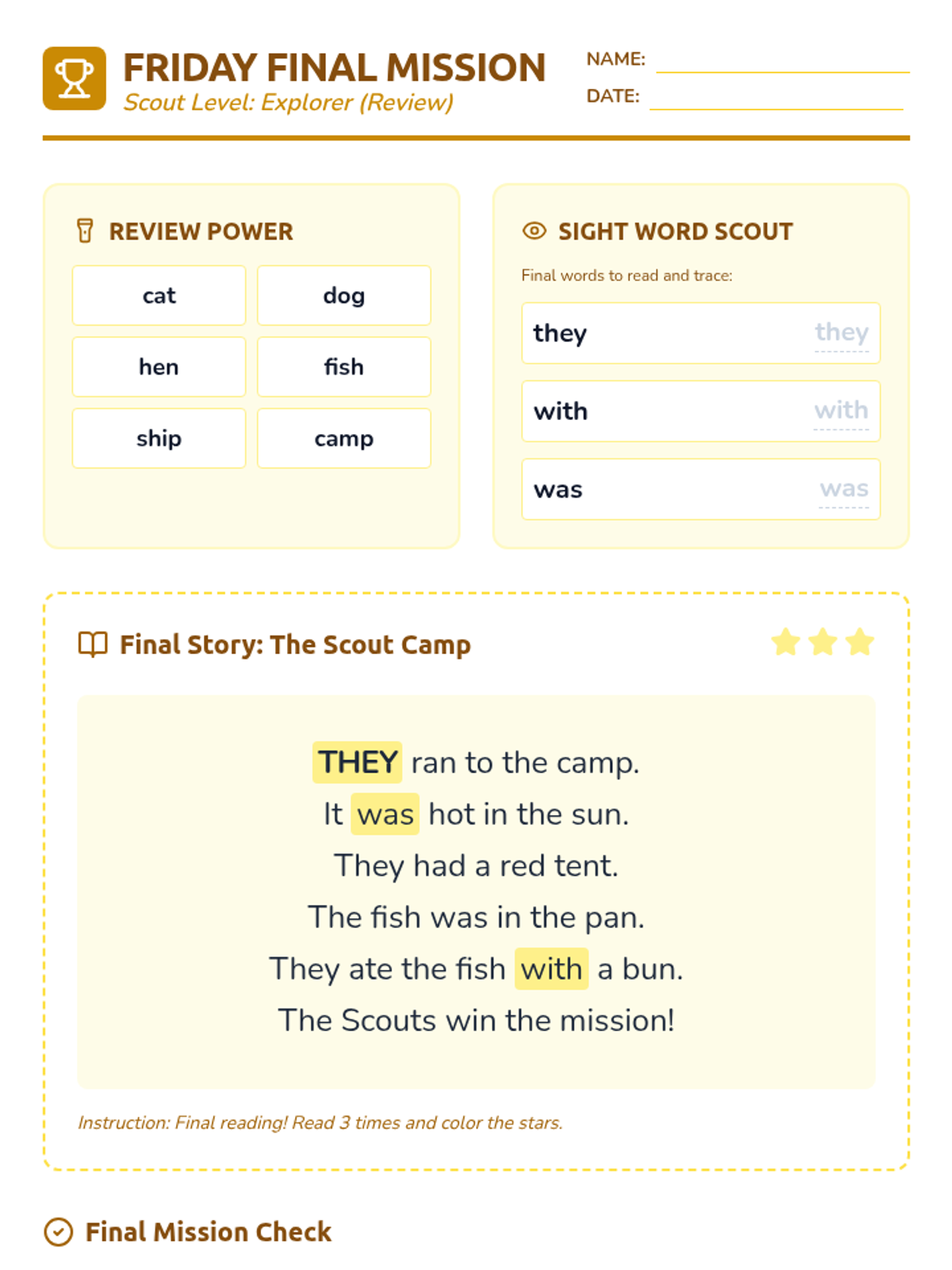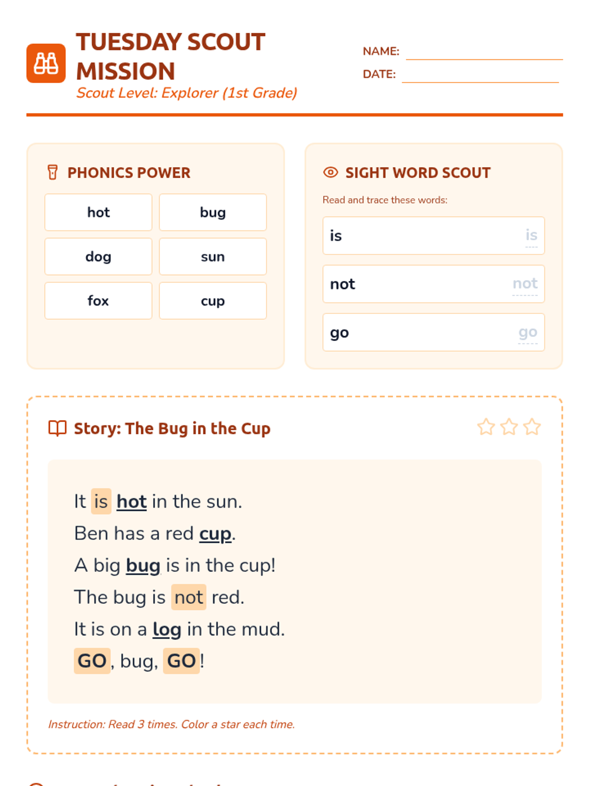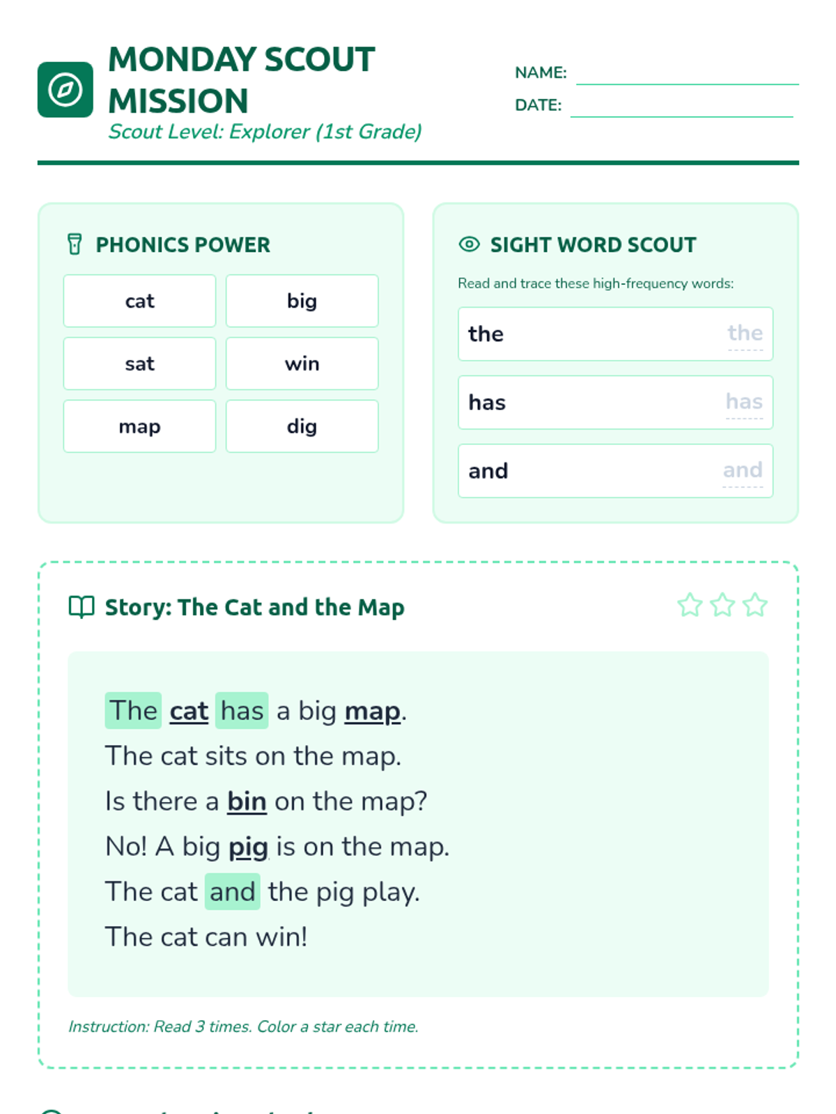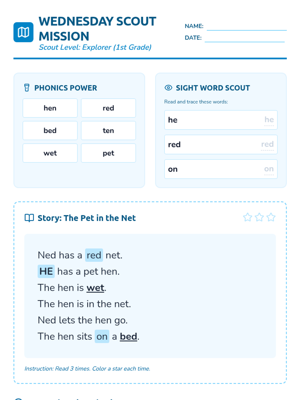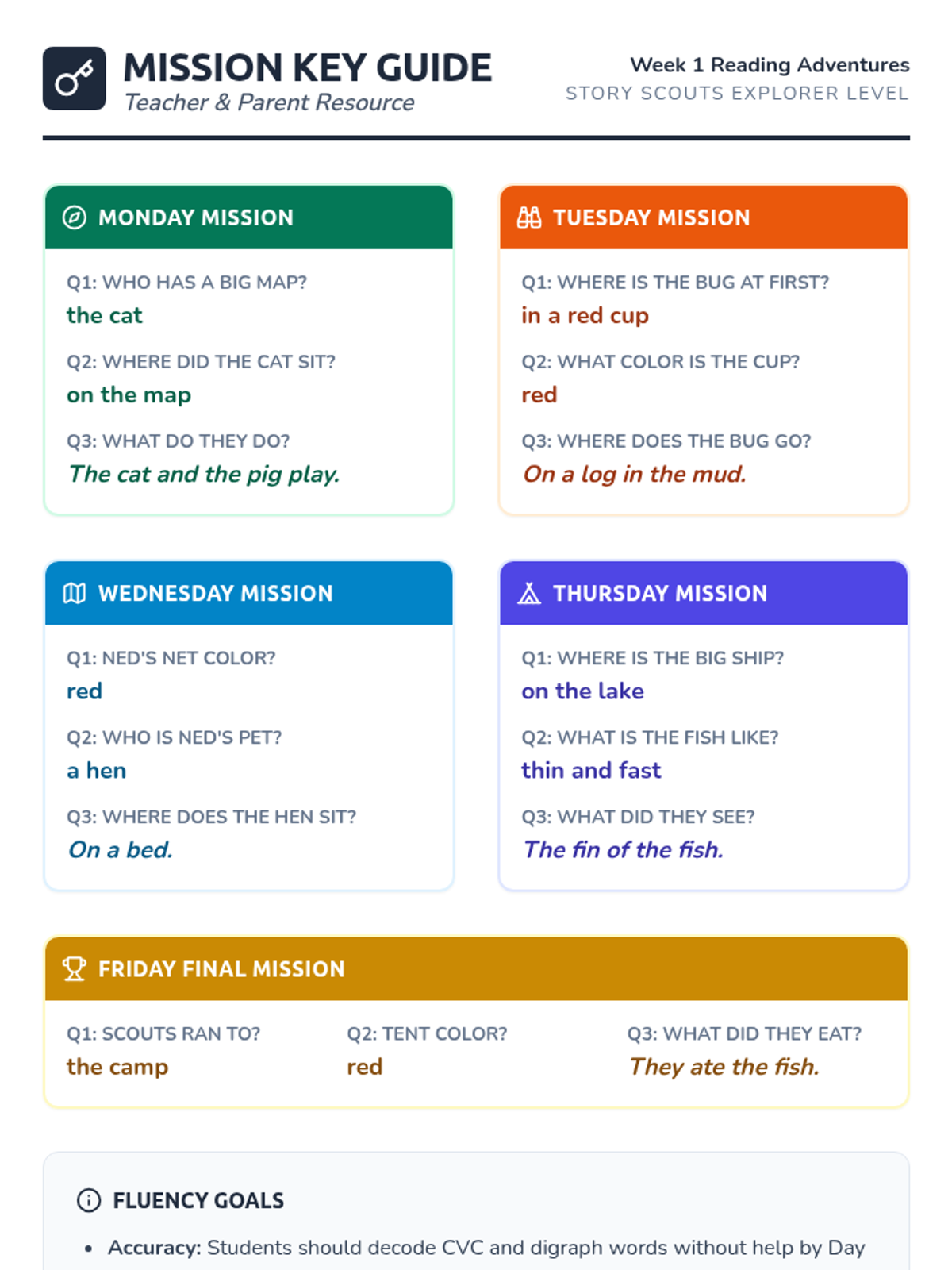 A week-long homework packet for third-grade English Learners reading at a first-grade level, focusing on phonics, fluency, and basic comprehension through a "Story Scouts" adventure theme.