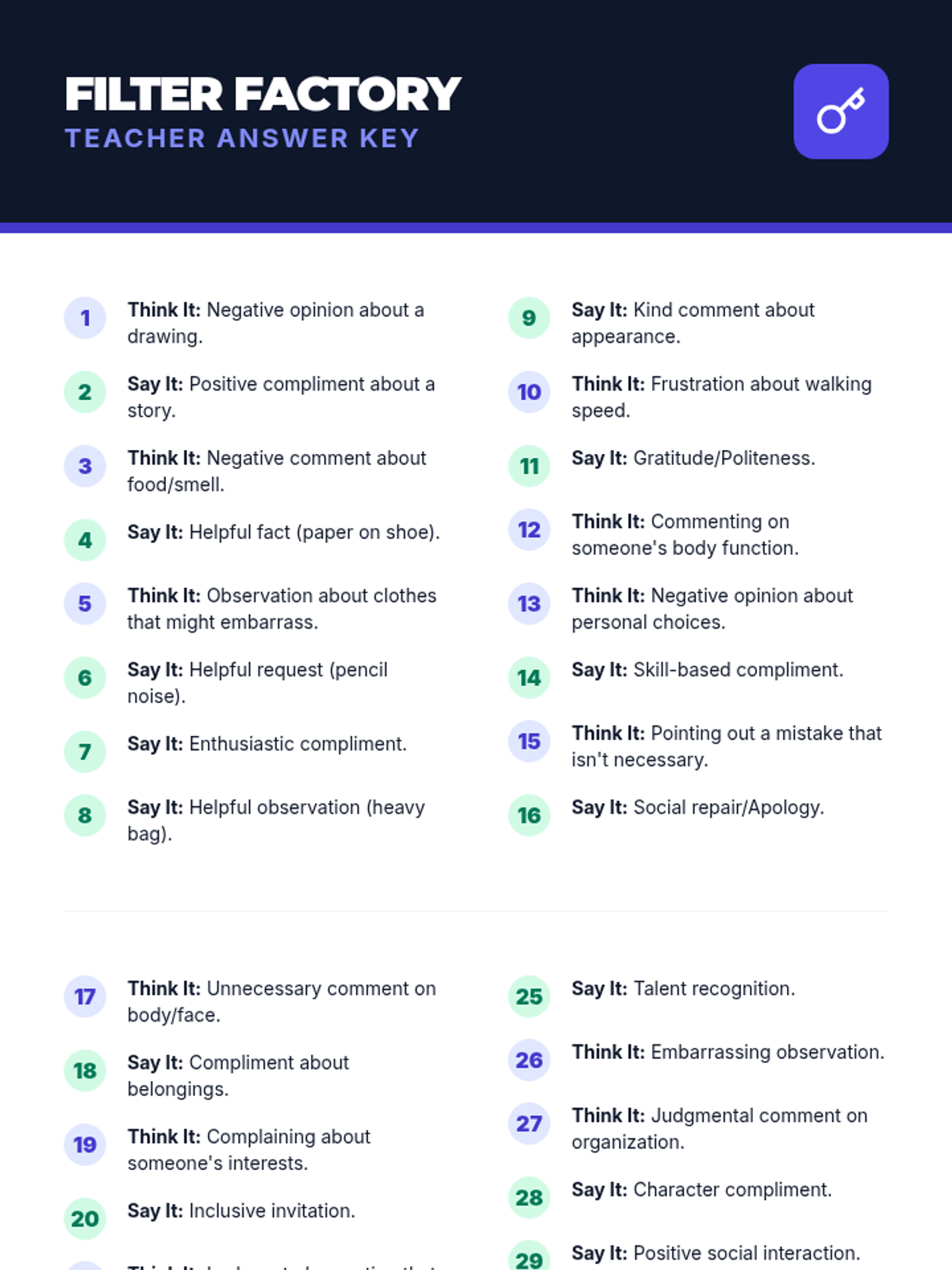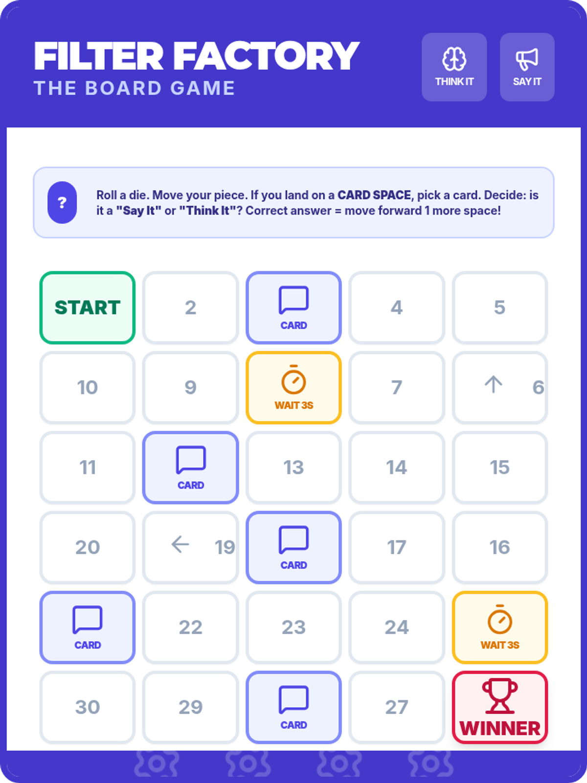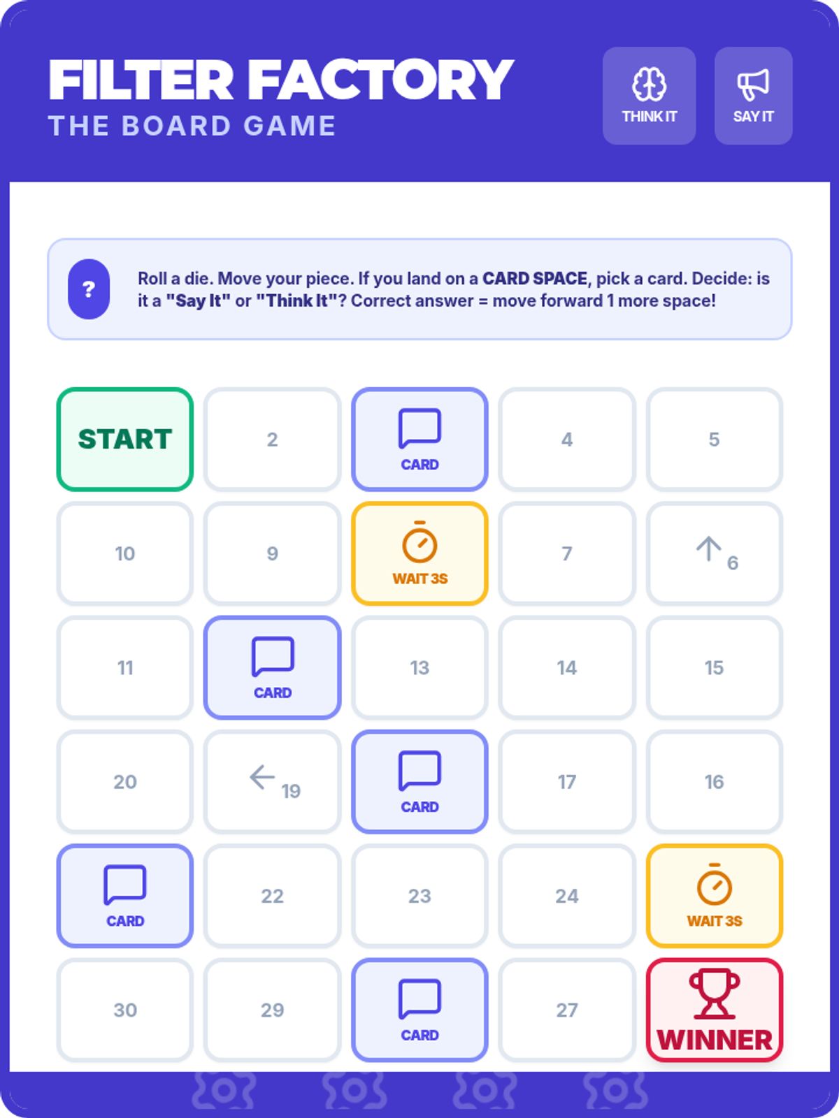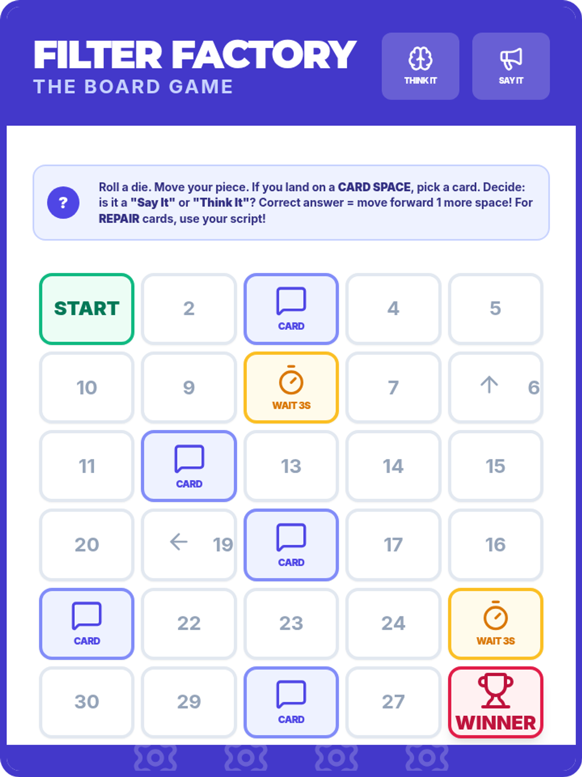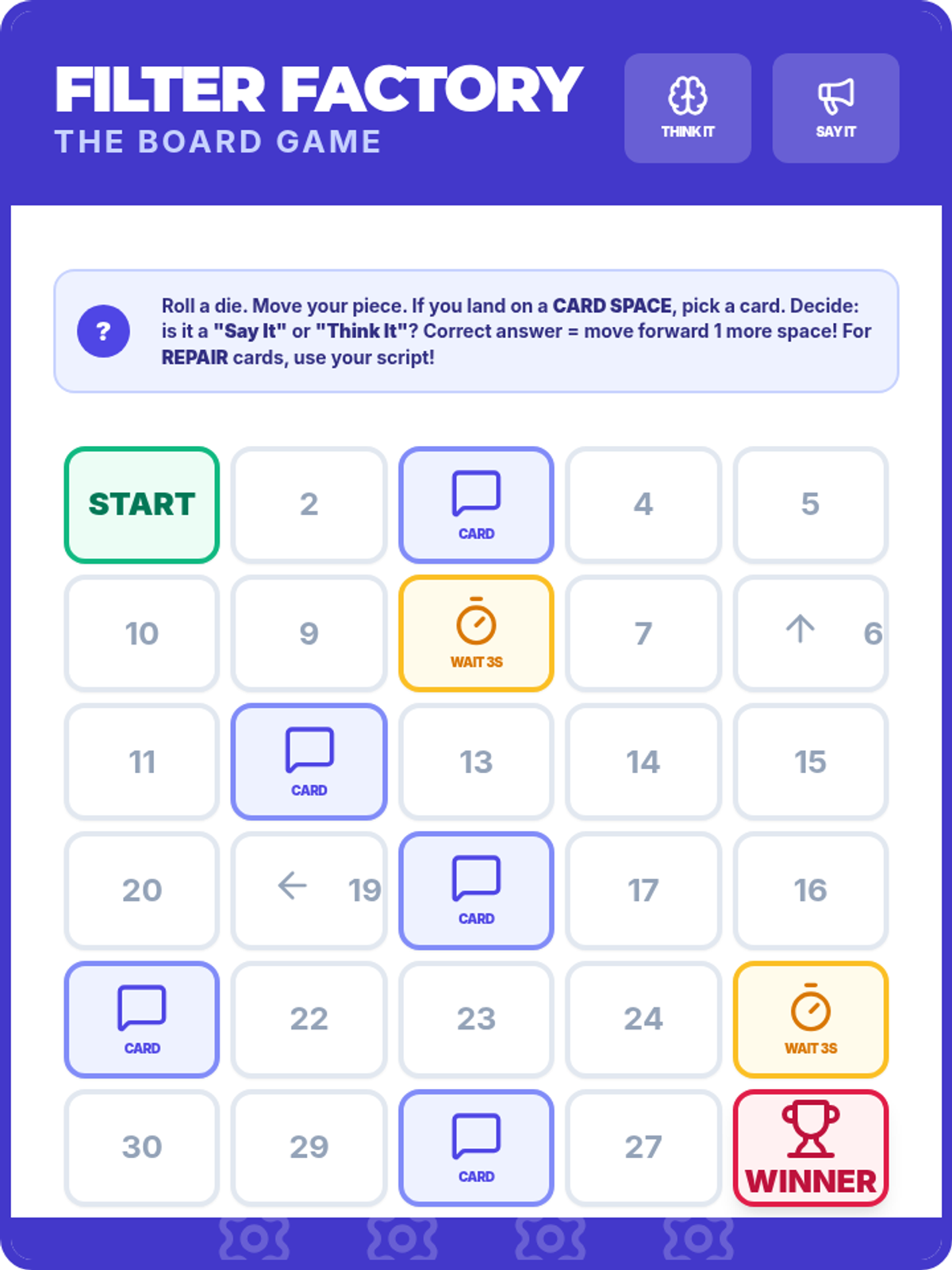 A specialized social filter game unit designed for 4th graders with autism. Includes a printable board game and scenario cards to practice 'Think It' or 'Say It' social rules.