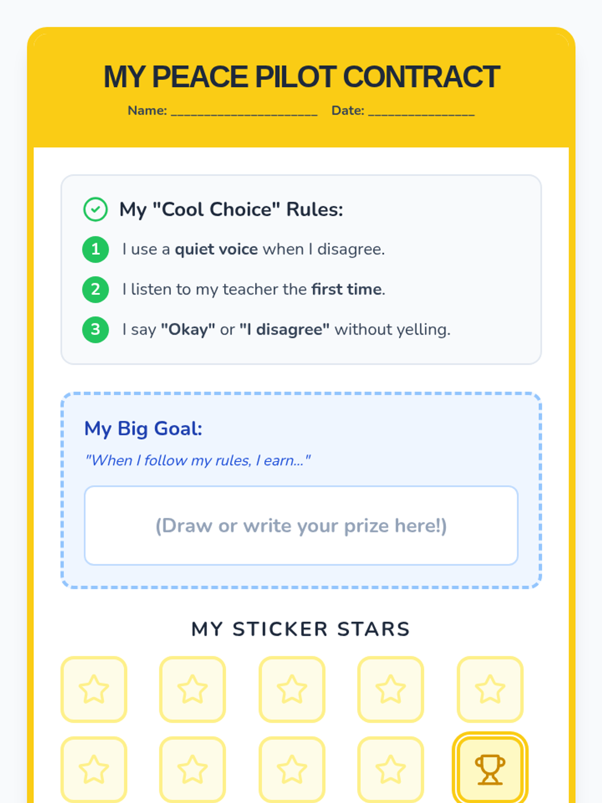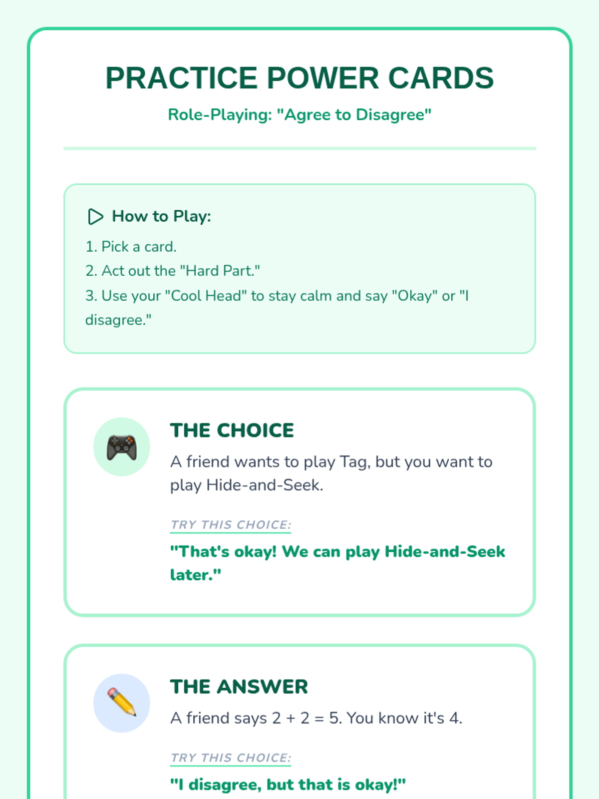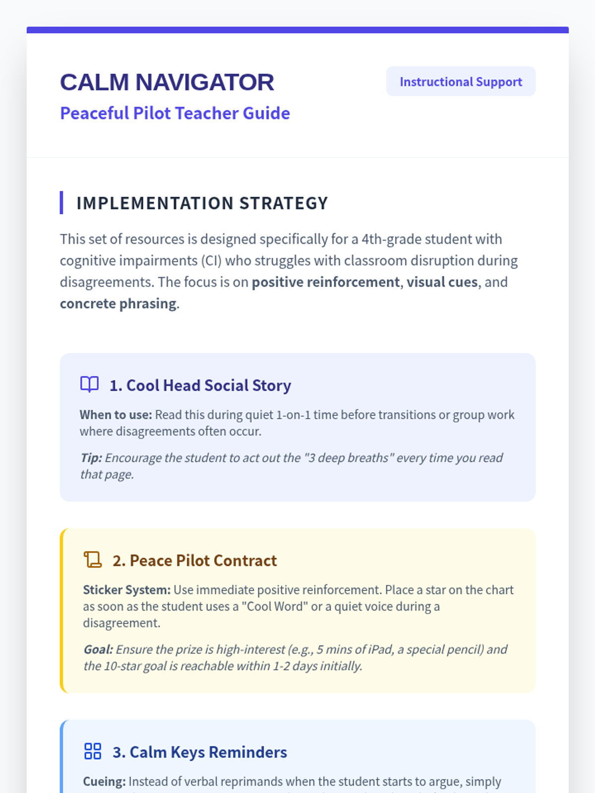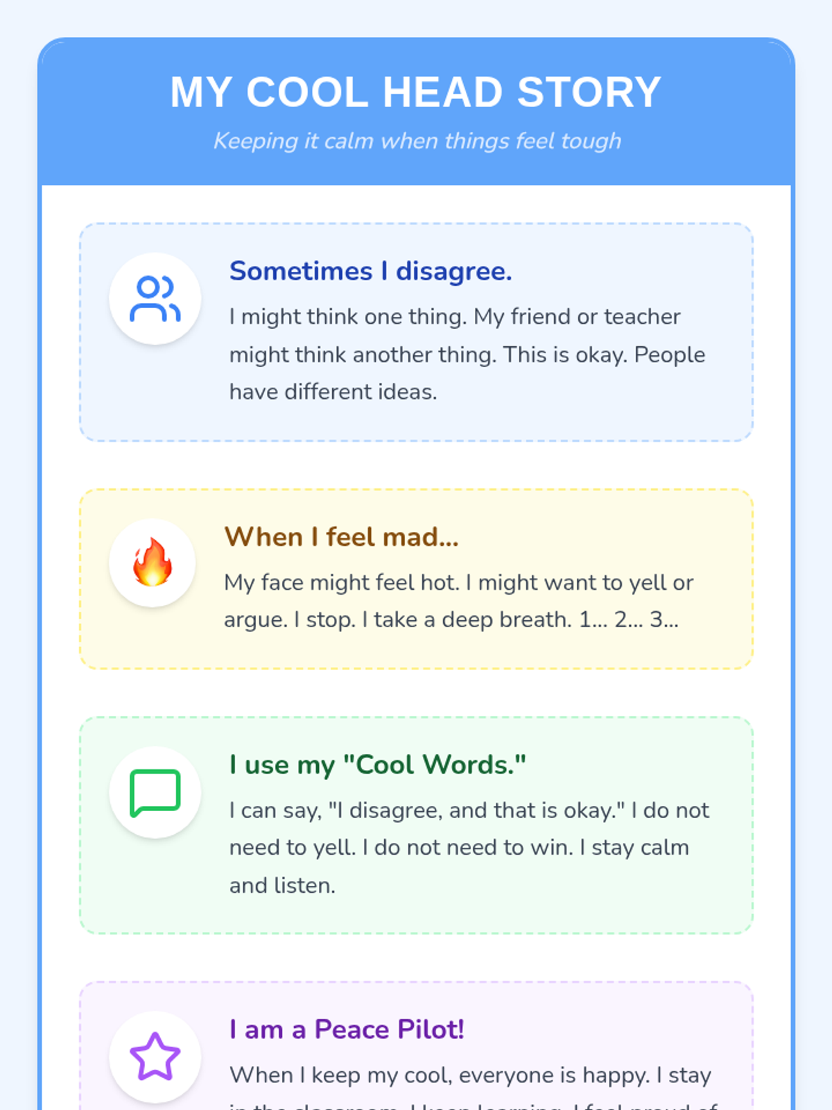 A comprehensive set of visual and narrative supports designed to help a 4th-grade student with cognitive impairments navigate disagreements without disruption. The materials focus on positive reinforcement, clear visual expectations, and role-playing practice.
