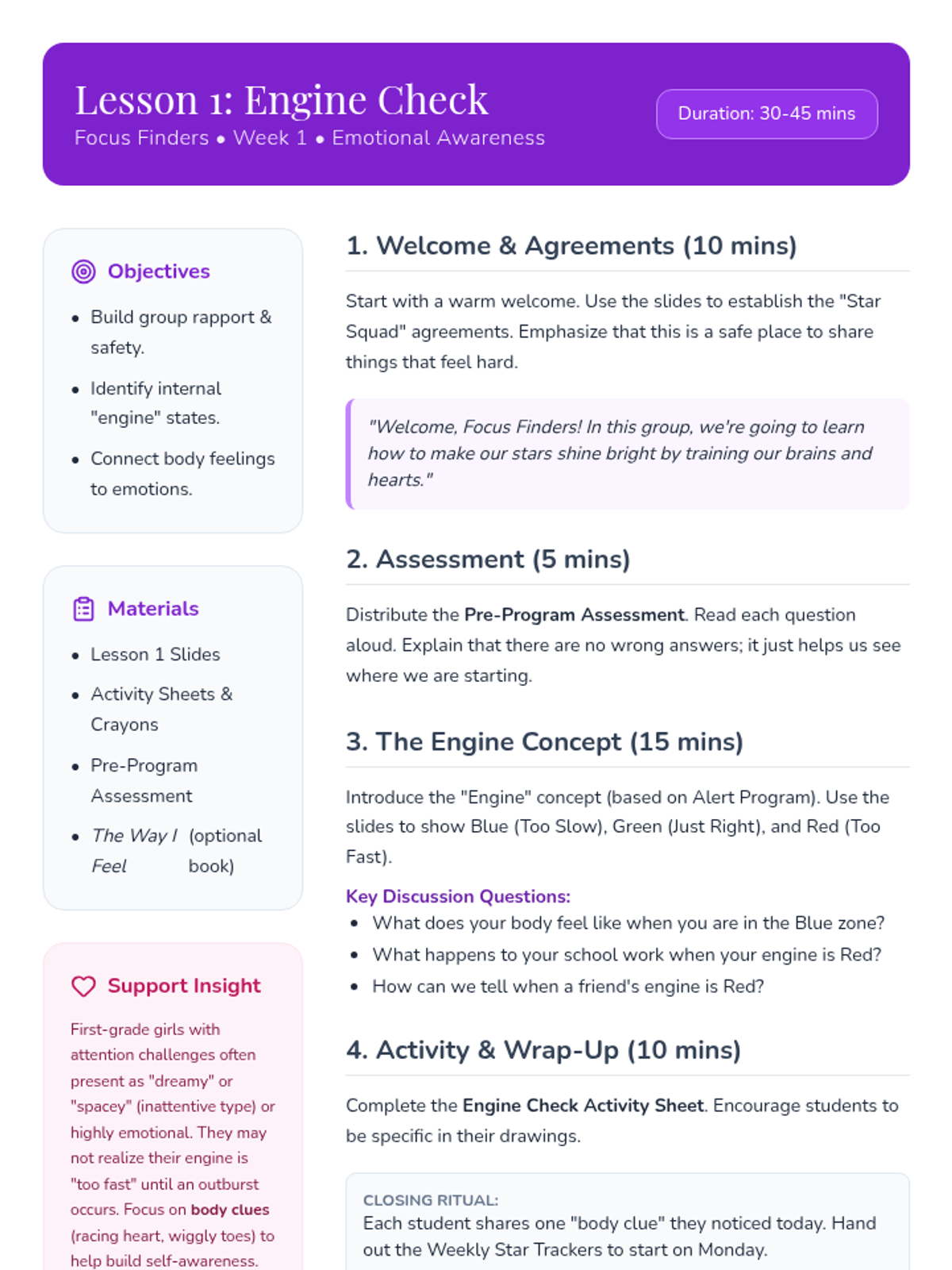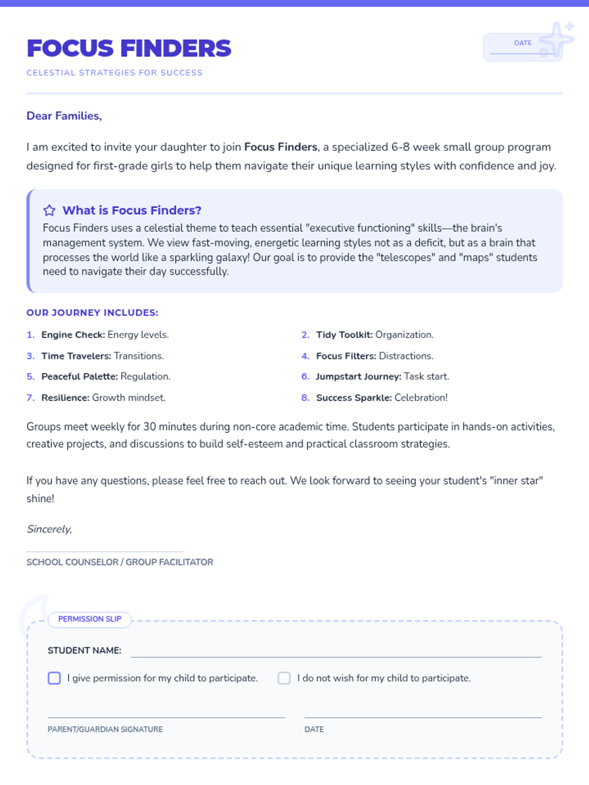 A 6-8 week intervention program designed for 1st-grade girls, focusing on executive functioning skills, emotional regulation, and academic success strategies through a strengths-based, celestial-themed approach.