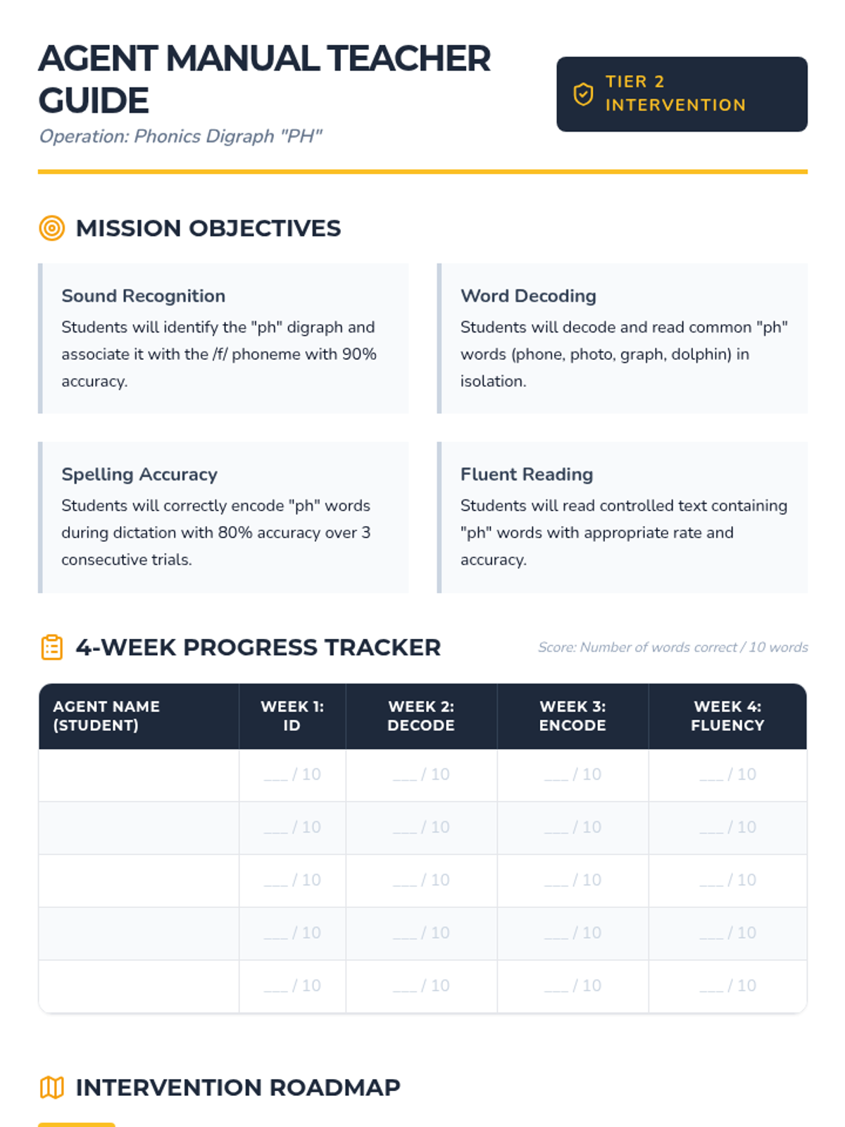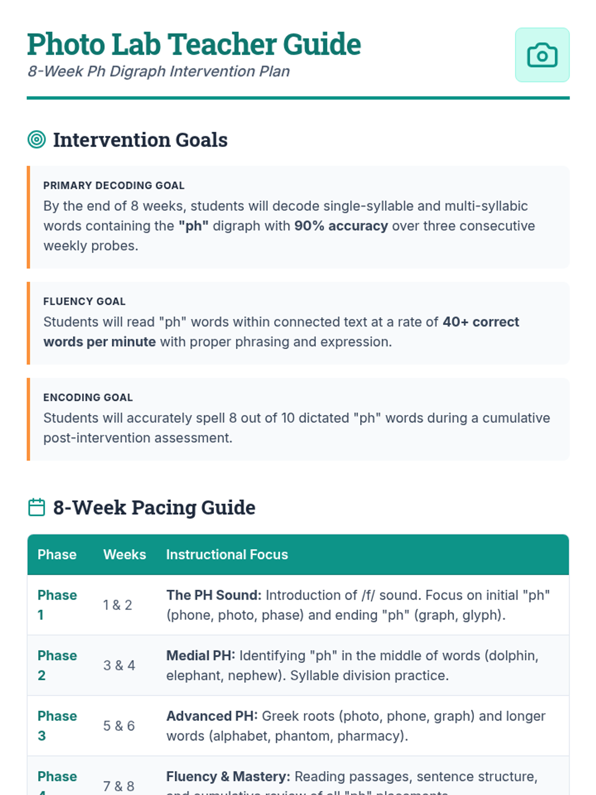 A 4-week intensive phonics intervention for 1st-grade Tier 2 students focusing on the 'PH' digraph. This sequence includes targeted goals, progress monitoring tools, and instructional materials to move students from sound recognition to fluent reading.