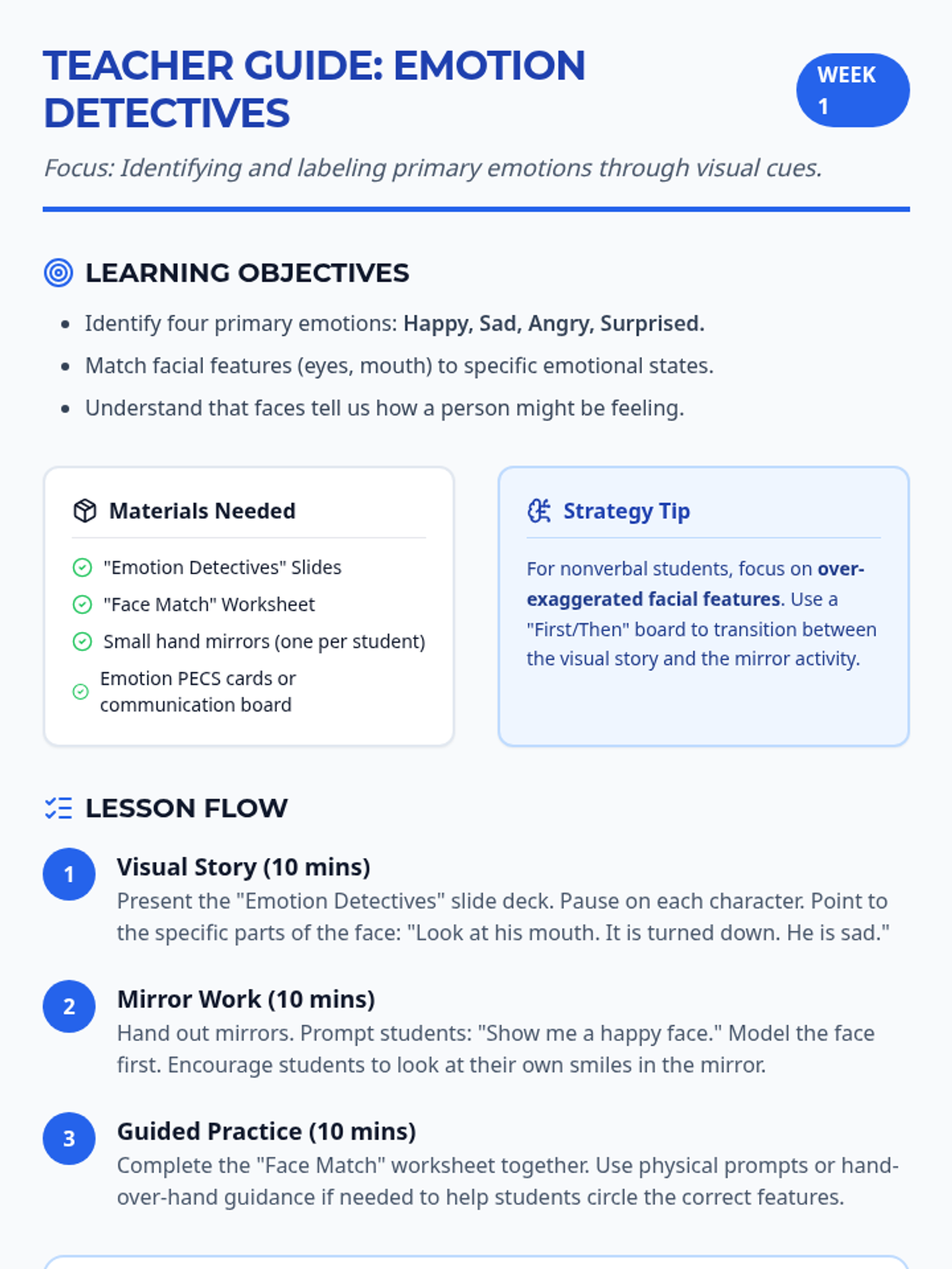 A 4-week social skills program designed for students with autism, focusing on nonverbal communication, emotion recognition, personal space, and social interaction through visual stories and structured activities.