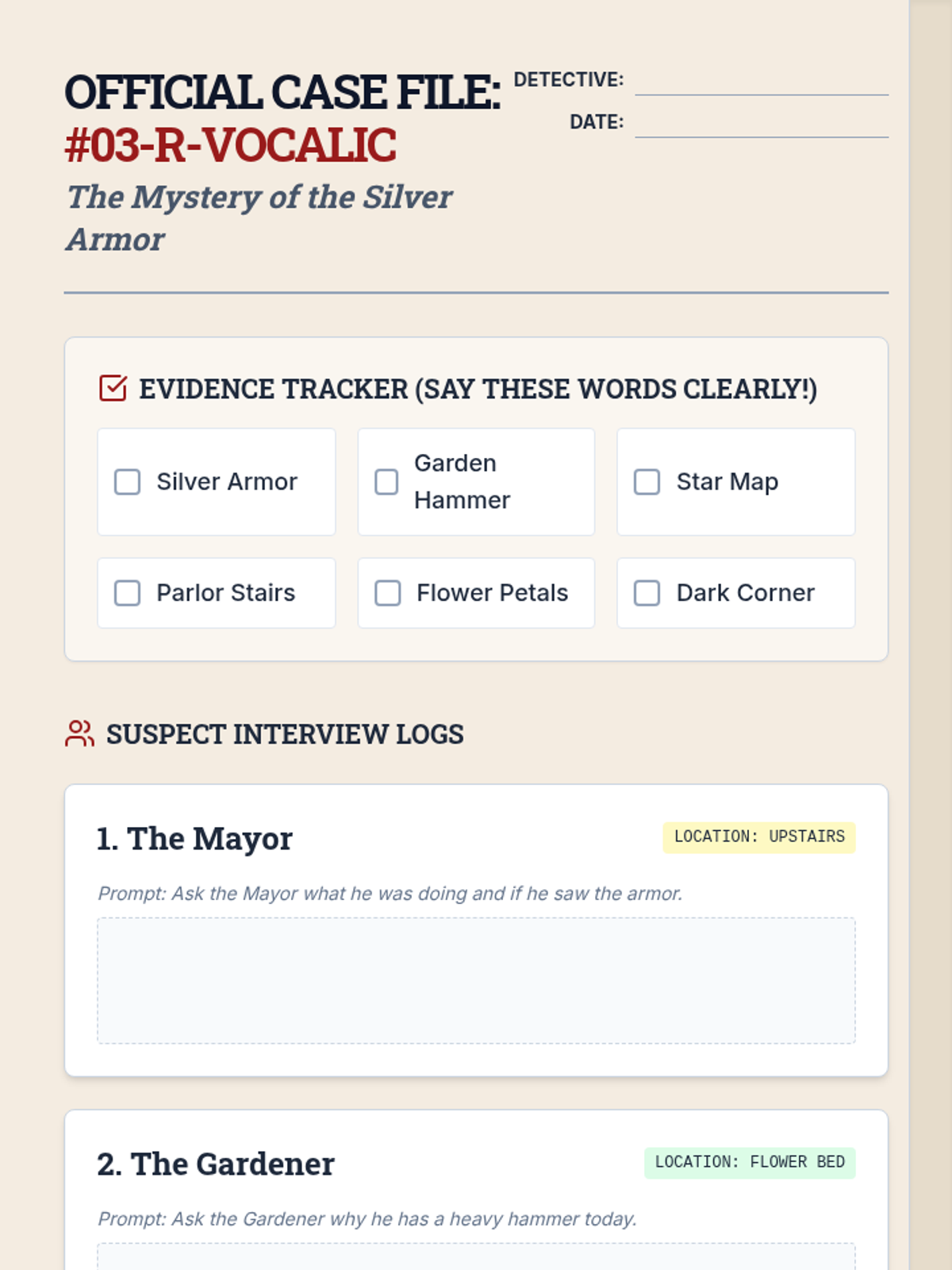 A series of role-playing mystery scenarios designed for a 3rd grade student to practice carryover of vocalic /r/ sounds in conversational speech. Each lesson features a unique mystery with dedicated instructional slides, student worksheets, and teacher facilitation guides.