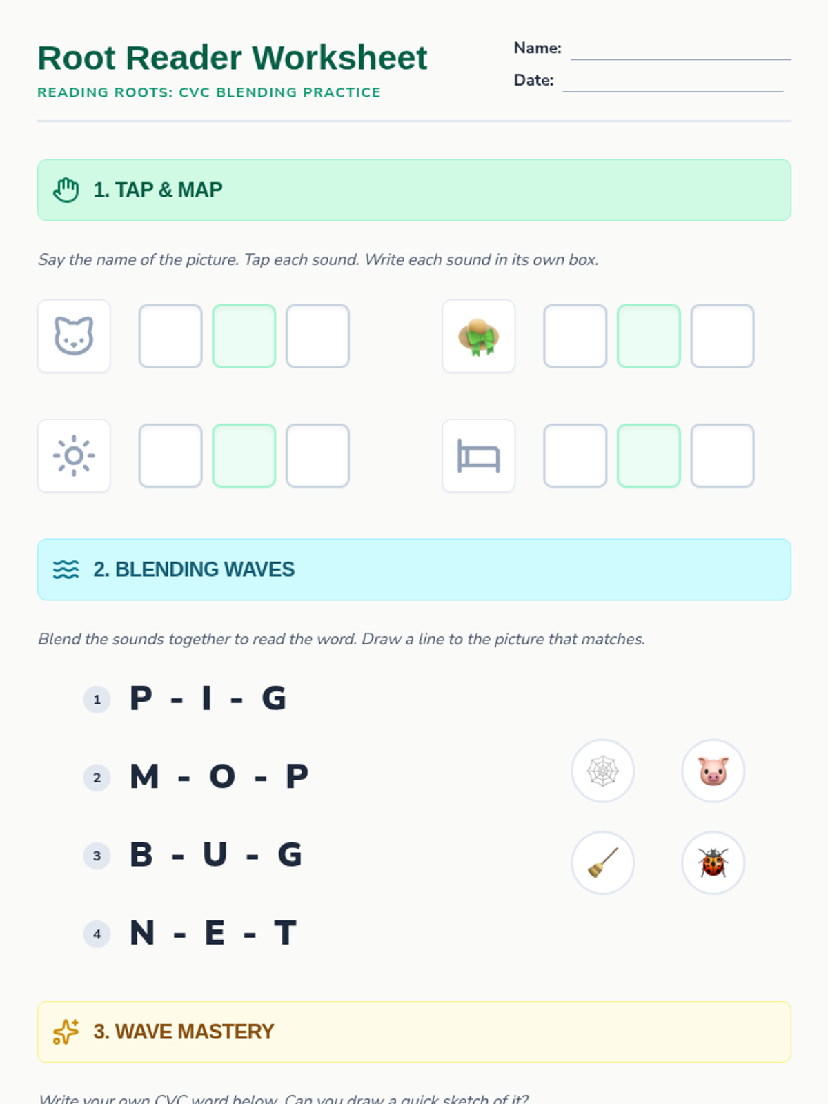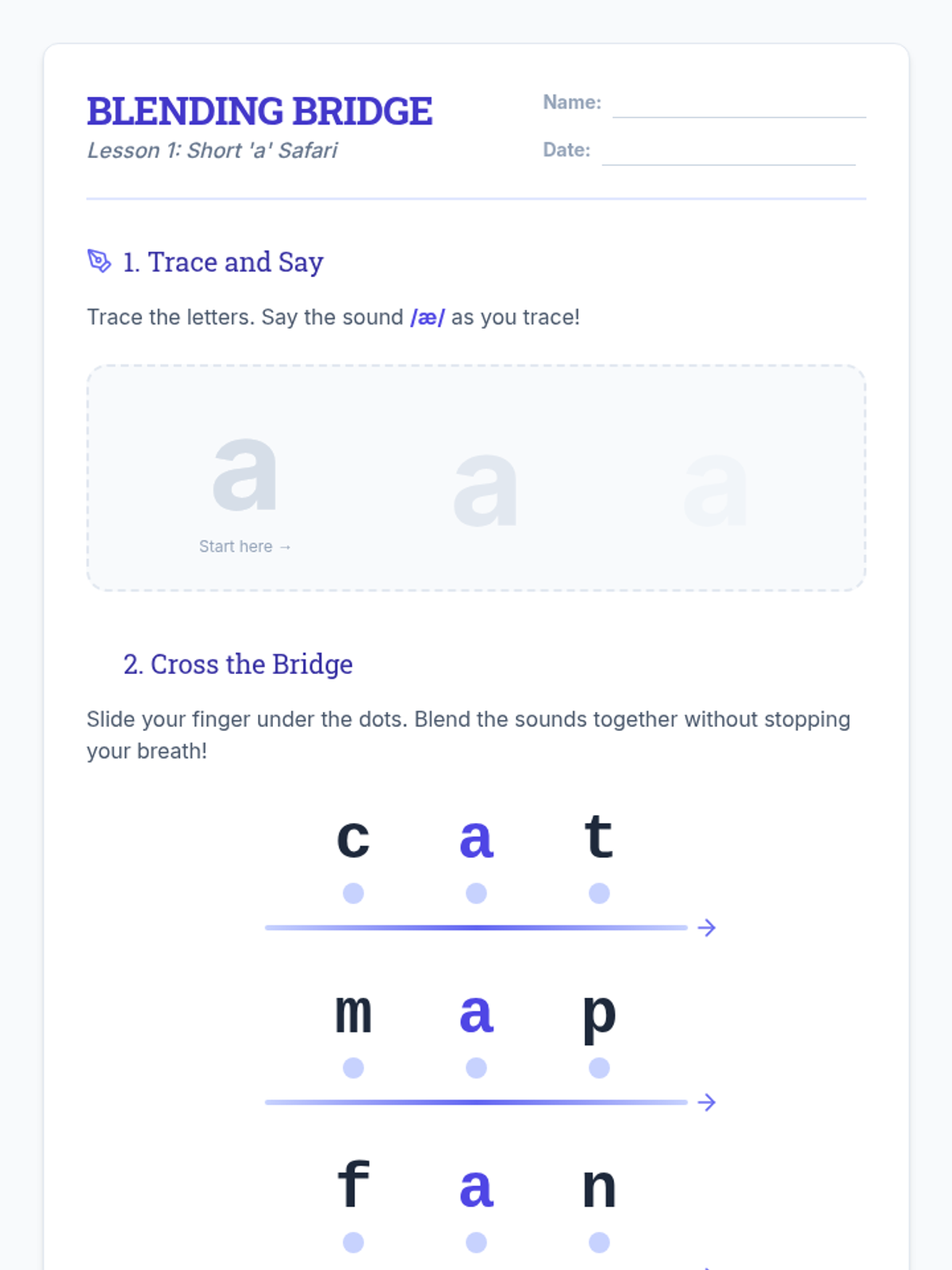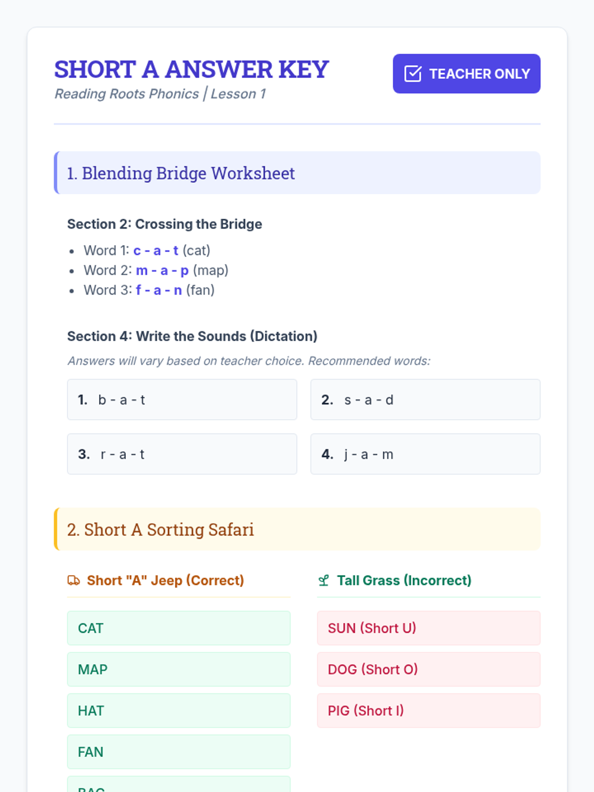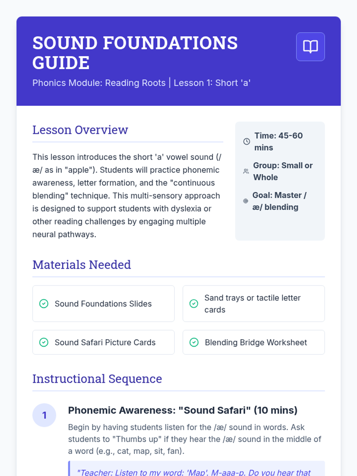 A systematic, multi-sensory phonics module designed for foundational literacy intervention. This sequence focuses on phonemic awareness, blending CVC words, and early decoding strategies using visual, auditory, and tactile techniques.