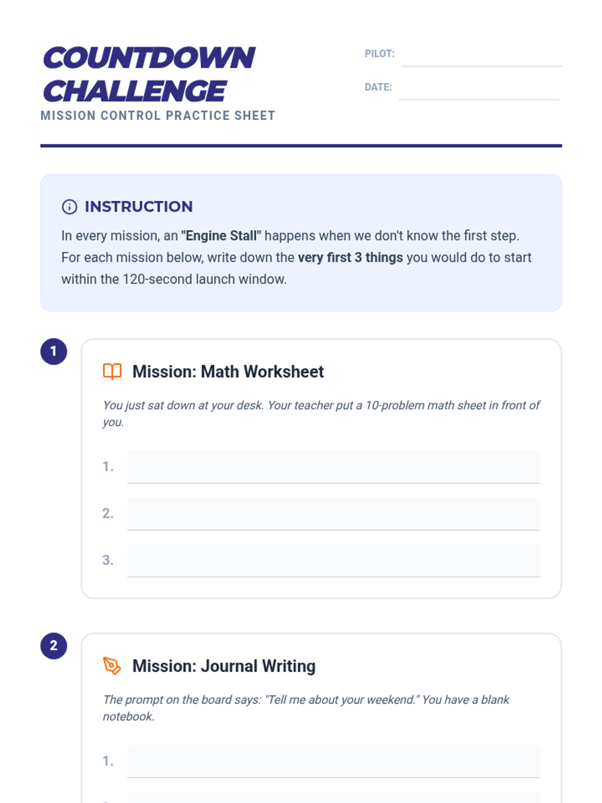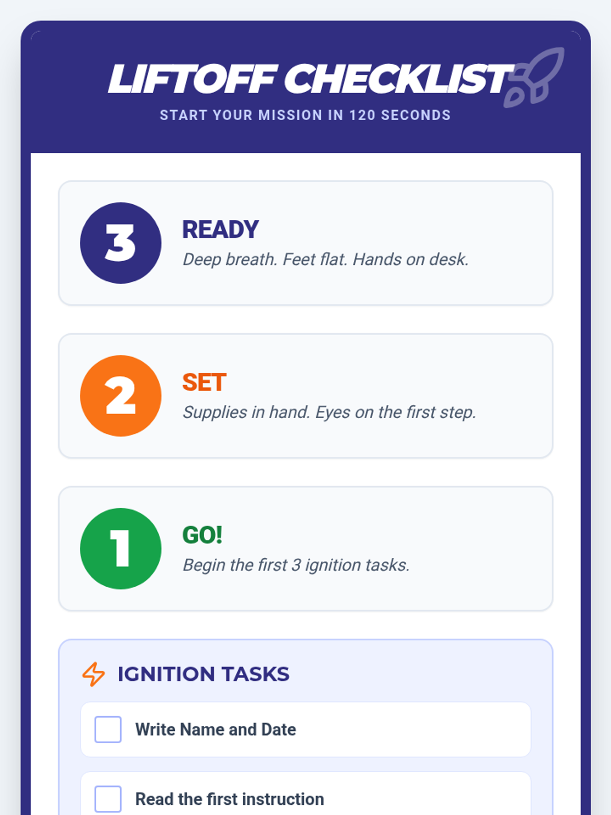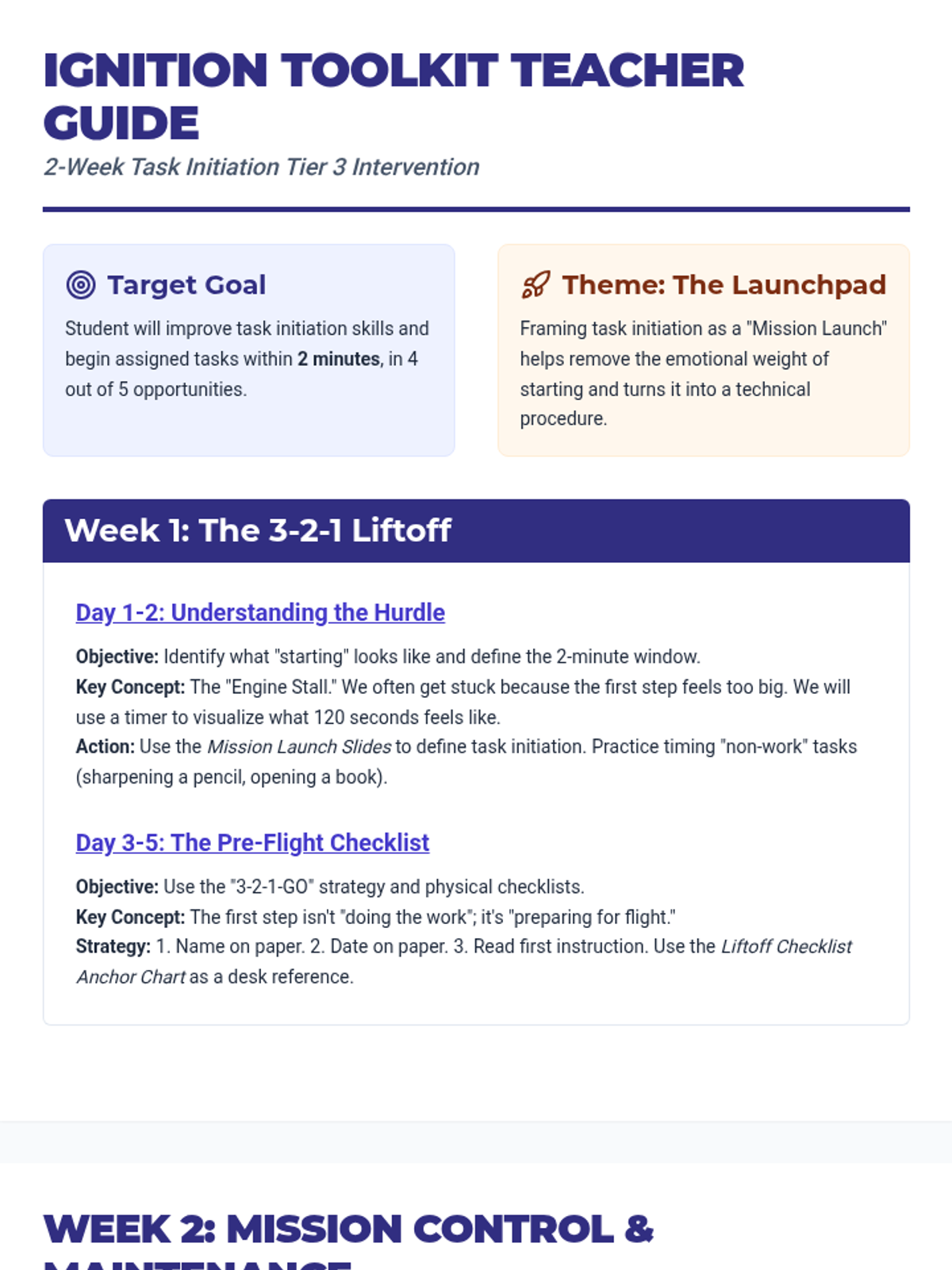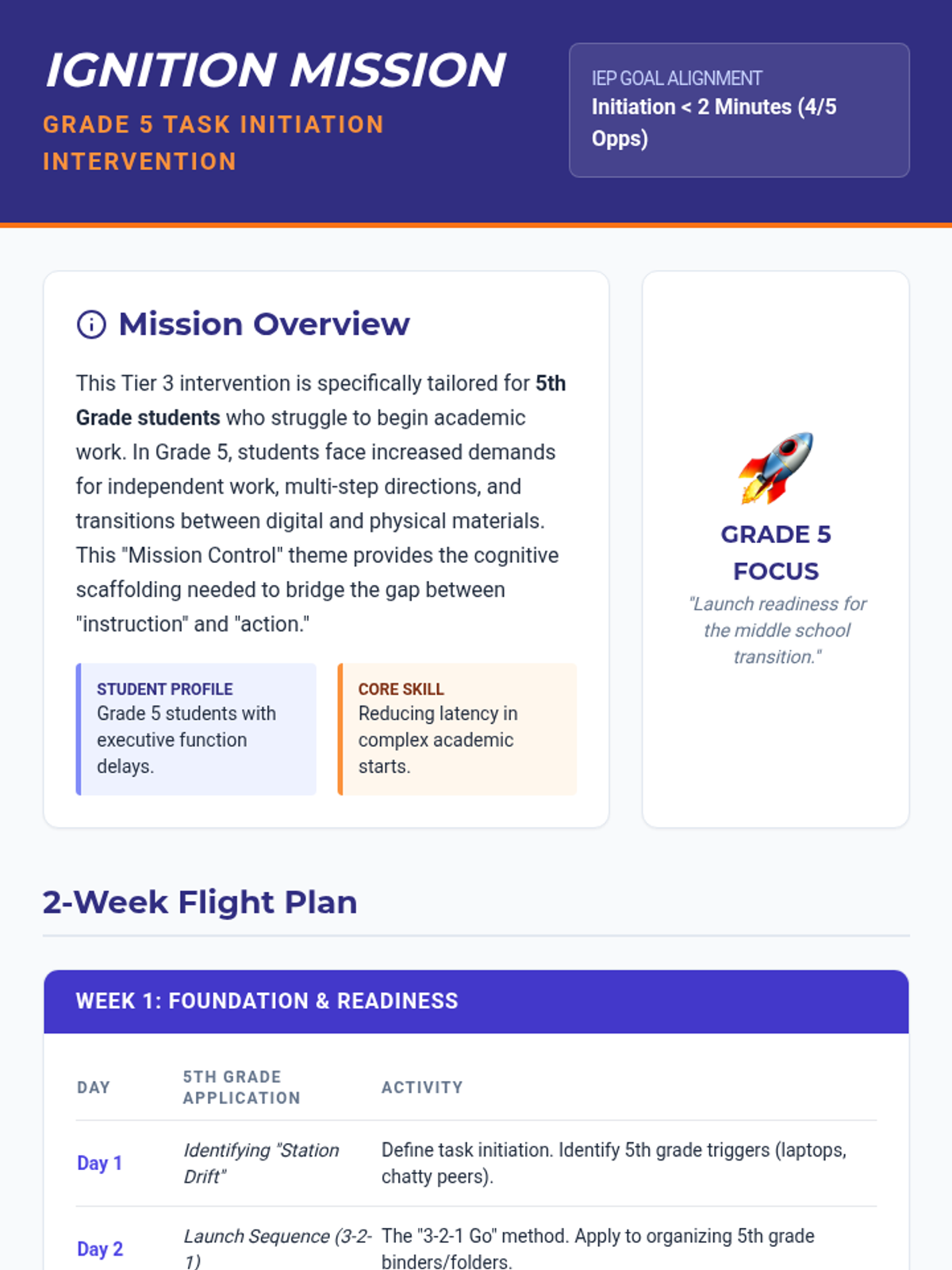 A 2-week Tier 3 intervention focused on task initiation skills using a 'Space Mission' theme. Students learn concrete strategies like the 3-2-1 countdown and pre-flight checklists to begin tasks within 2 minutes.