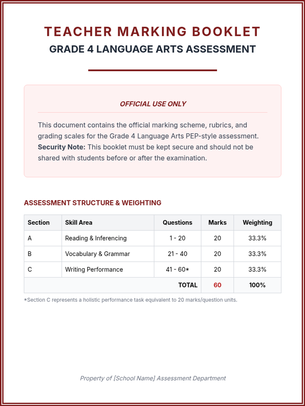 A comprehensive assessment suite for Jamaican Grade 4 students, designed to align with the Primary Exit Profile (PEP) standards. Includes full-length Language Arts and Mathematics examination booklets with corresponding teacher marking guides and rubrics.
