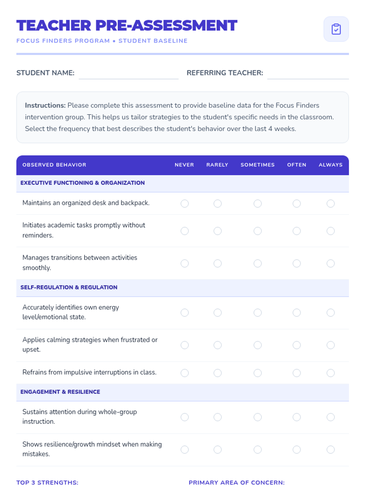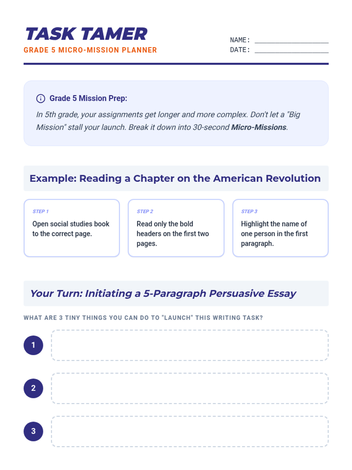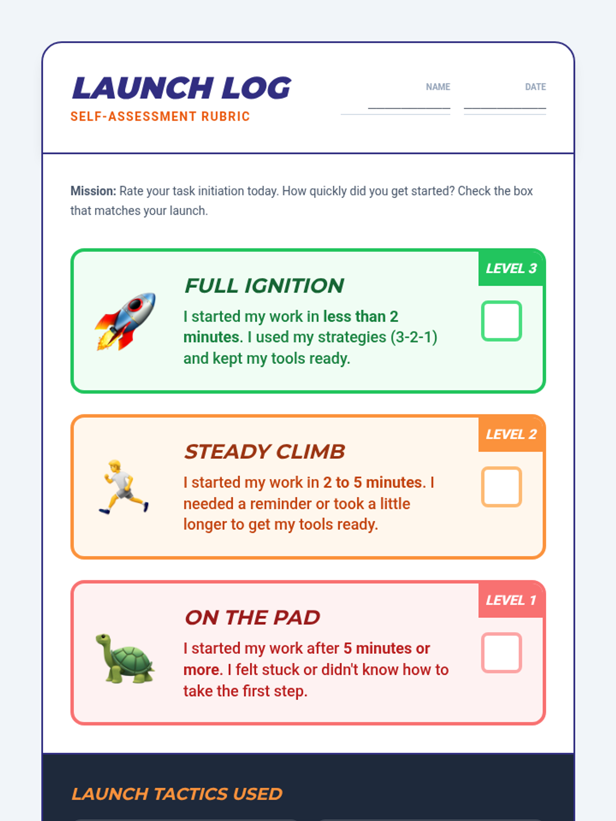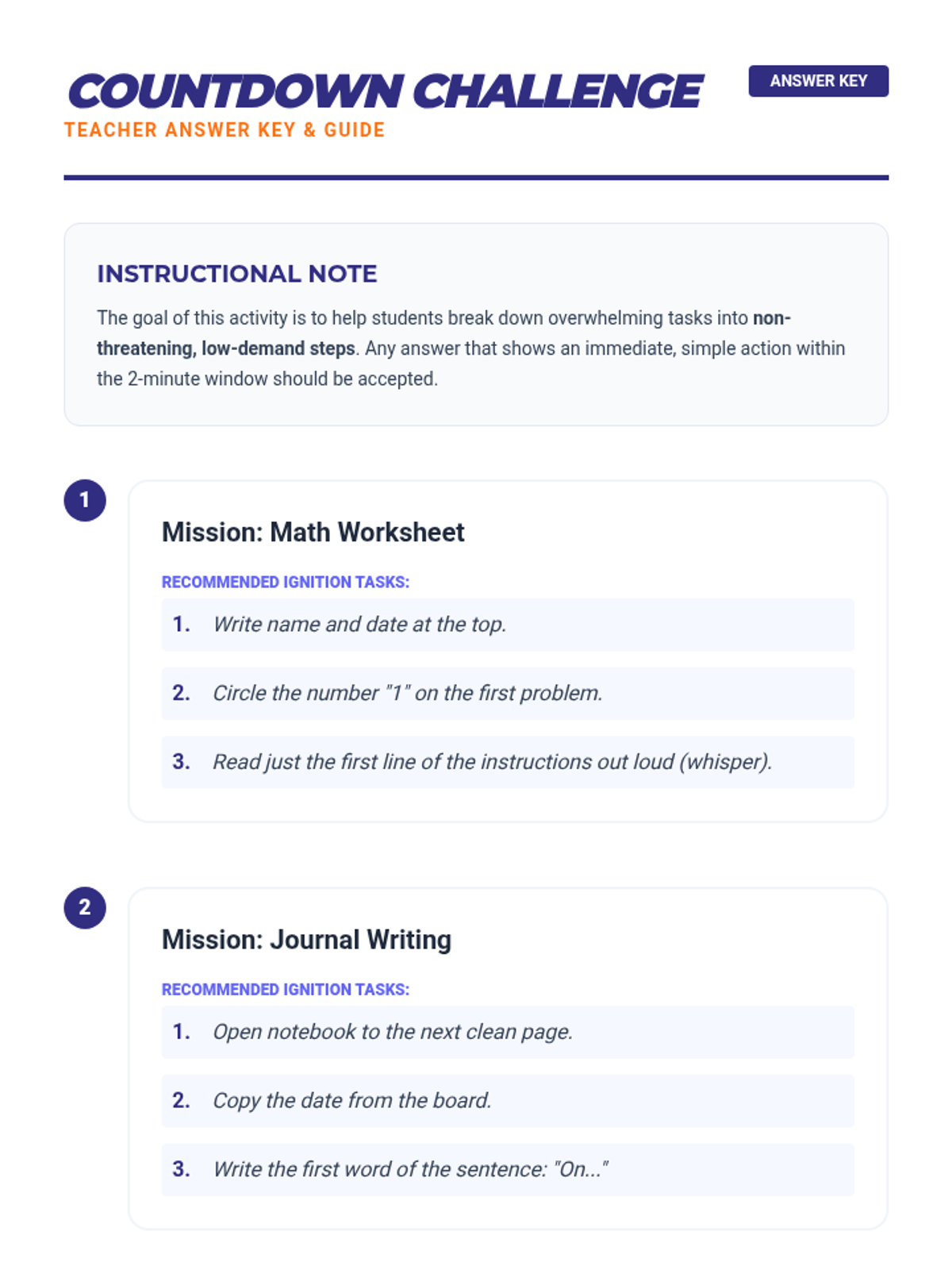 A 2-week Tier 3 intervention focused on task initiation skills. This sequence provides structured strategies to help students begin academic tasks within 2 minutes through modeling, self-assessment, and scaffolded practice.