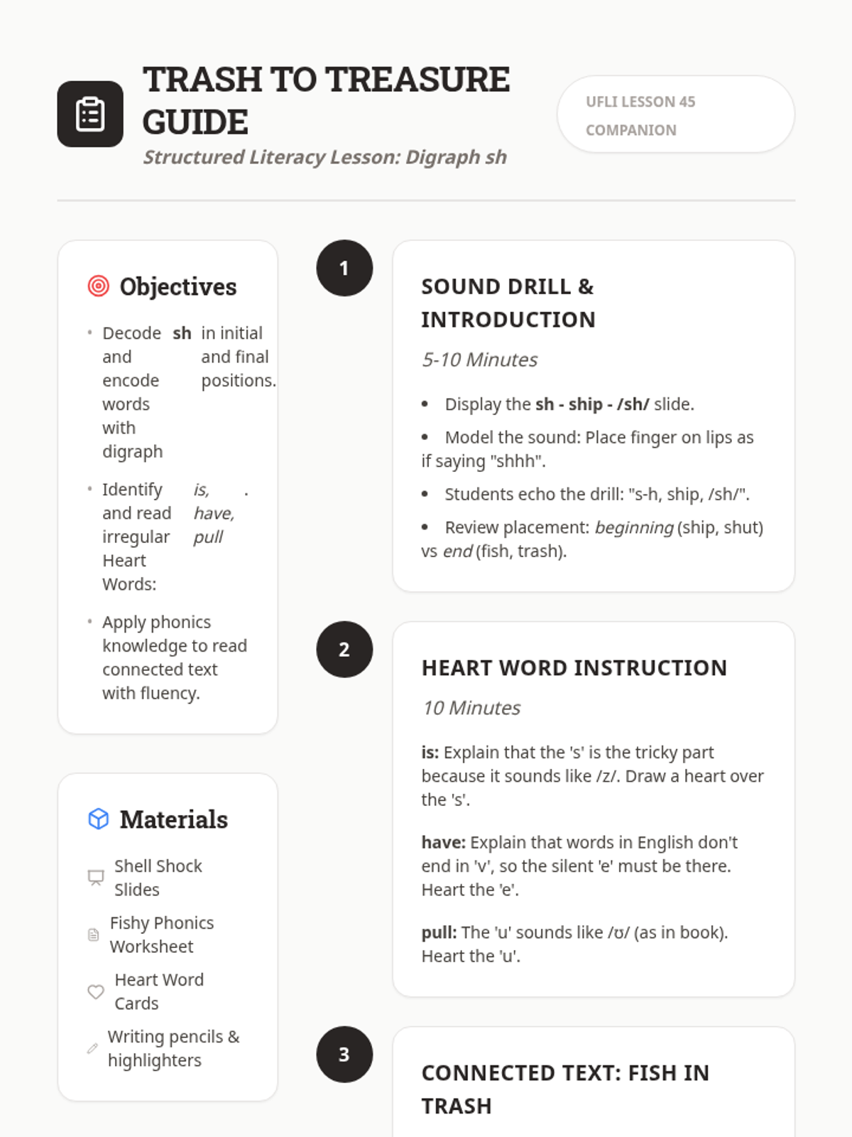A series of structured literacy lessons focusing on mastering common digraphs (sh, th, ch) through explicit instruction, heart word methods, and decodable text practice.