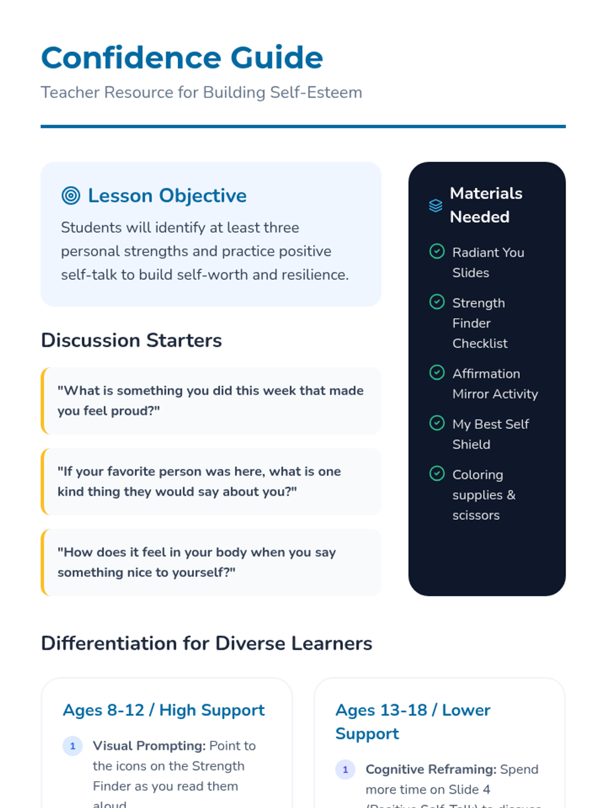 A social-emotional learning sequence focused on developing self-esteem, identifying personal strengths, and practicing self-compassion for students with diverse learning needs.