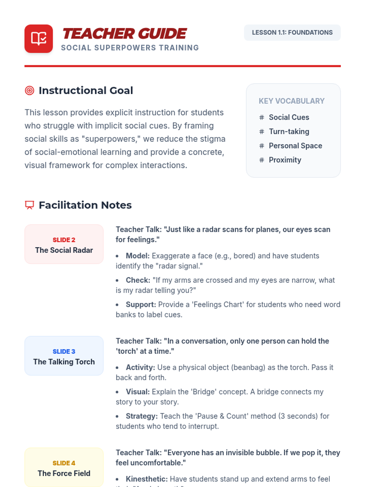 A series of lessons designed to build foundational social-emotional skills through explicit instruction, modeling, and guided practice.