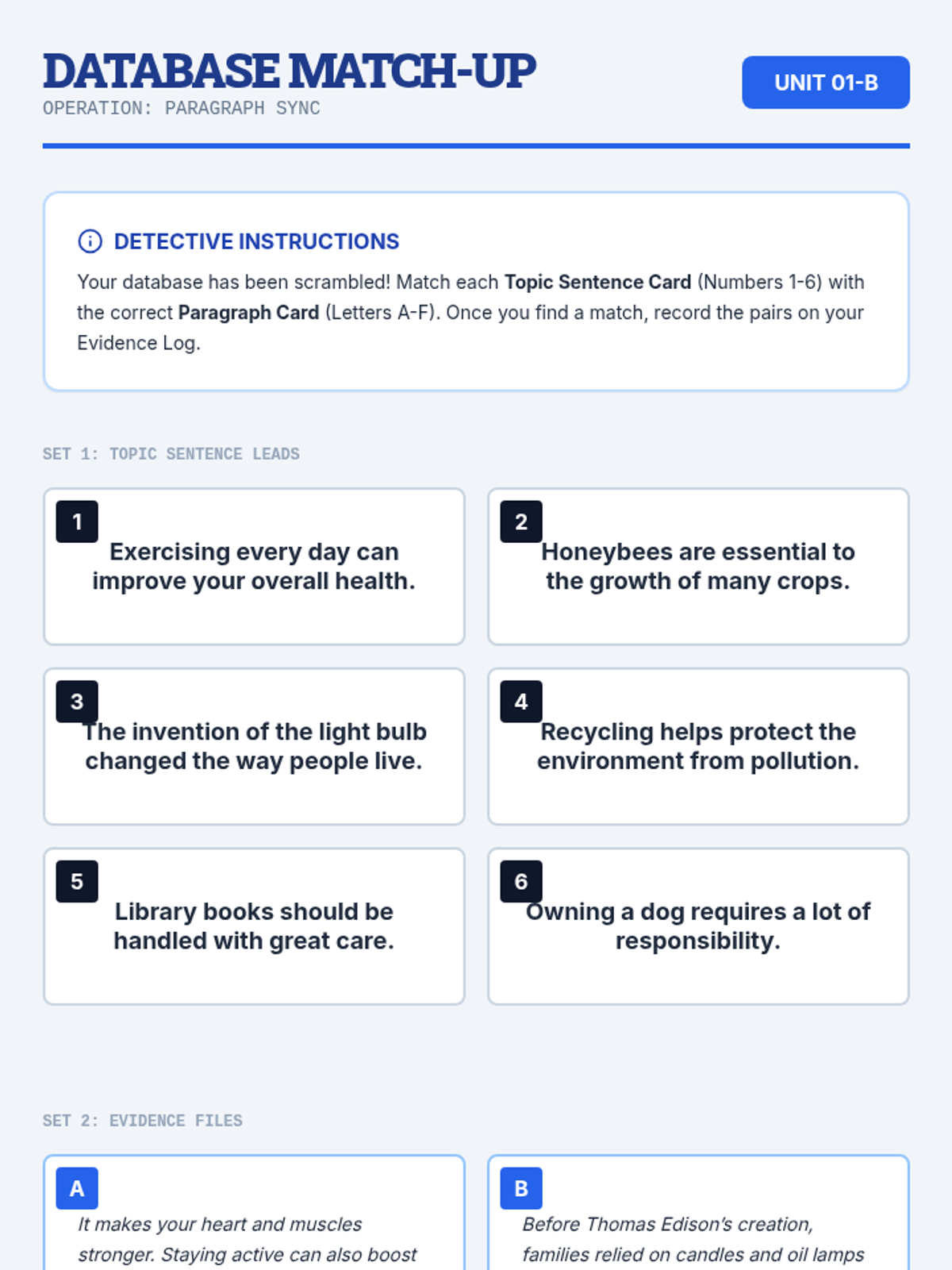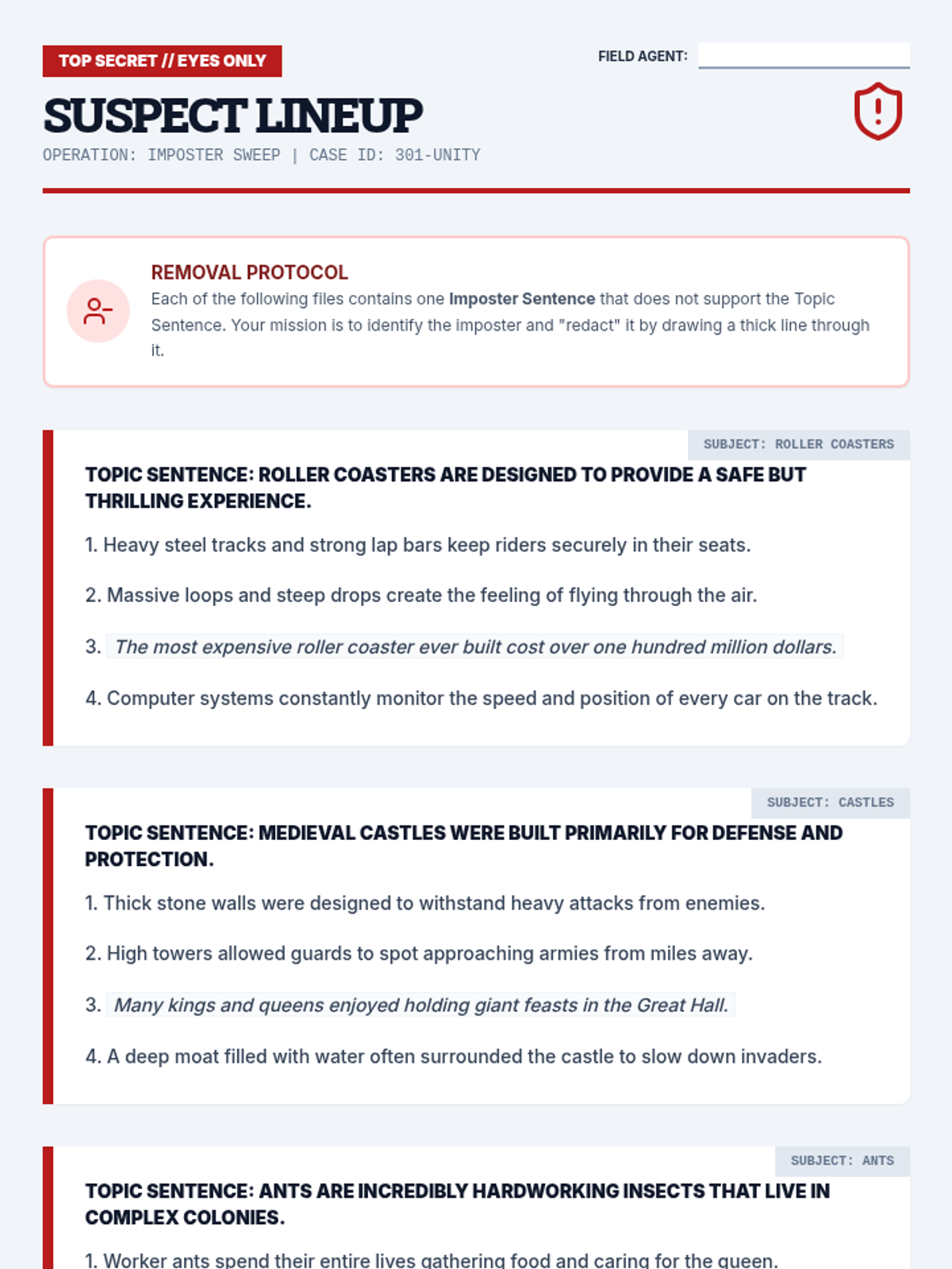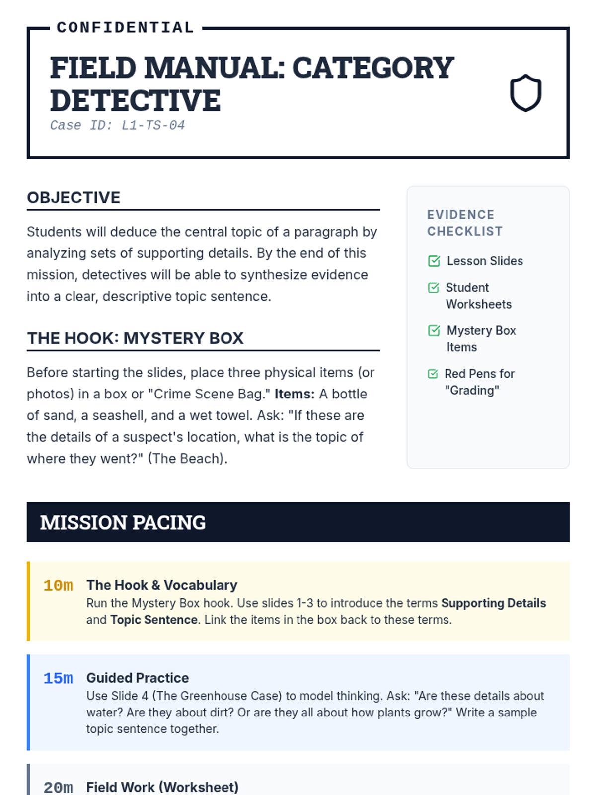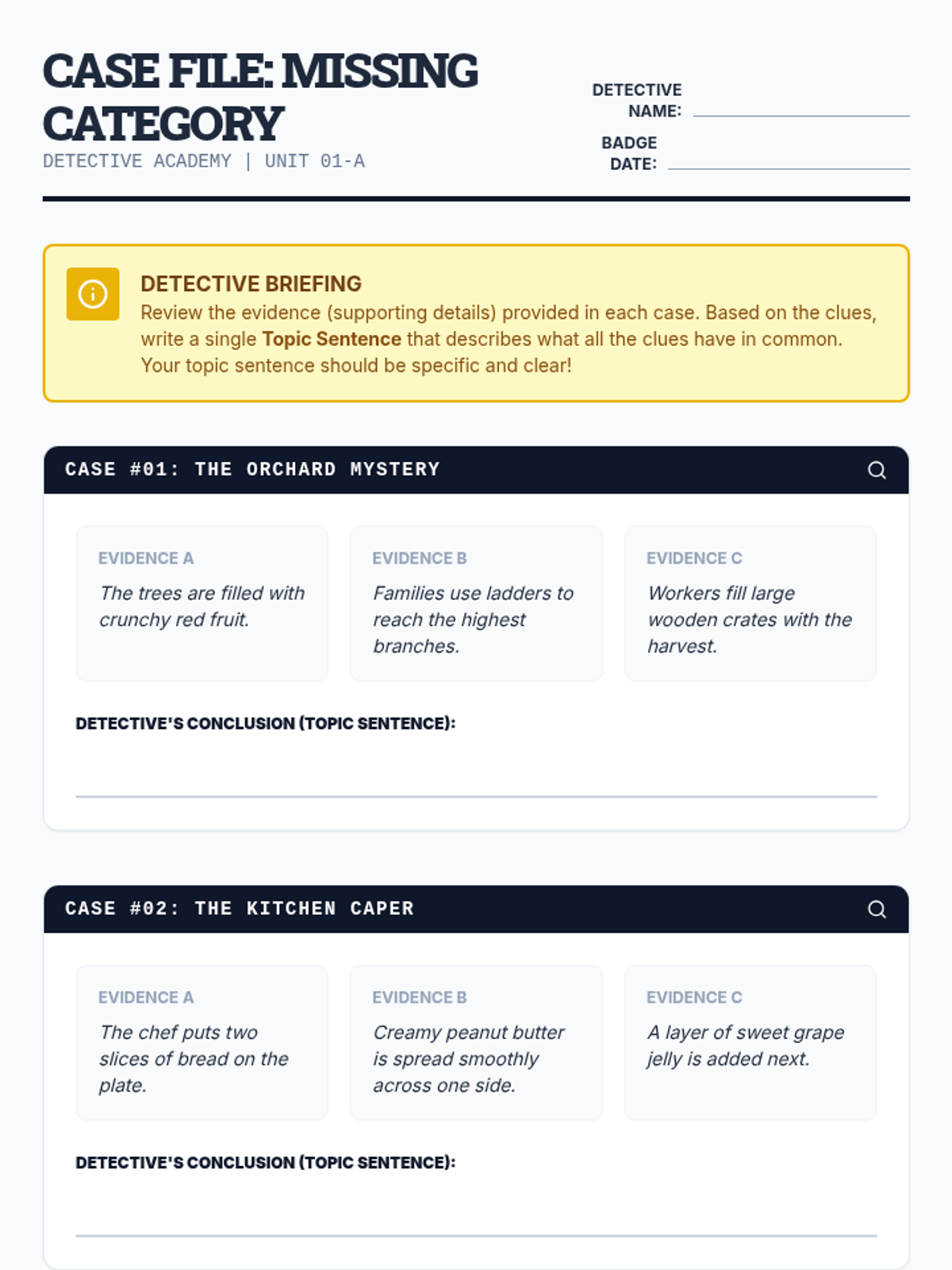 A gamified ELA sequence for 4th graders where students act as detectives to master the identification and creation of topic sentences through puzzles, sorting, and synthesis challenges.
