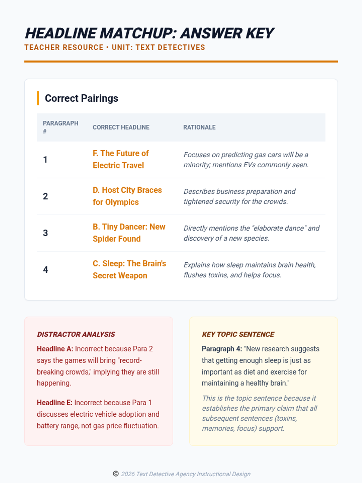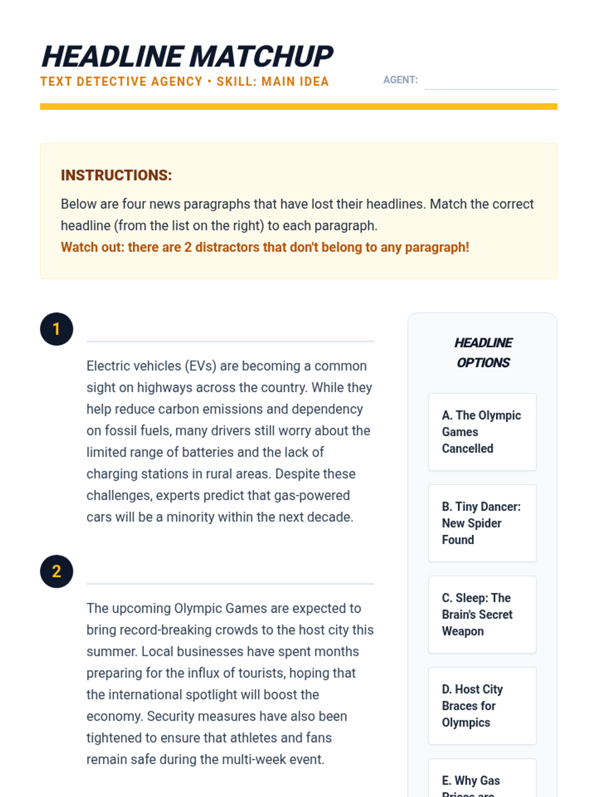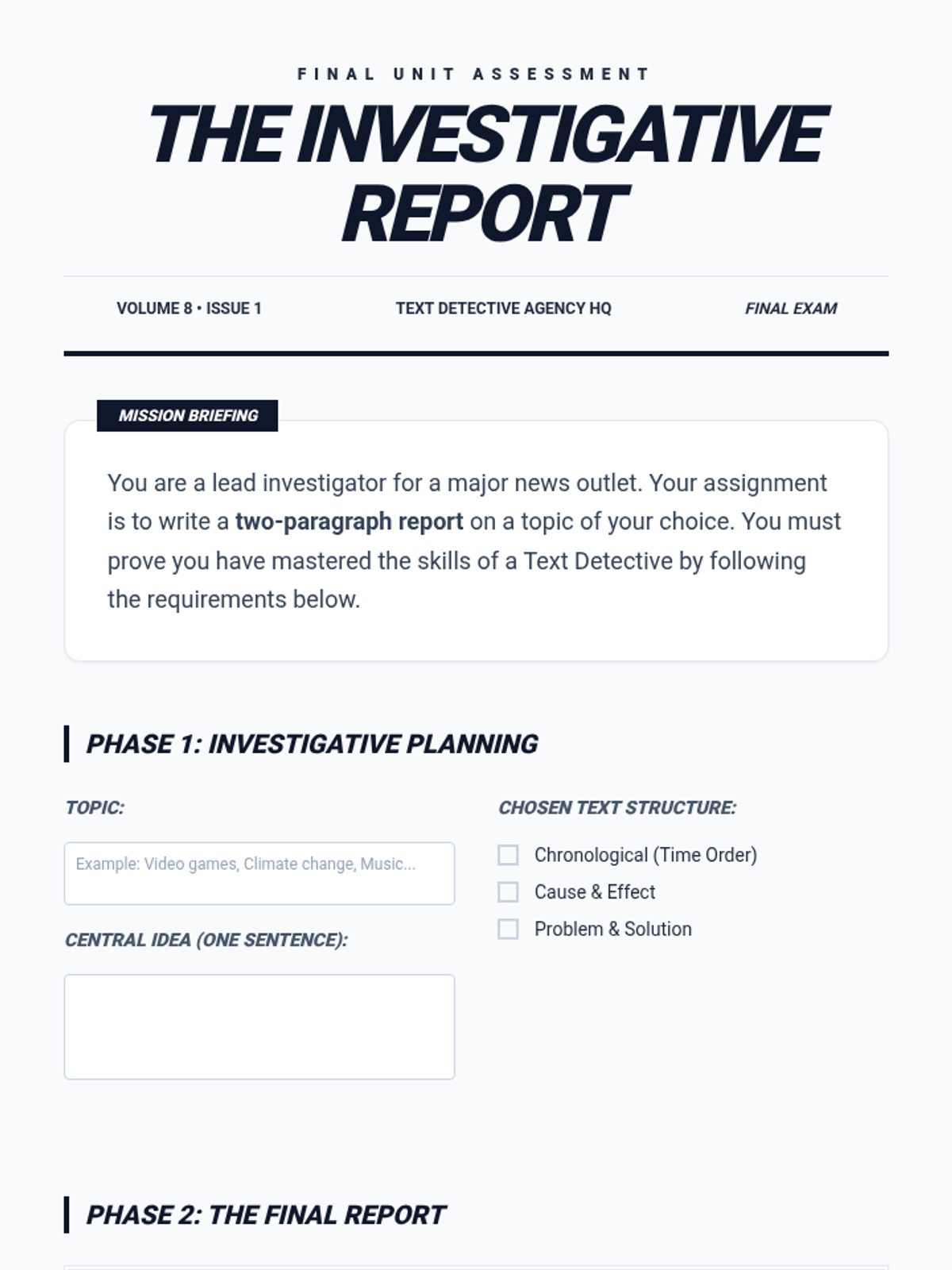 A comprehensive 8th-grade reading sequence designed for intermediate ELL students to master identifying main ideas and analyzing non-fiction text structures. Through a journalist-themed lens, students move from identifying surface-level text features to critically comparing how different structures convey central ideas.
