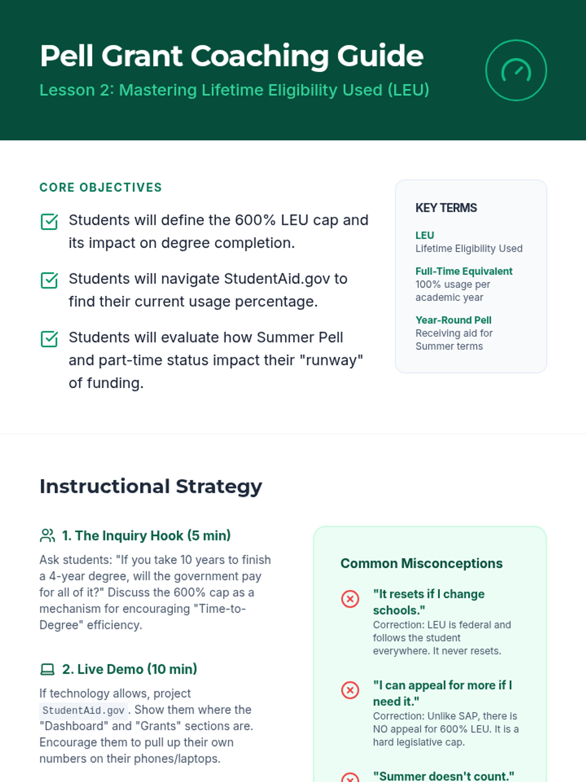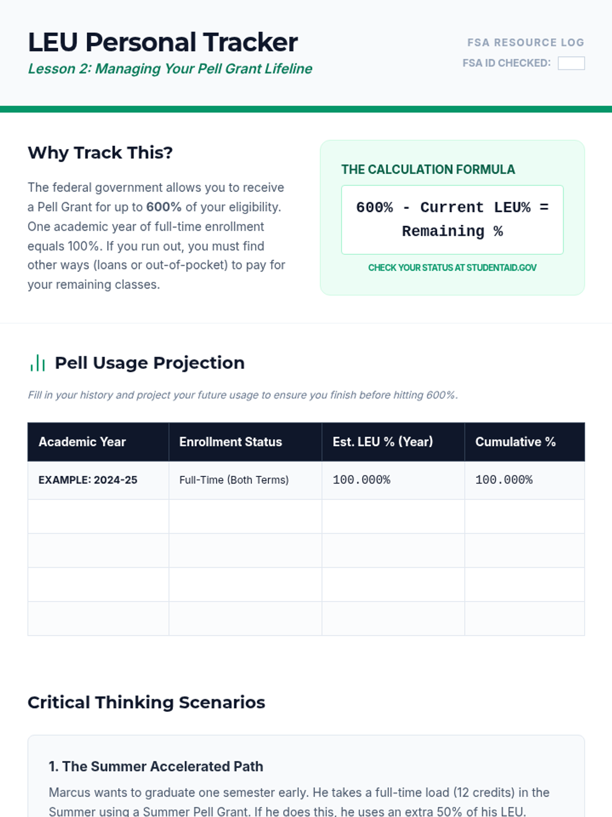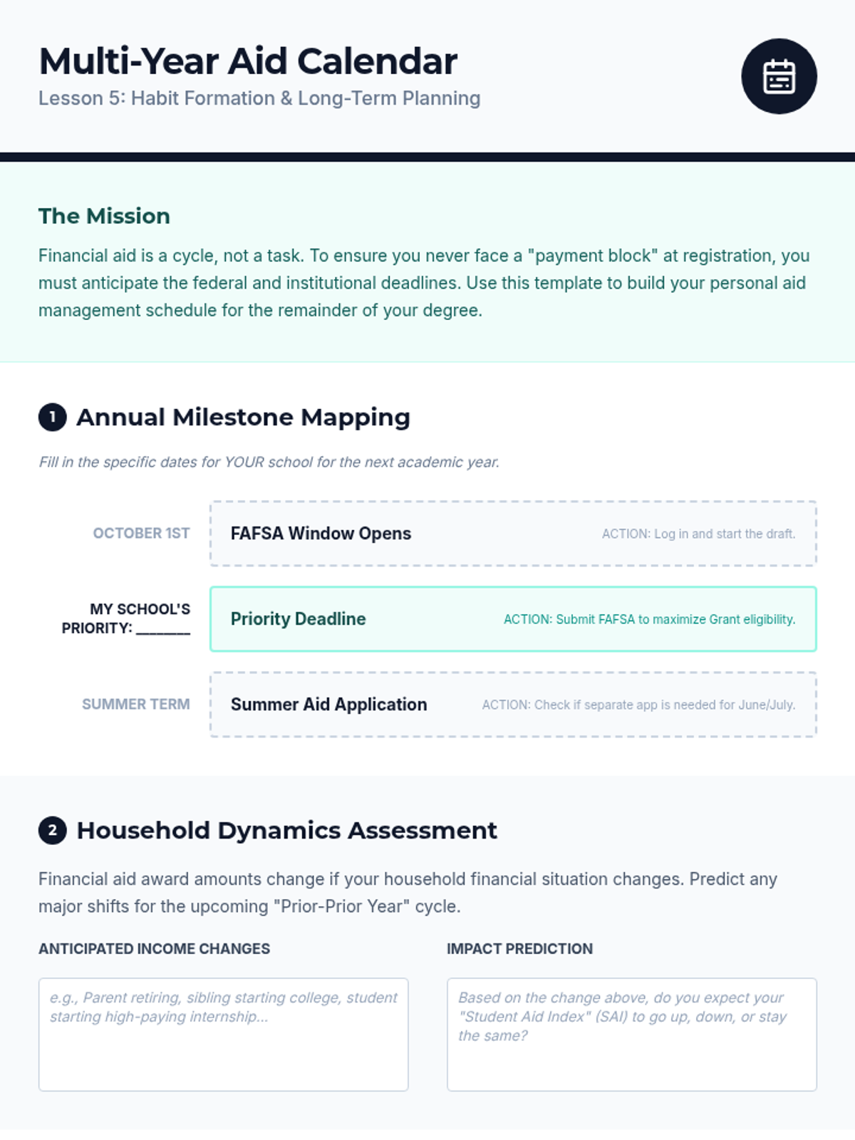 A comprehensive sequence for undergraduate students focusing on the long-term maintenance of federal financial aid eligibility. Students master Satisfactory Academic Progress (SAP), lifetime limits, loan aggregates, withdrawal consequences, and the annual renewal cycle.