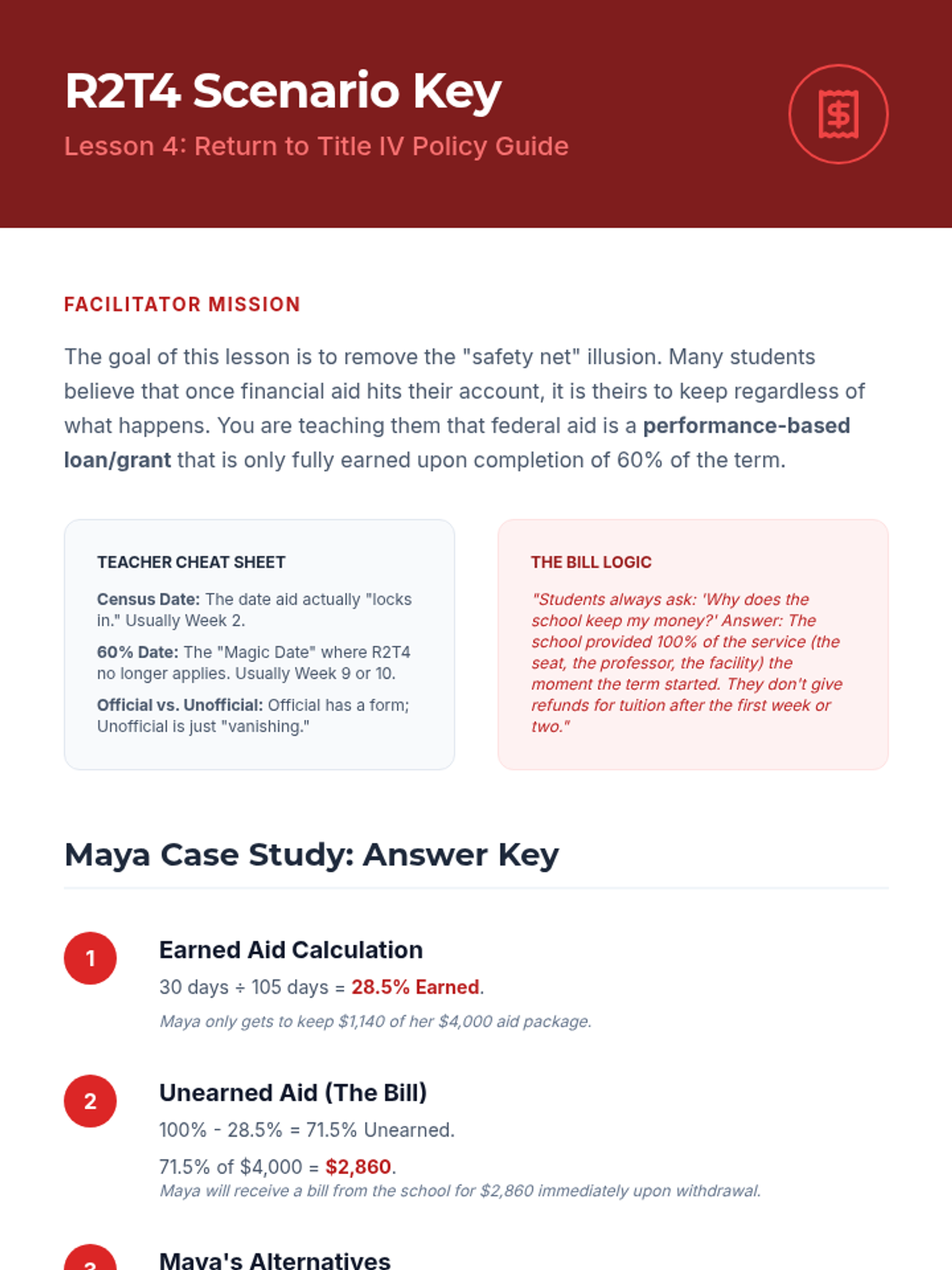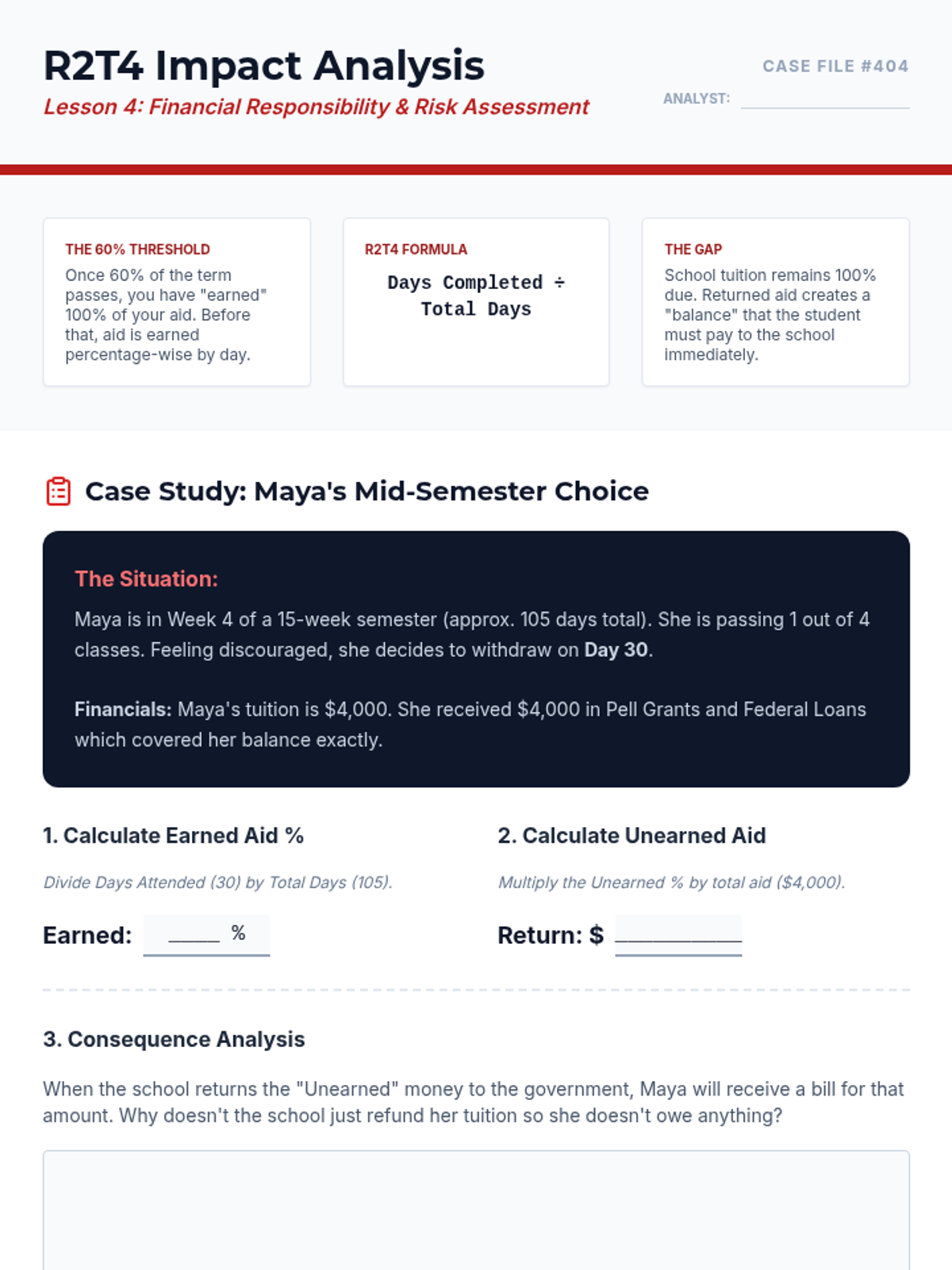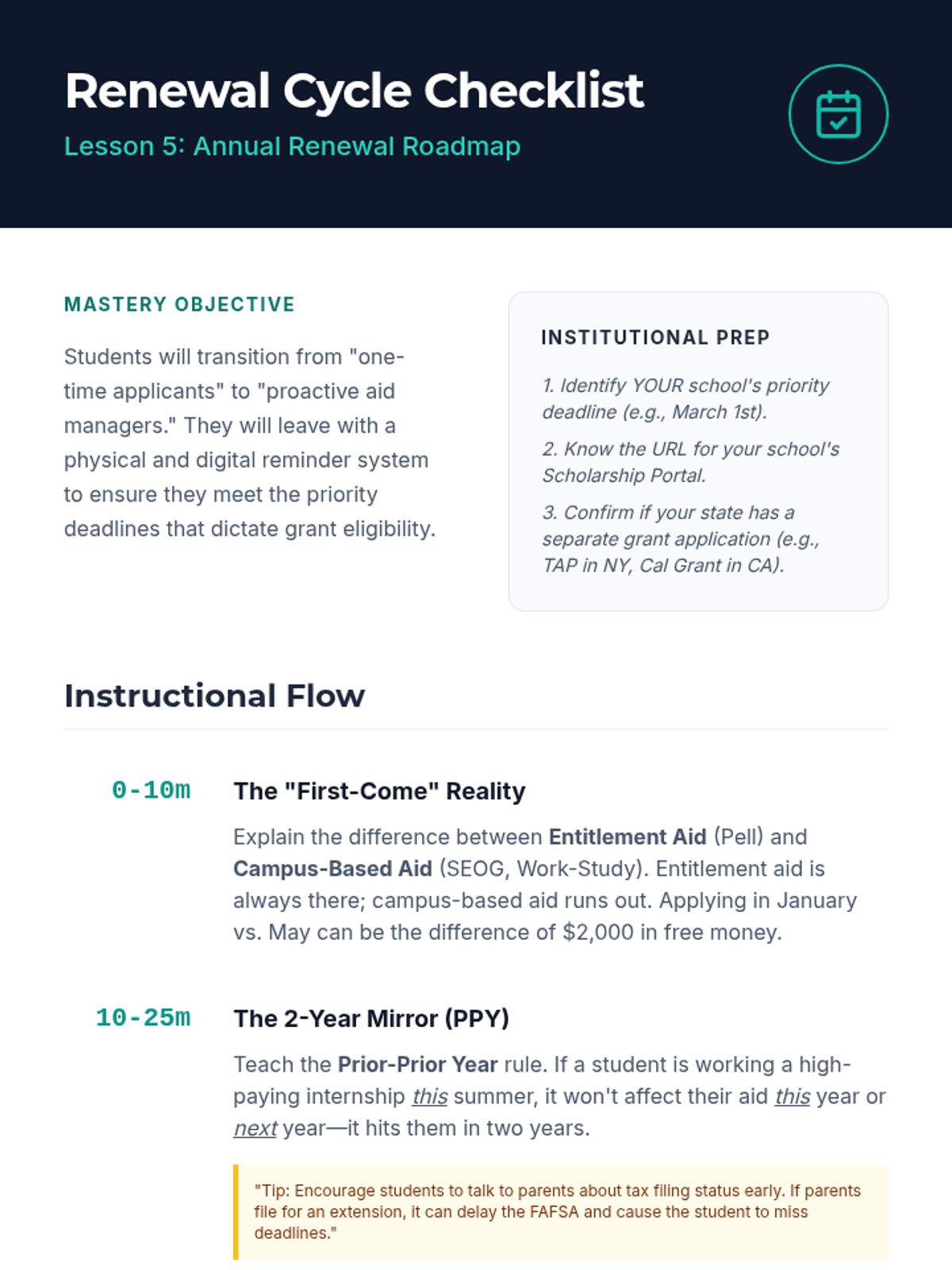 A comprehensive sequence for undergraduate students focusing on the long-term maintenance of federal financial aid eligibility. Students master Satisfactory Academic Progress (SAP), lifetime limits, loan aggregates, withdrawal consequences, and the annual renewal cycle.
