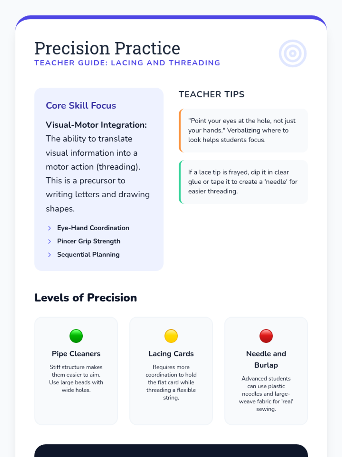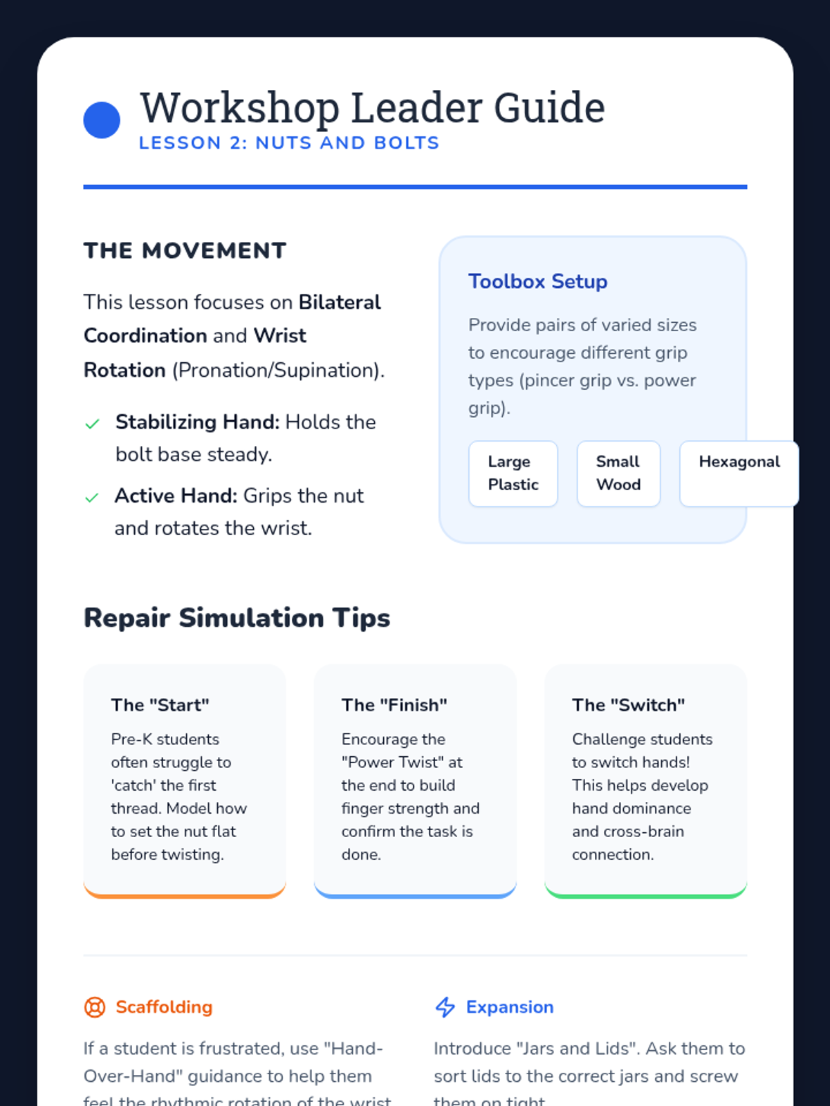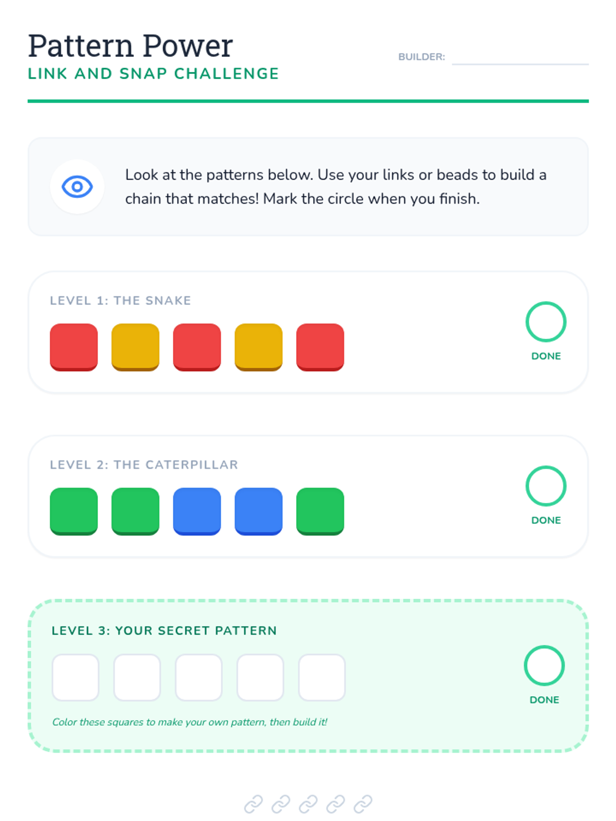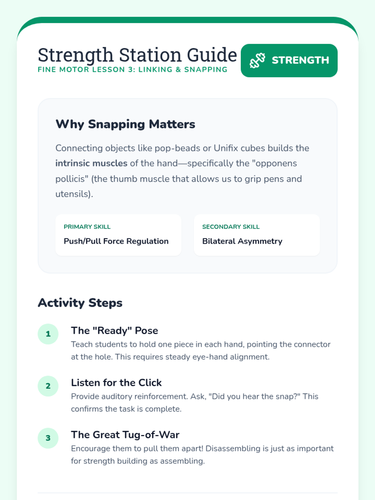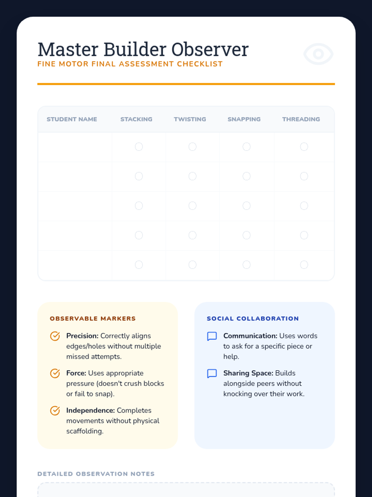 This sequence focuses on developing fine motor skills in Pre-K students through construction-based play. Students will explore stacking, twisting, snapping, and threading to improve dexterity, wrist rotation, and hand-eye coordination.