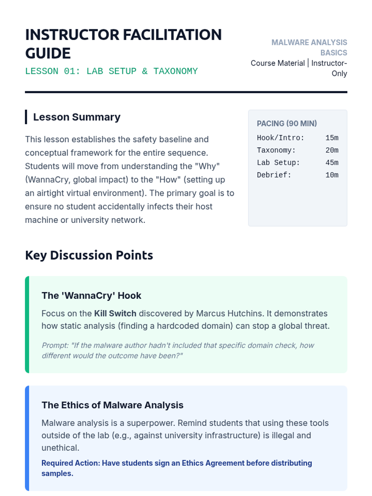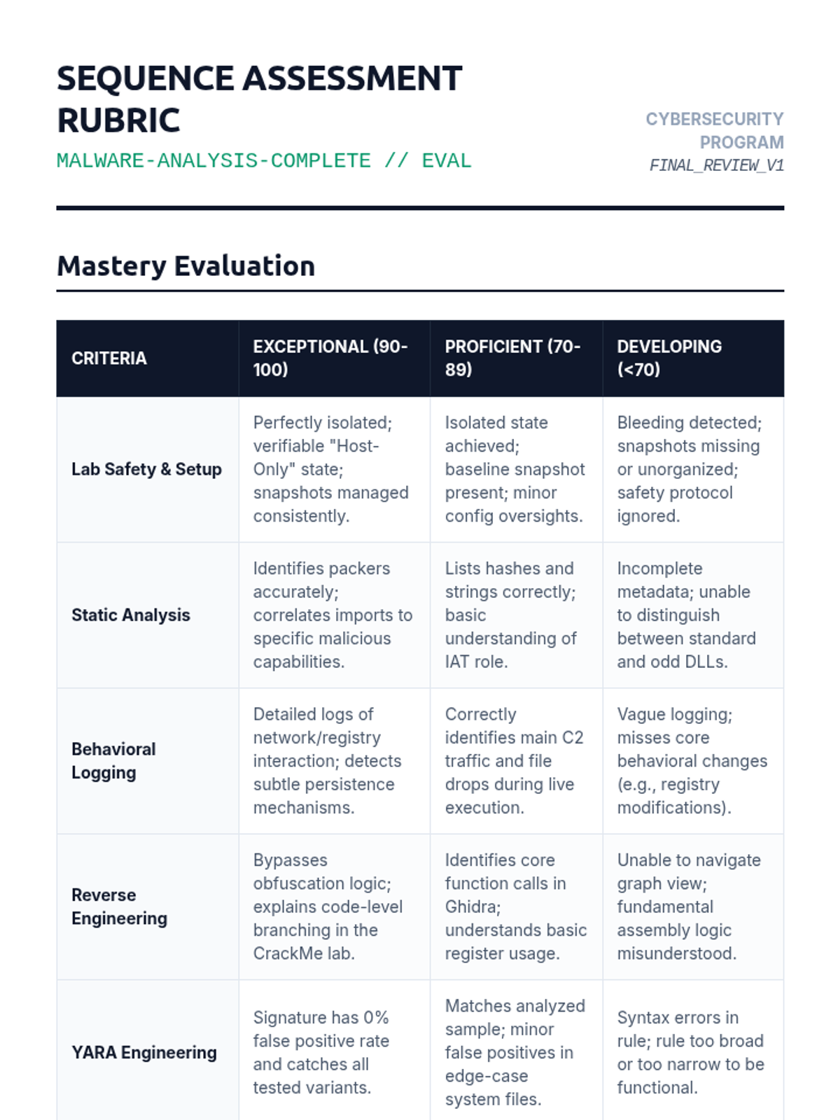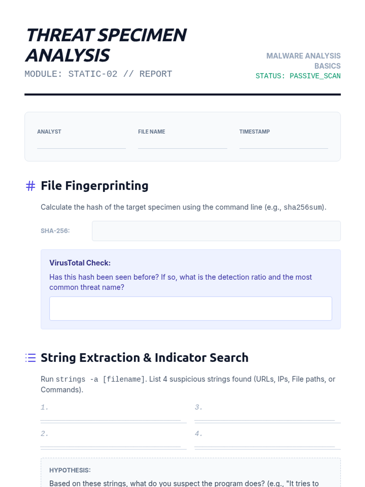 This sequence introduces the methodology of analyzing malicious software to understand its behavior and origin. Students set up isolated lab environments to perform both static analysis (examining code without running it) and dynamic analysis (observing behavior during execution). The arc progresses from identifying file signatures to understanding obfuscation techniques and developing Indicators of Compromise (IOCs).