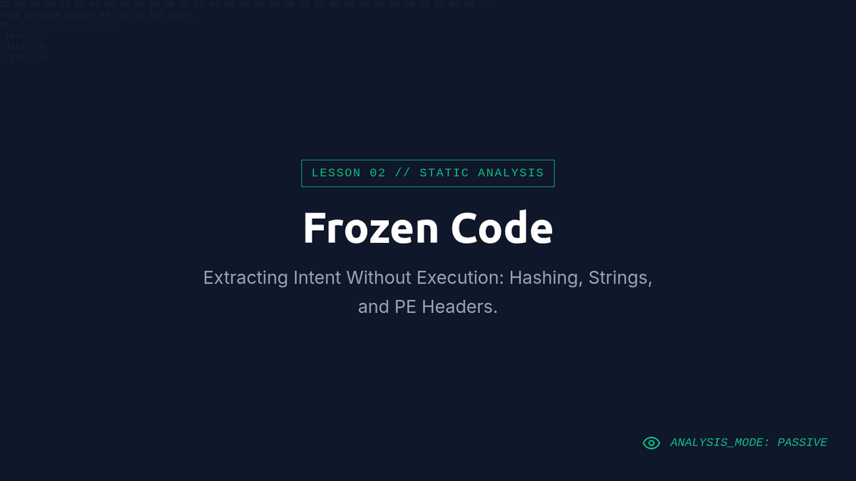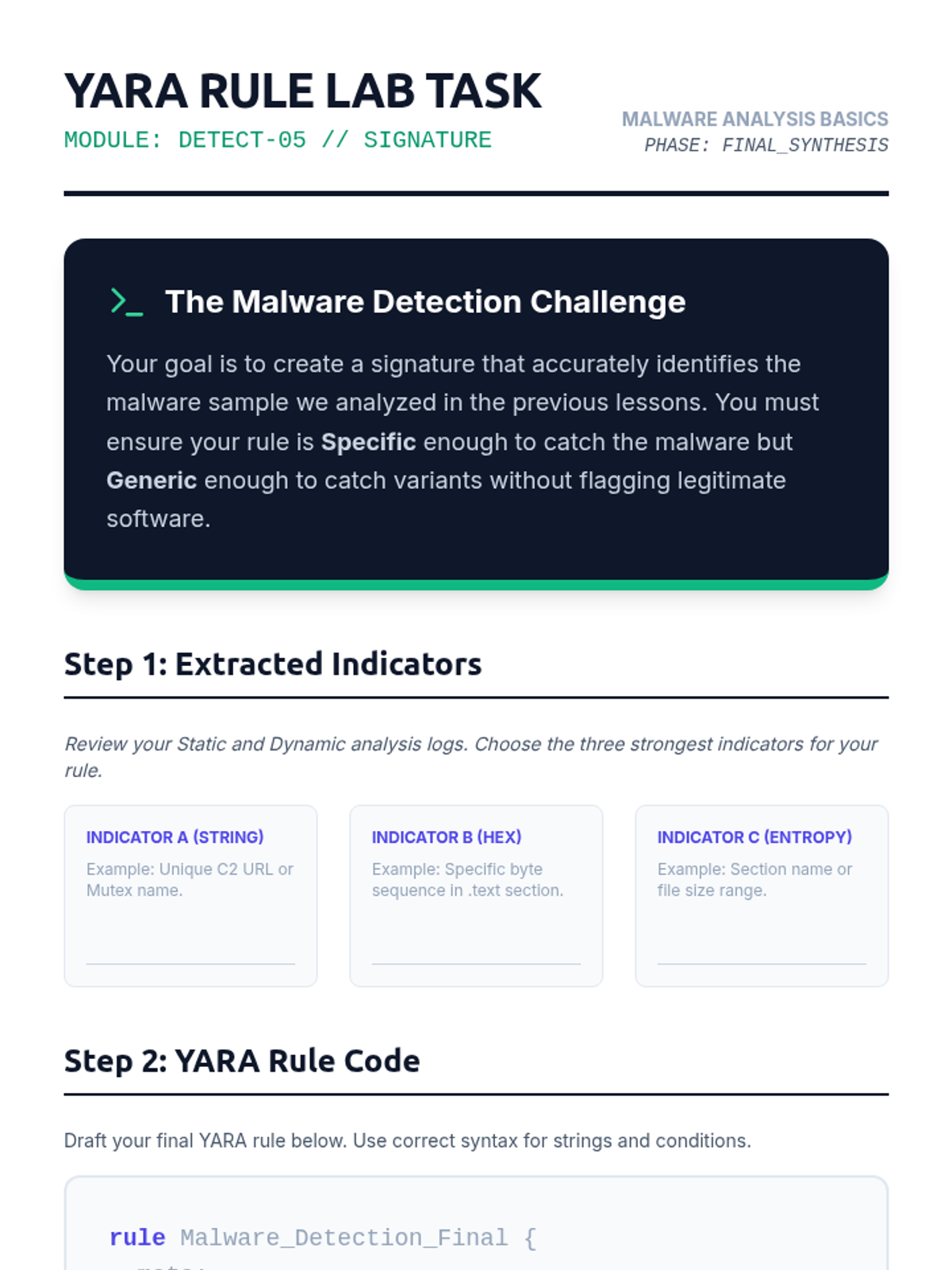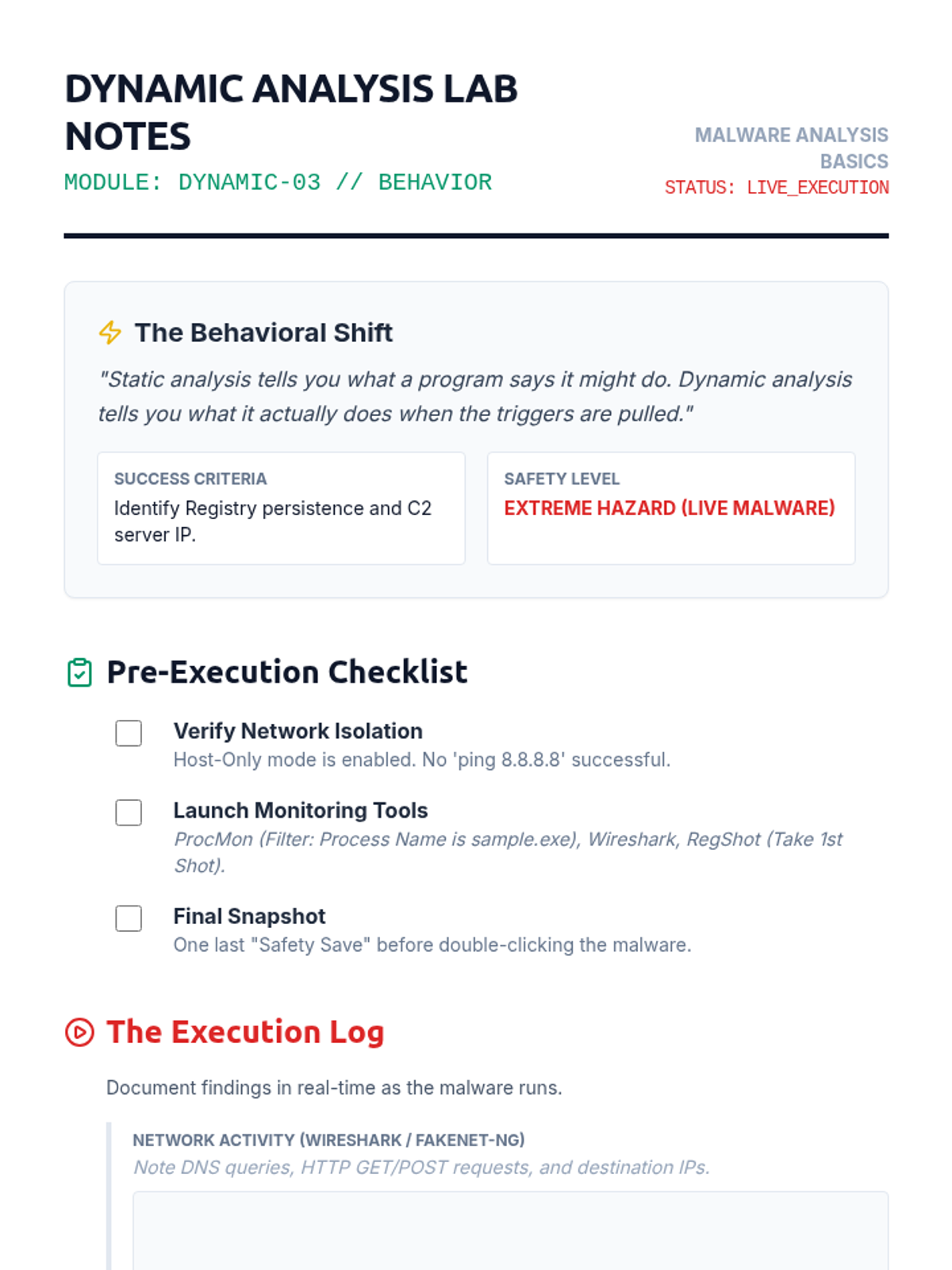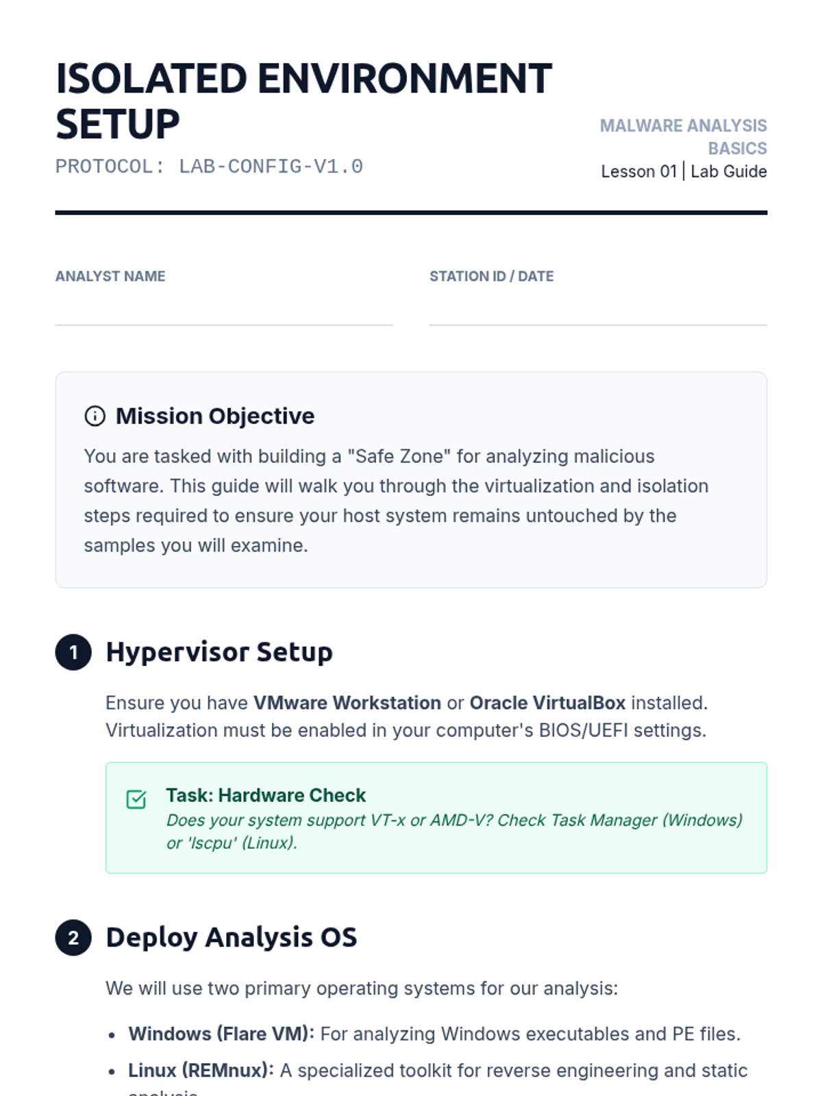 This sequence introduces the methodology of analyzing malicious software to understand its behavior and origin. Students set up isolated lab environments to perform both static analysis (examining code without running it) and dynamic analysis (observing behavior during execution). The arc progresses from identifying file signatures to understanding obfuscation techniques and developing Indicators of Compromise (IOCs).