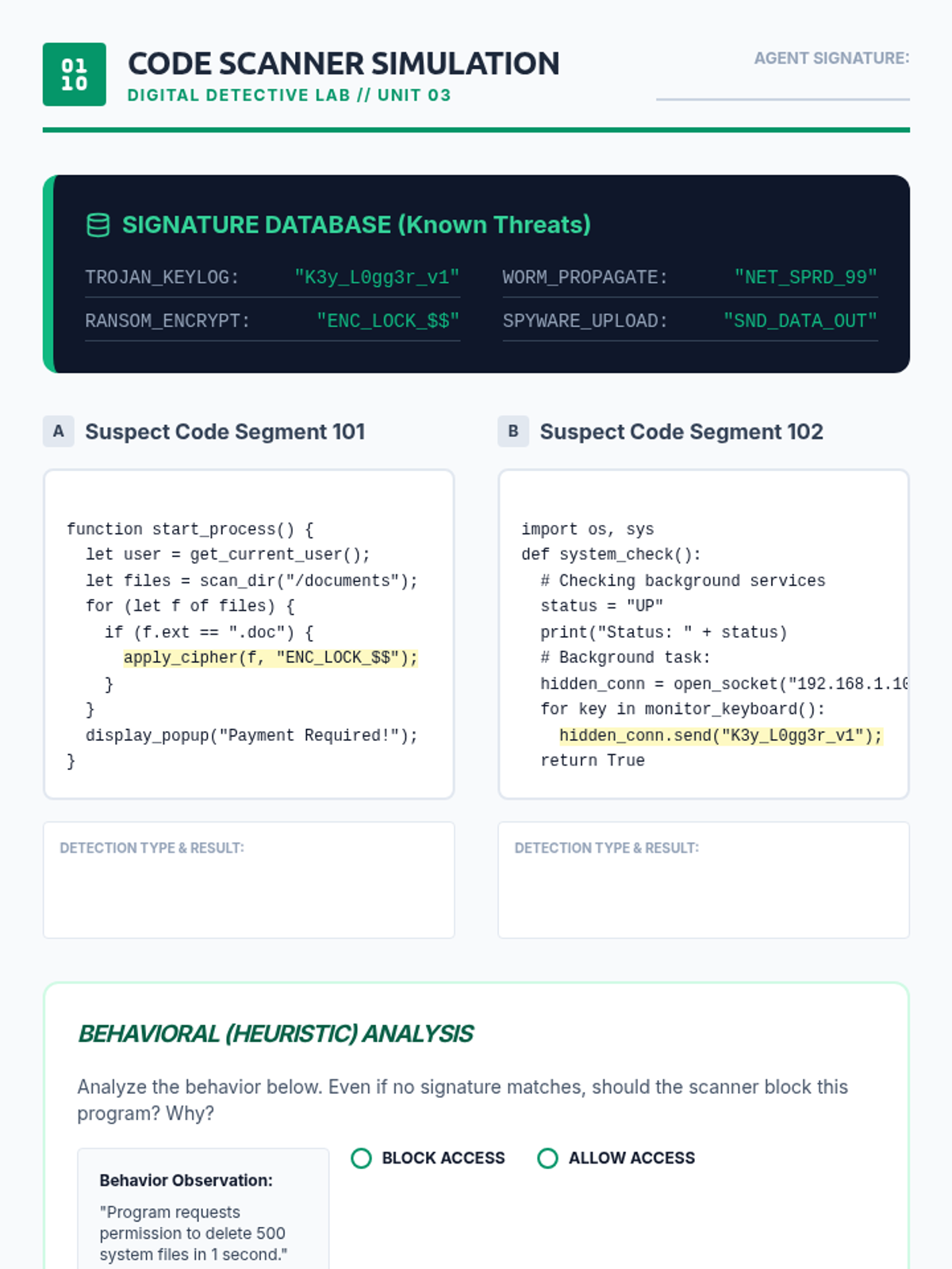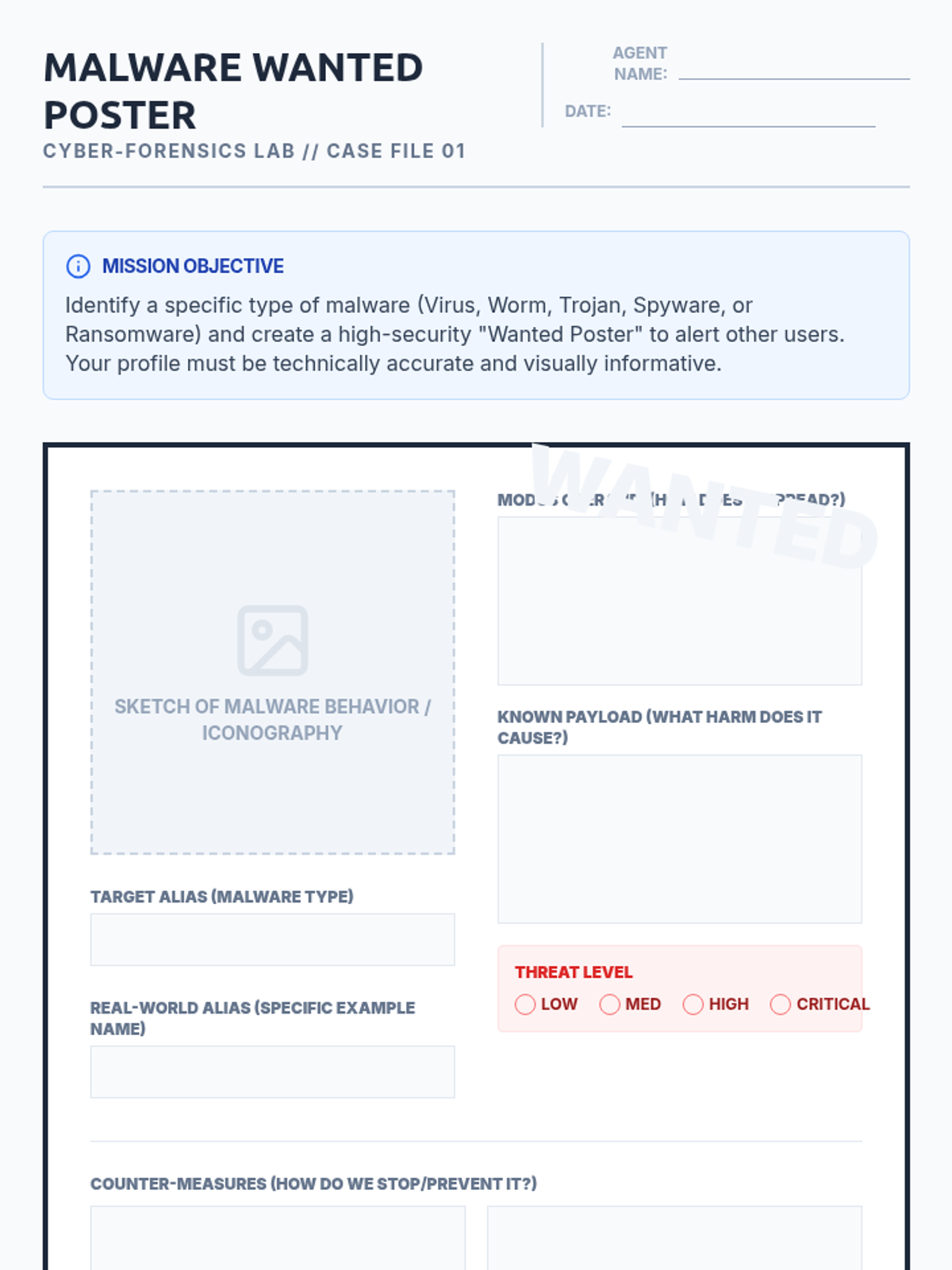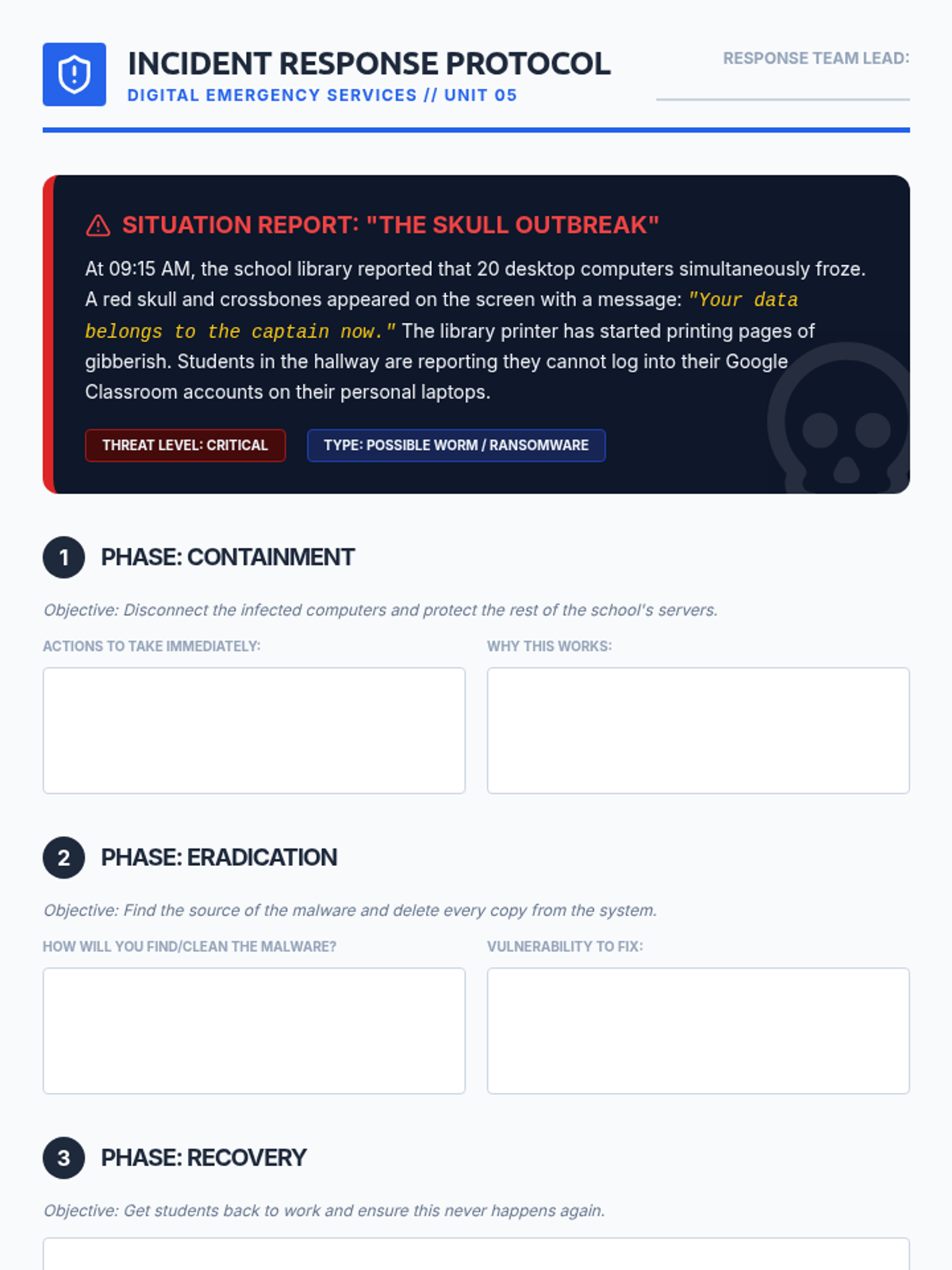 A comprehensive 8th-grade unit on cybersecurity, focusing on malware types, ransomware mechanics, antivirus logic, software vulnerabilities, and incident response planning. Students explore how malicious software operates and develop strategies for threat detection and prevention.