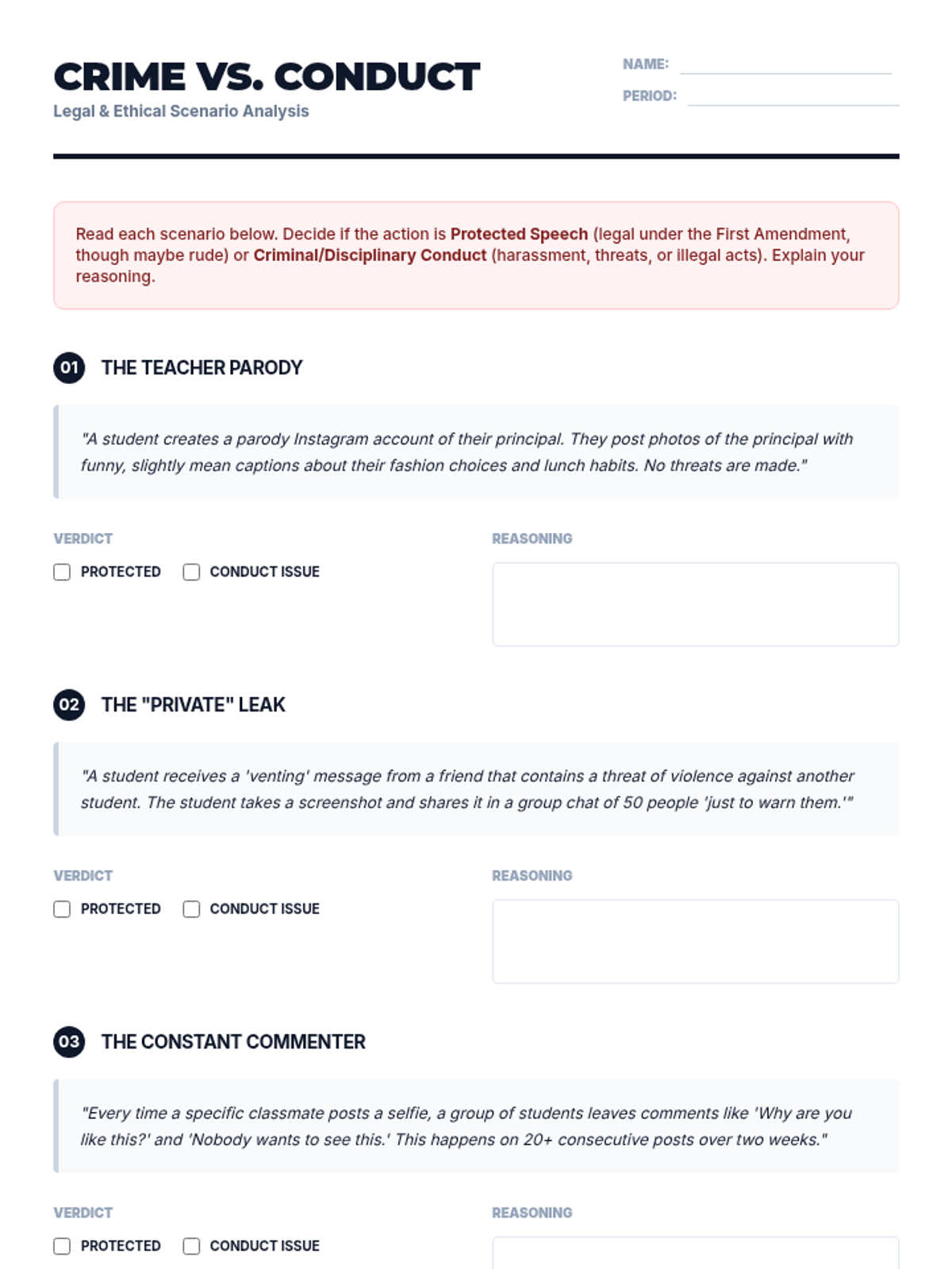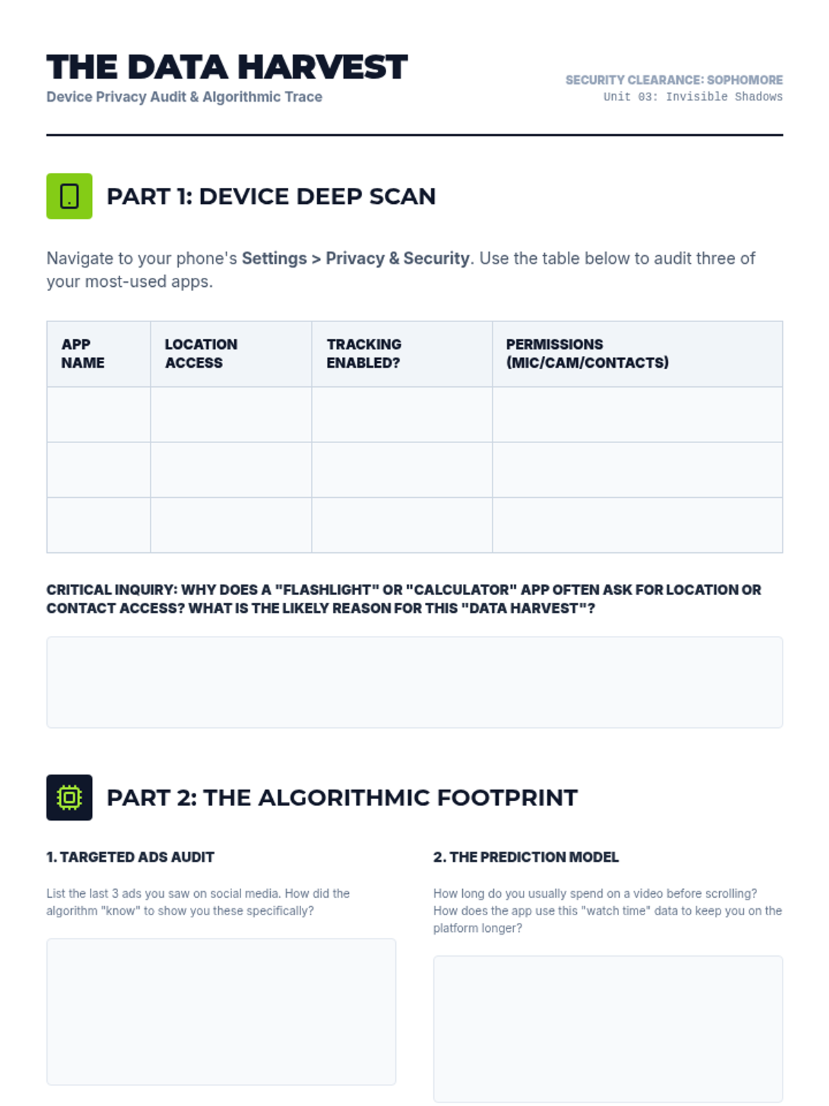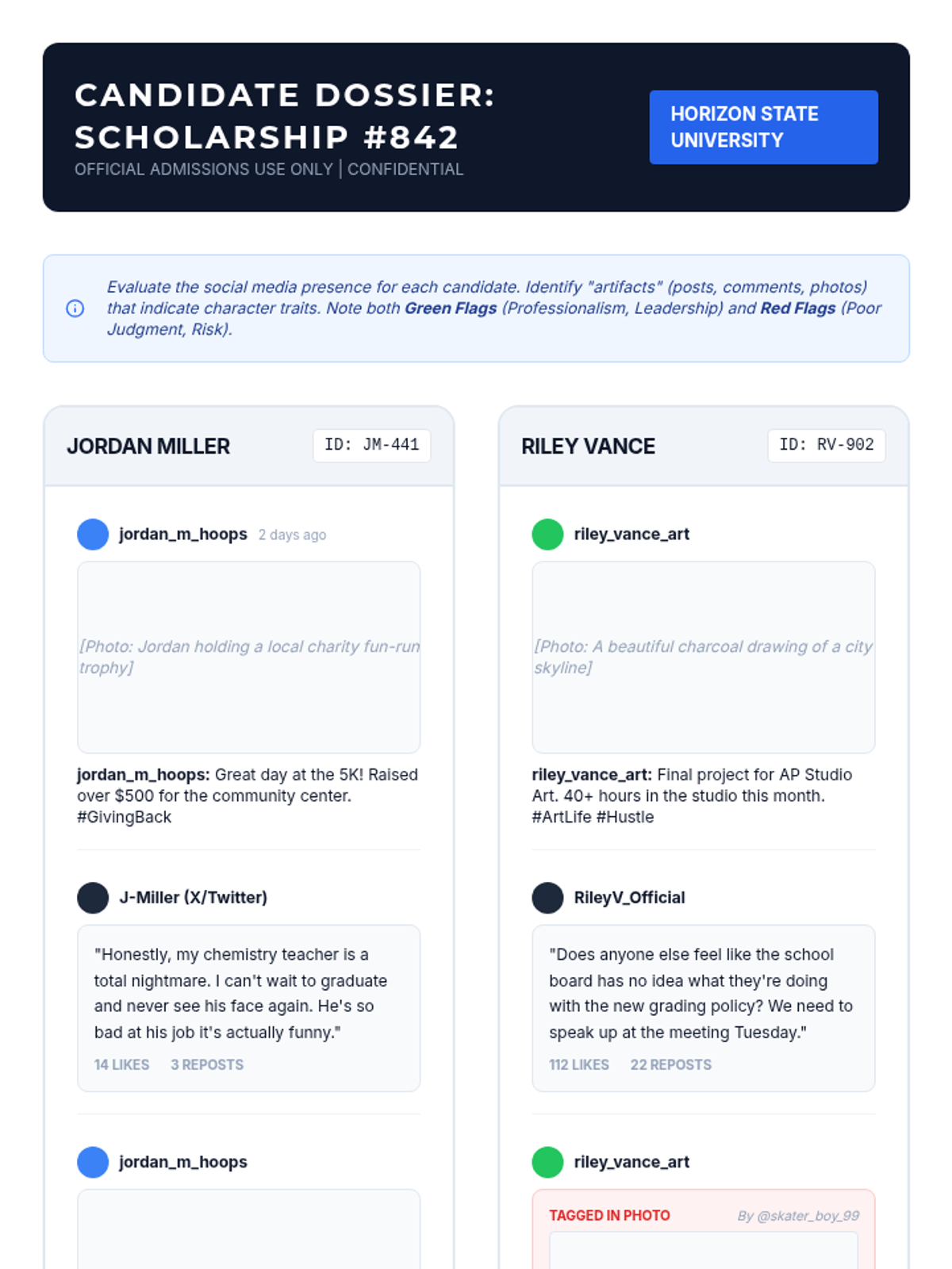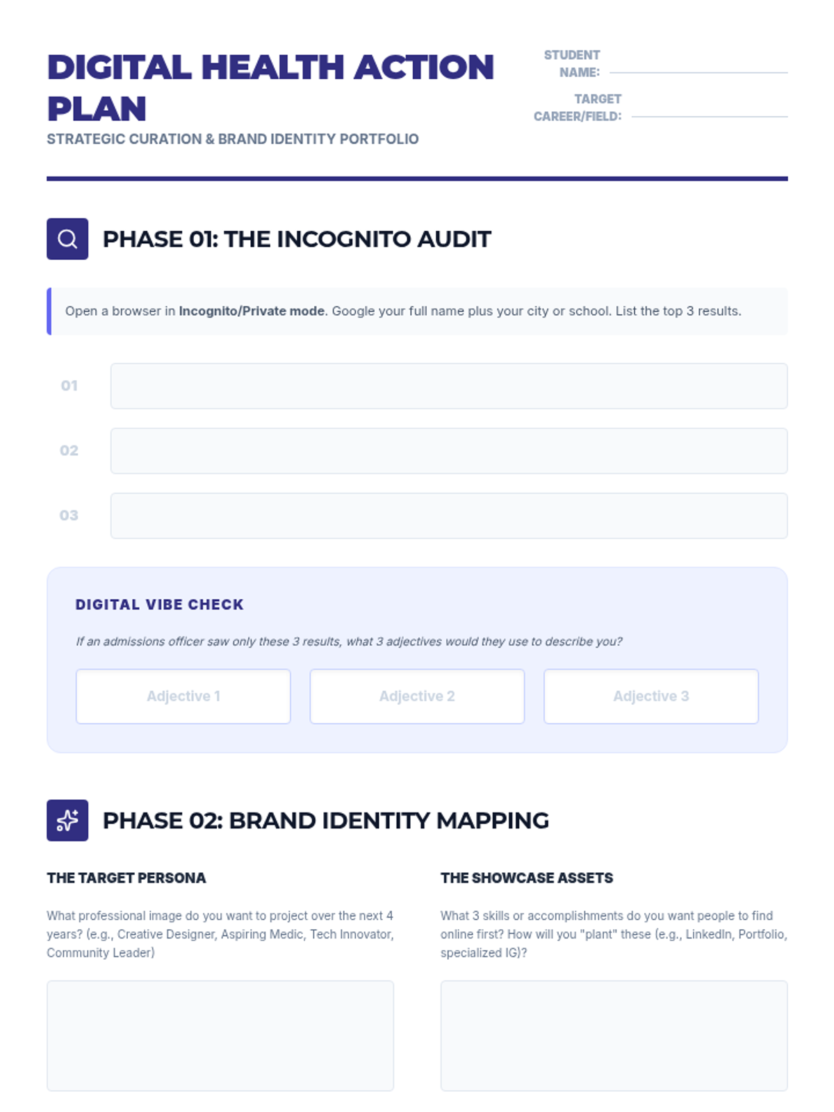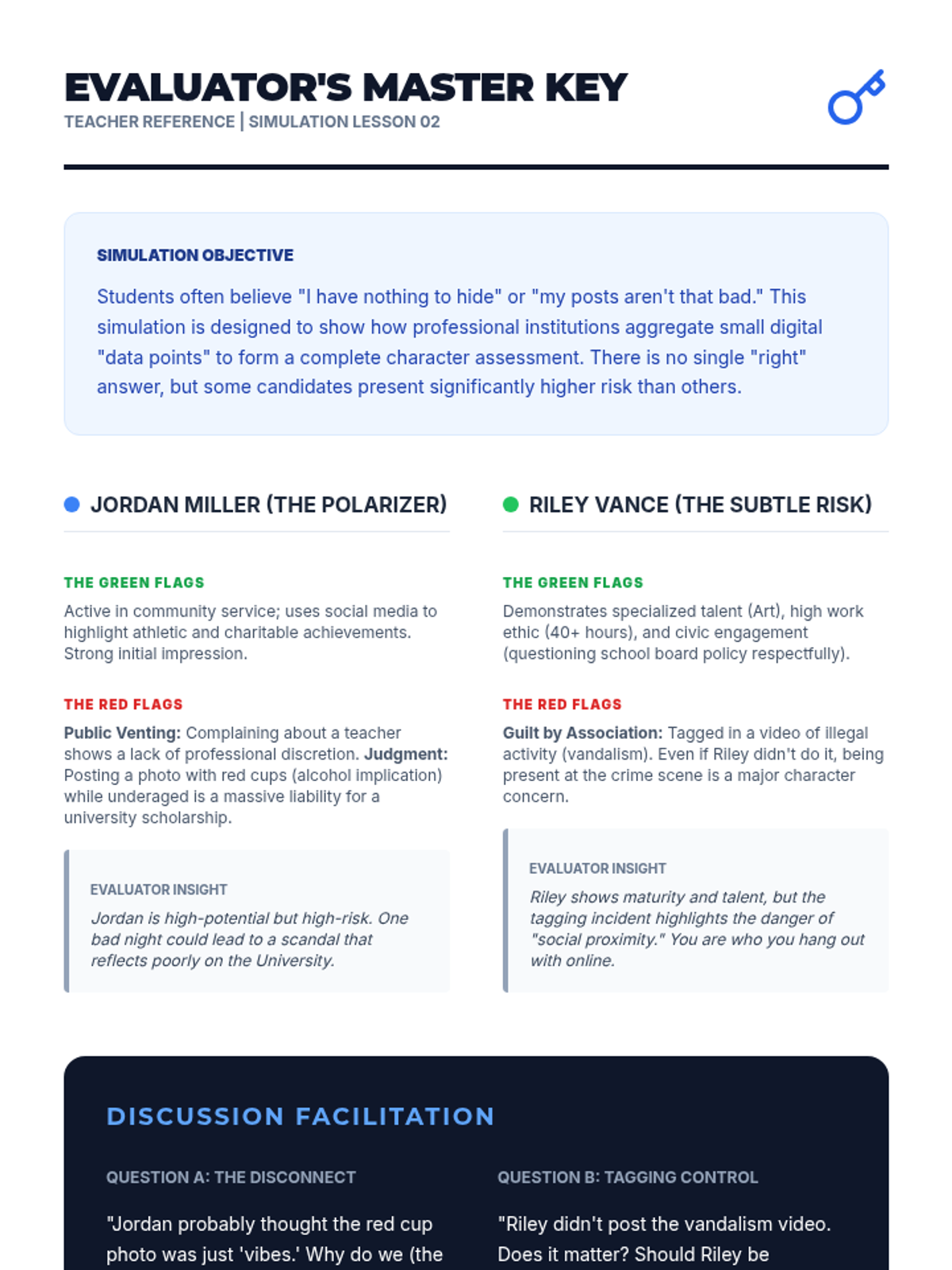 A comprehensive 5-lesson sequence for 10th graders focusing on the long-term implications of digital footprints, data permanence, and proactive reputation management. Students analyze real-world case studies, audit mock social media profiles, and develop a strategic plan for their own positive digital brand.