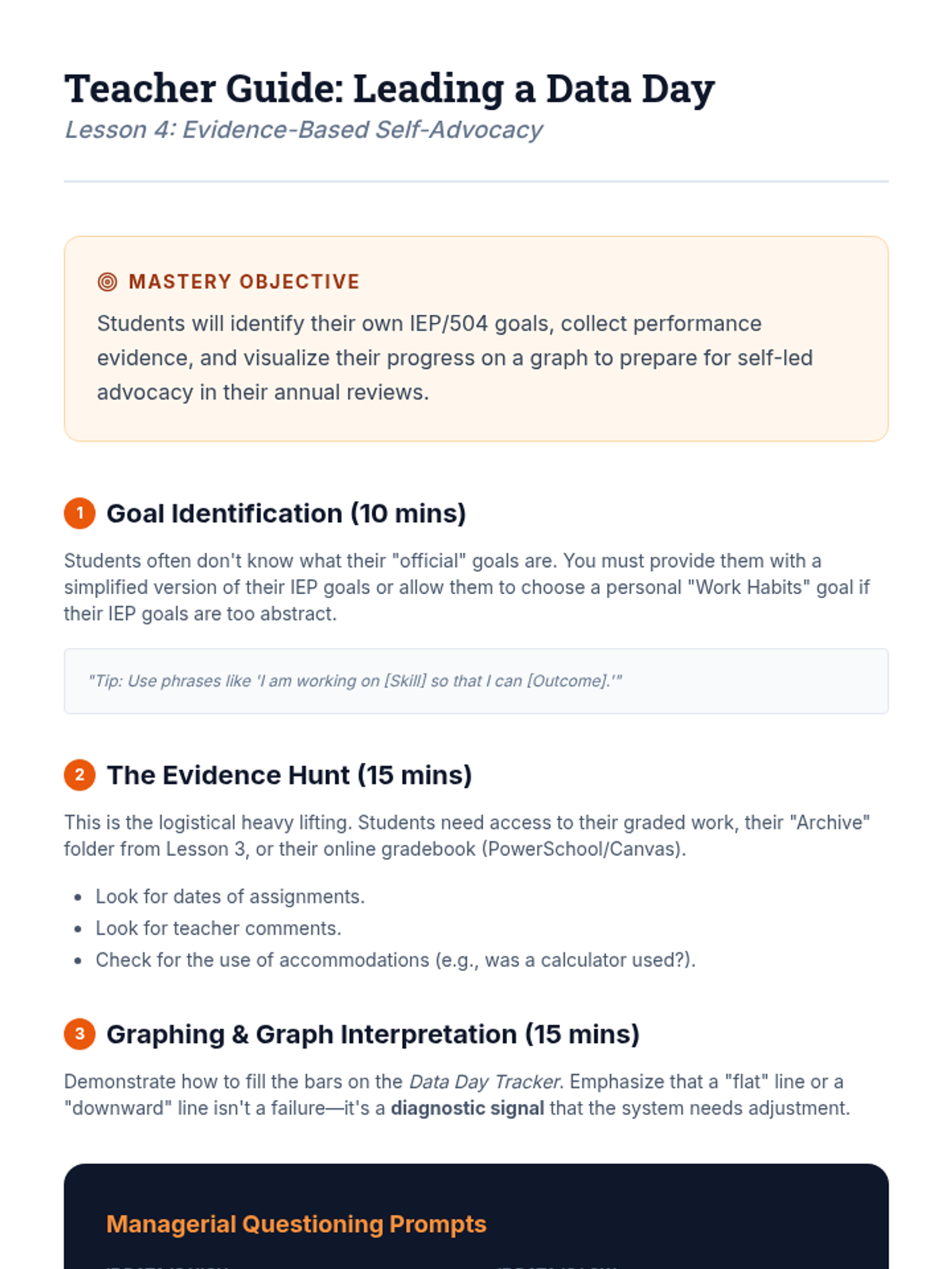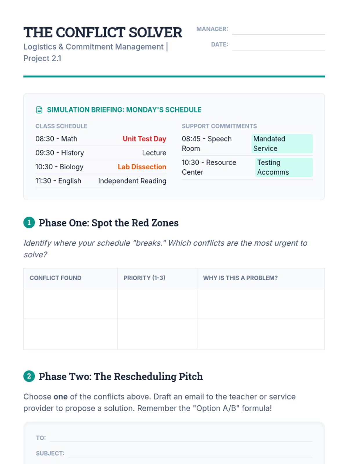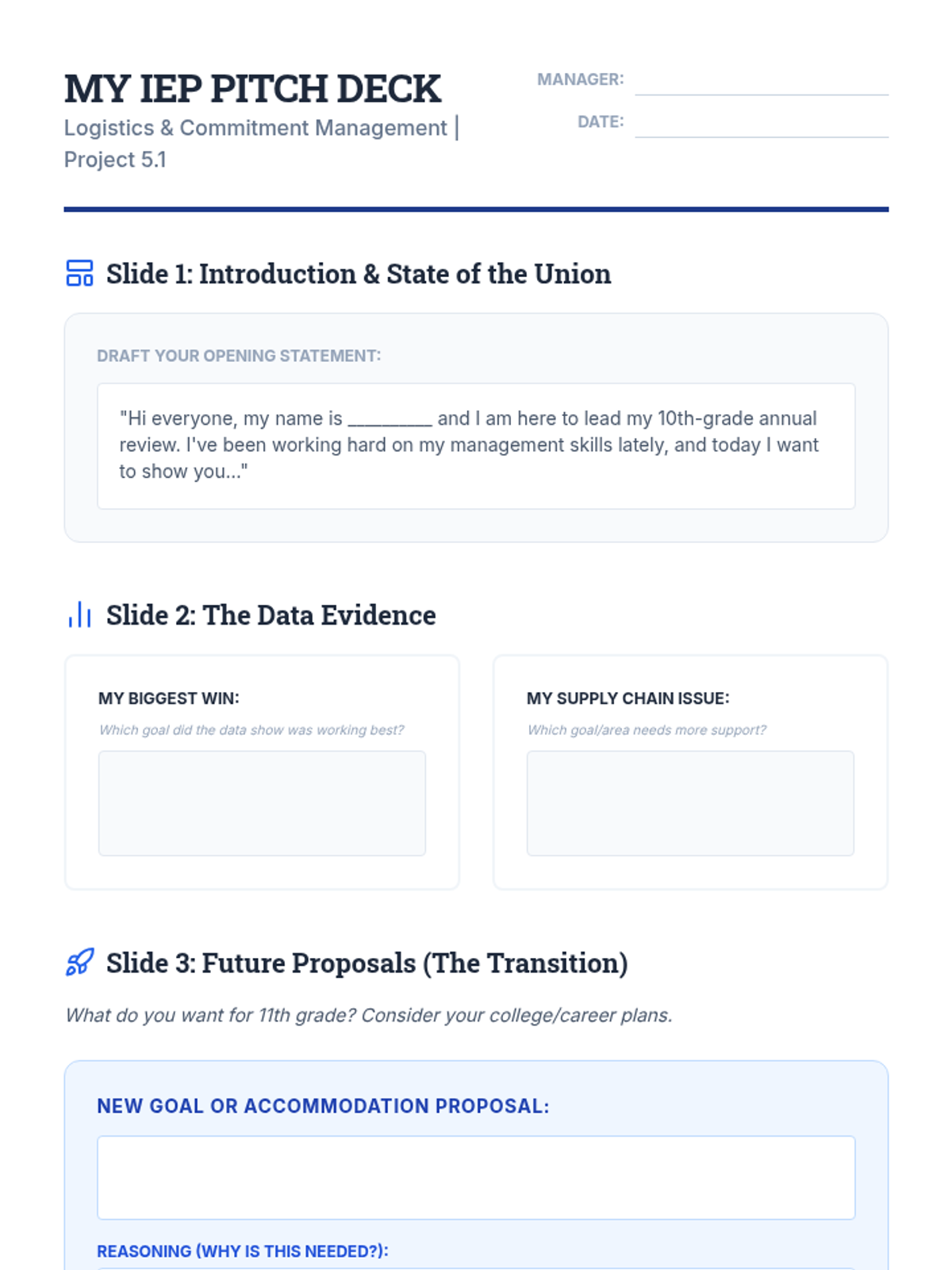 A 10th-grade sequence focused on empowering students to manage their own IEP/504 timelines, accommodations, and administrative responsibilities through the lens of project management. Students transition from passive recipients of services to active managers of their educational milestones.