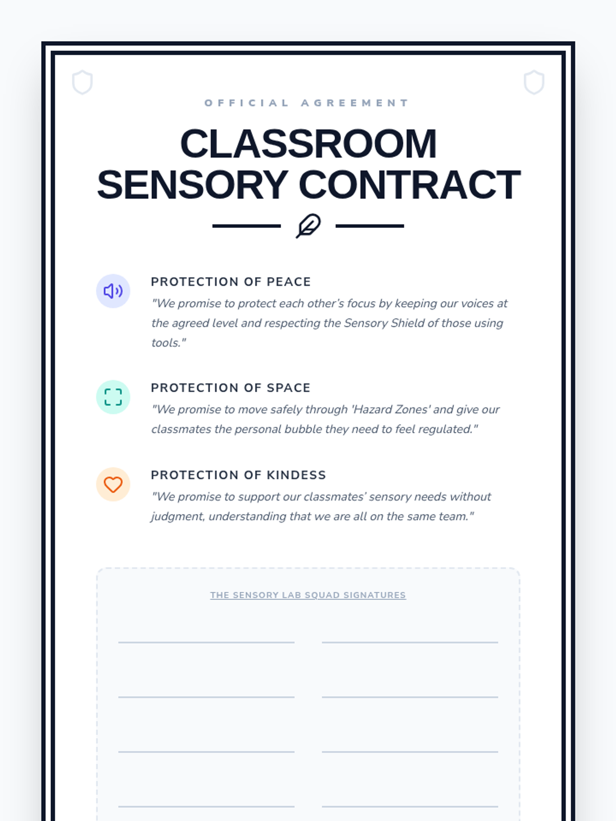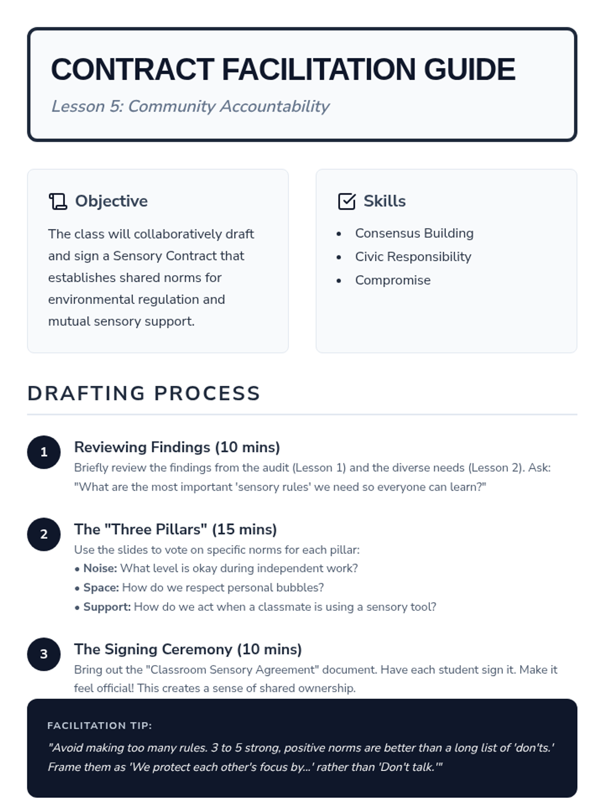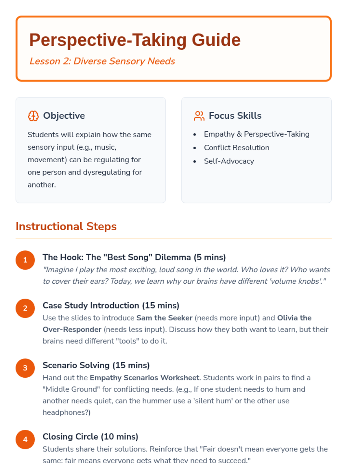 This sequence explores how environmental factors and community interactions impact sensory regulation. Students learn to audit their surroundings, respect diverse sensory needs, practice co-regulation, troubleshoot transitions, and collaboratively create a classroom sensory contract.