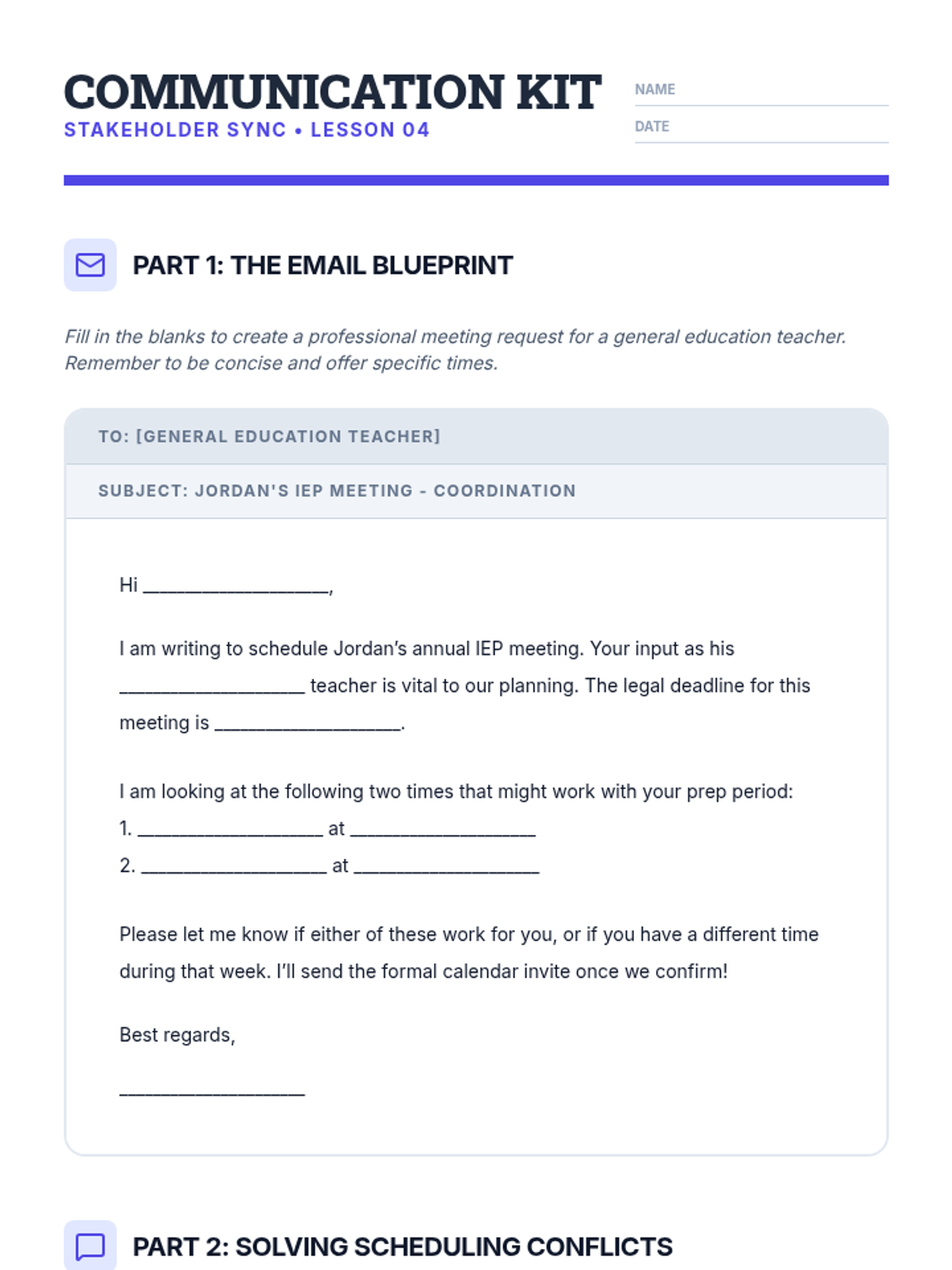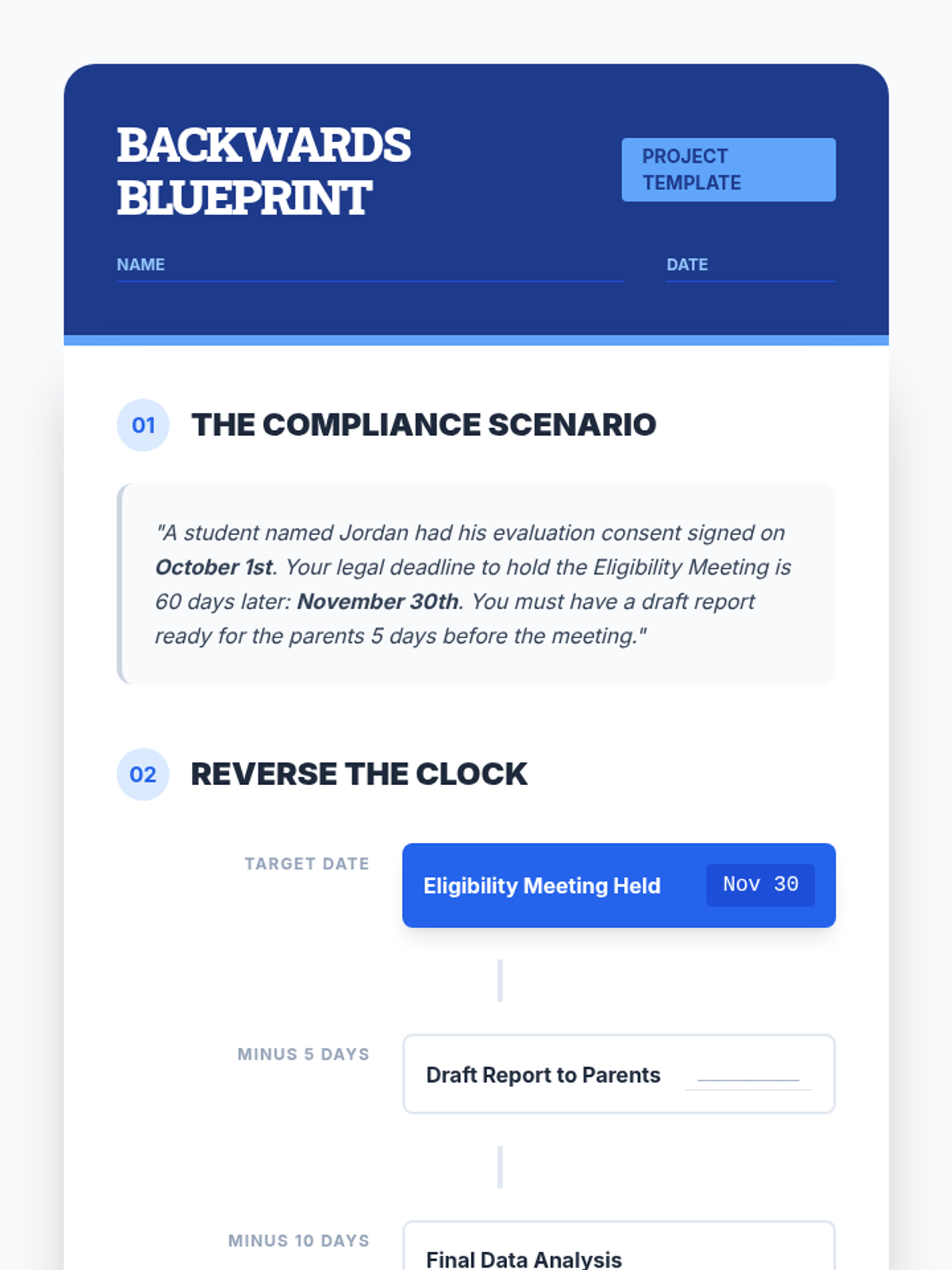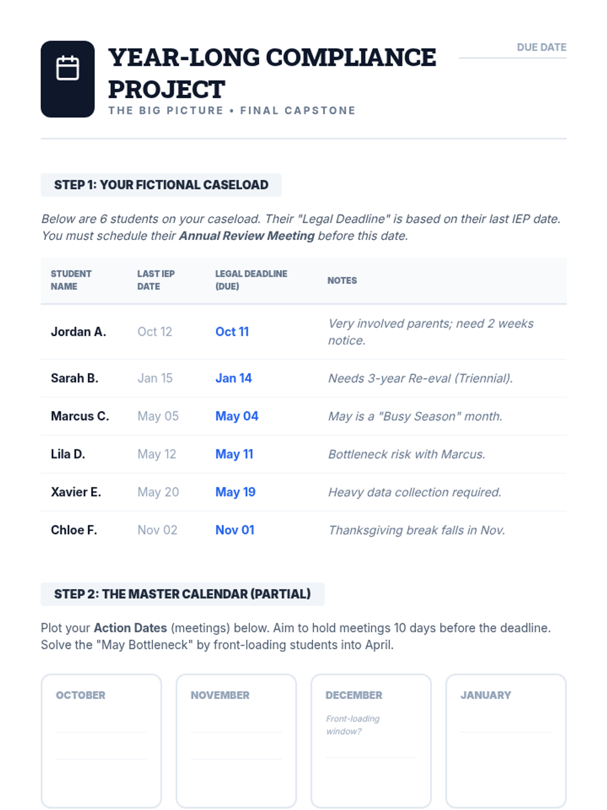 This sequence teaches 11th-grade students the essential skills of long-term project management through the lens of special education compliance. Students will master backwards planning, data collection scheduling, professional communication, and year-long calendar management to ensure legal deadlines are met without burnout.