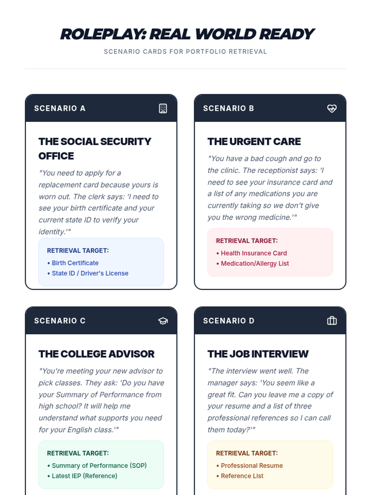 This sequence empowers 12th-grade students to take ownership of their personal, educational, and legal documentation as they transition to adulthood. Students will identify, secure, organize, and utilize essential records to foster independence and self-advocacy.
