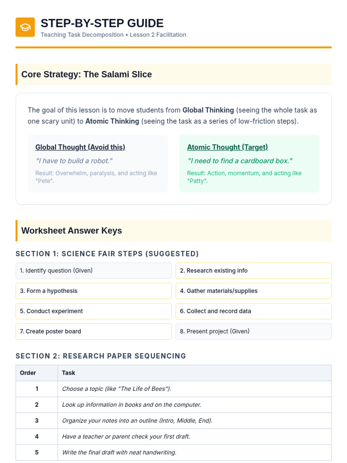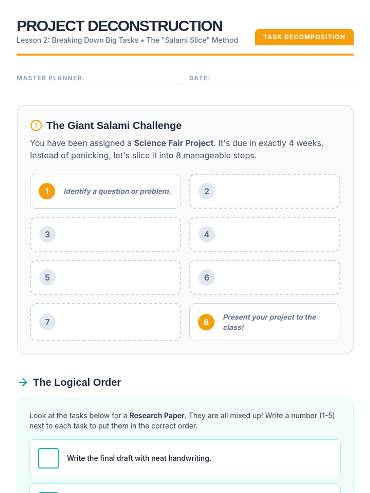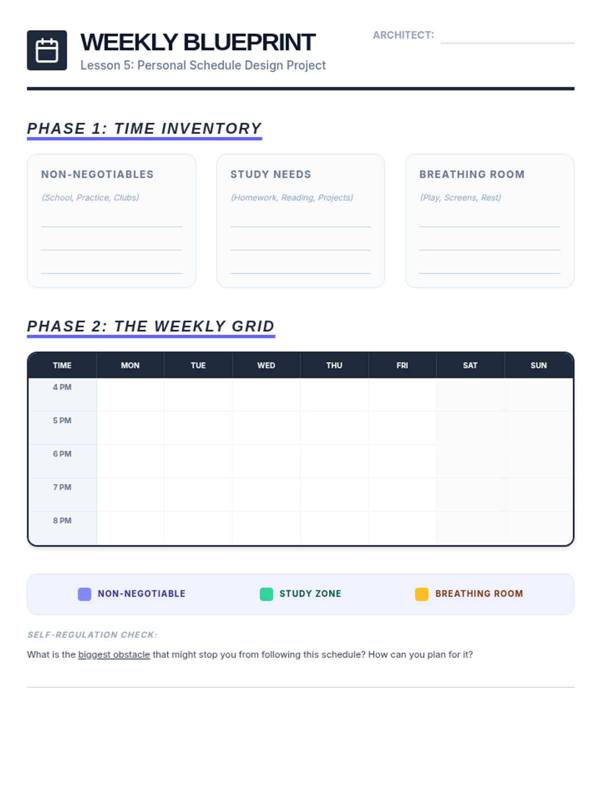 A comprehensive sequence for 5th-grade students focusing on executive function skills, time management, and task organization. Students move from analyzing case studies to creating their own actionable weekly schedules.