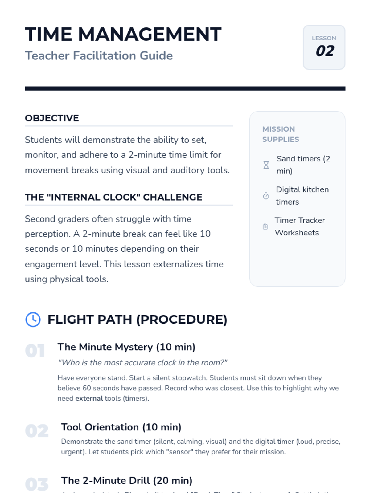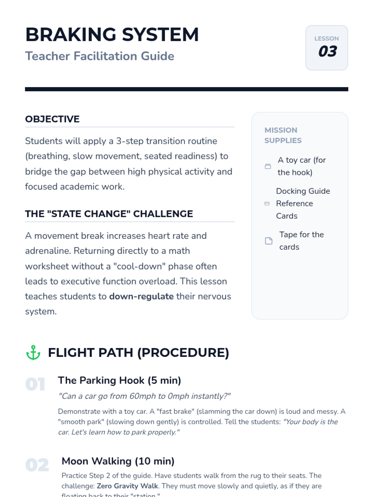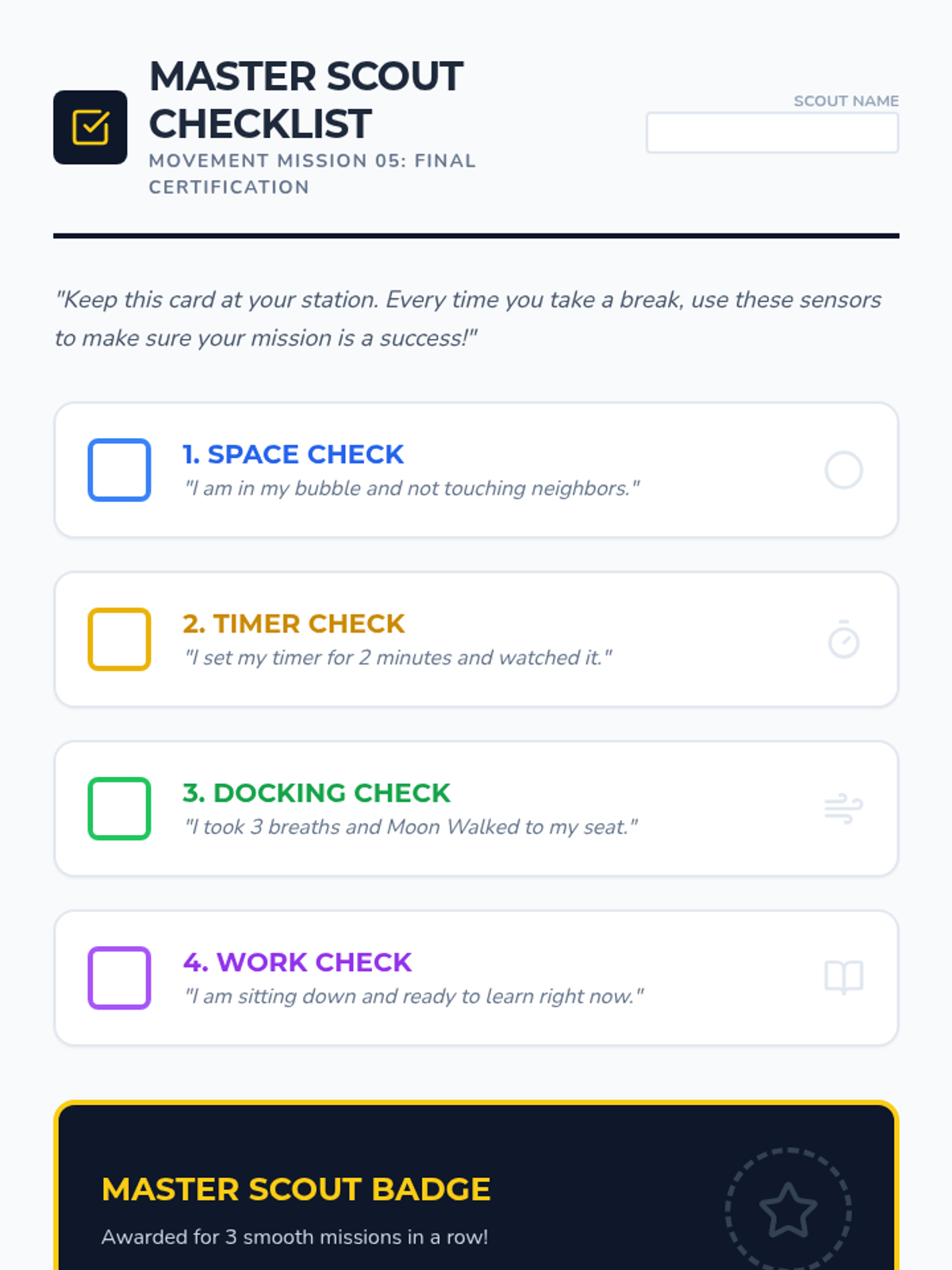 A 5-lesson sequence for 2nd-grade students focusing on the logistics and social responsibility of movement breaks. Students learn spatial awareness, time management using timers, cool-down transitions, and self-reflection to ensure breaks are effective and respectful.