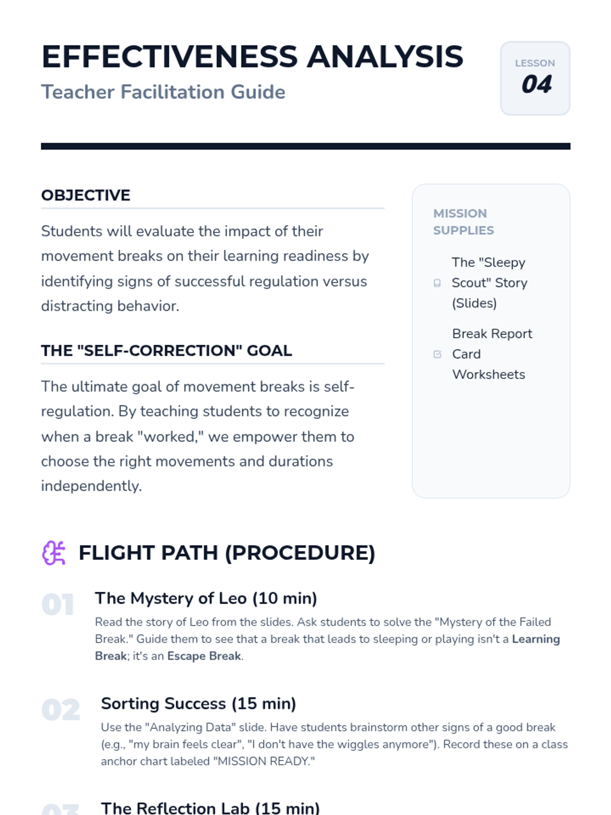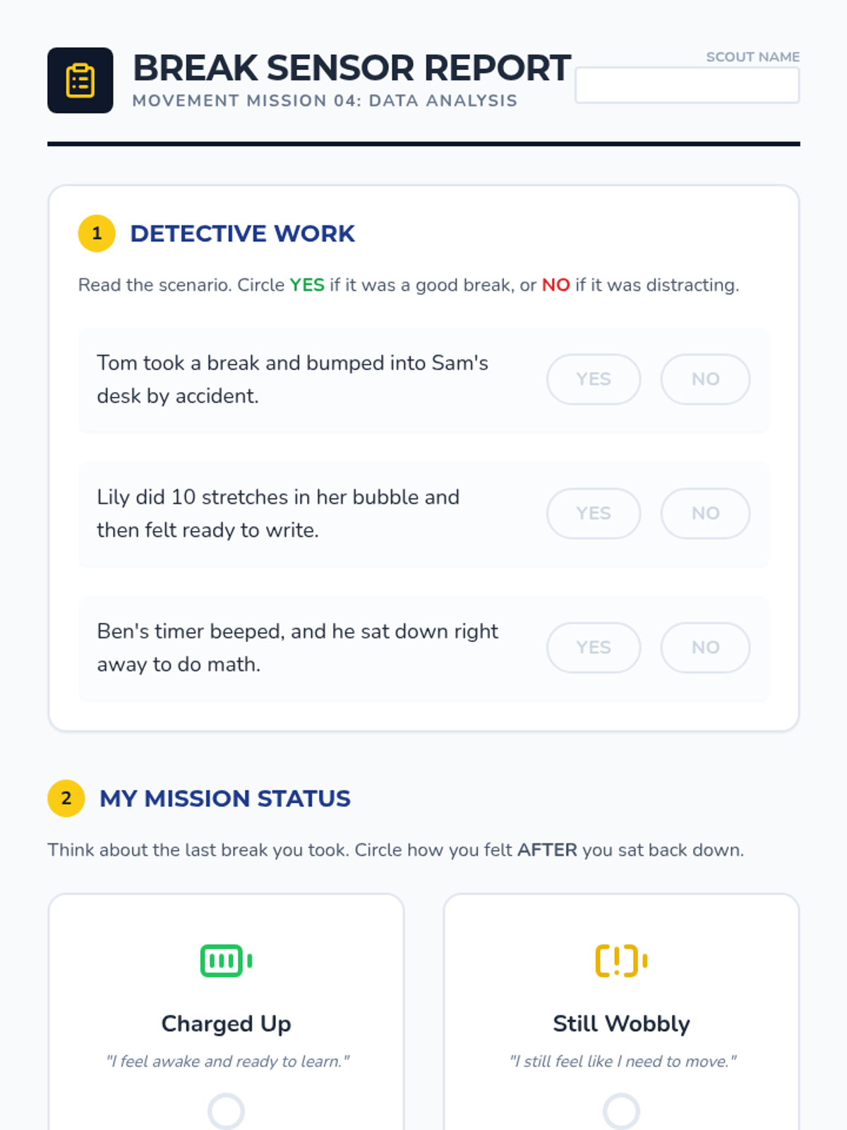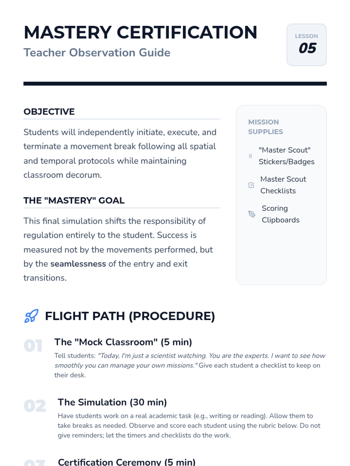A 5-lesson sequence for 2nd-grade students focusing on the logistics and social responsibility of movement breaks. Students learn spatial awareness, time management using timers, cool-down transitions, and self-reflection to ensure breaks are effective and respectful.