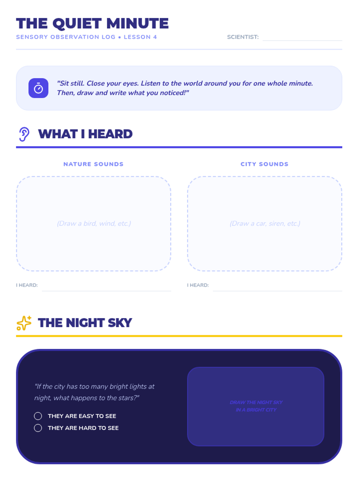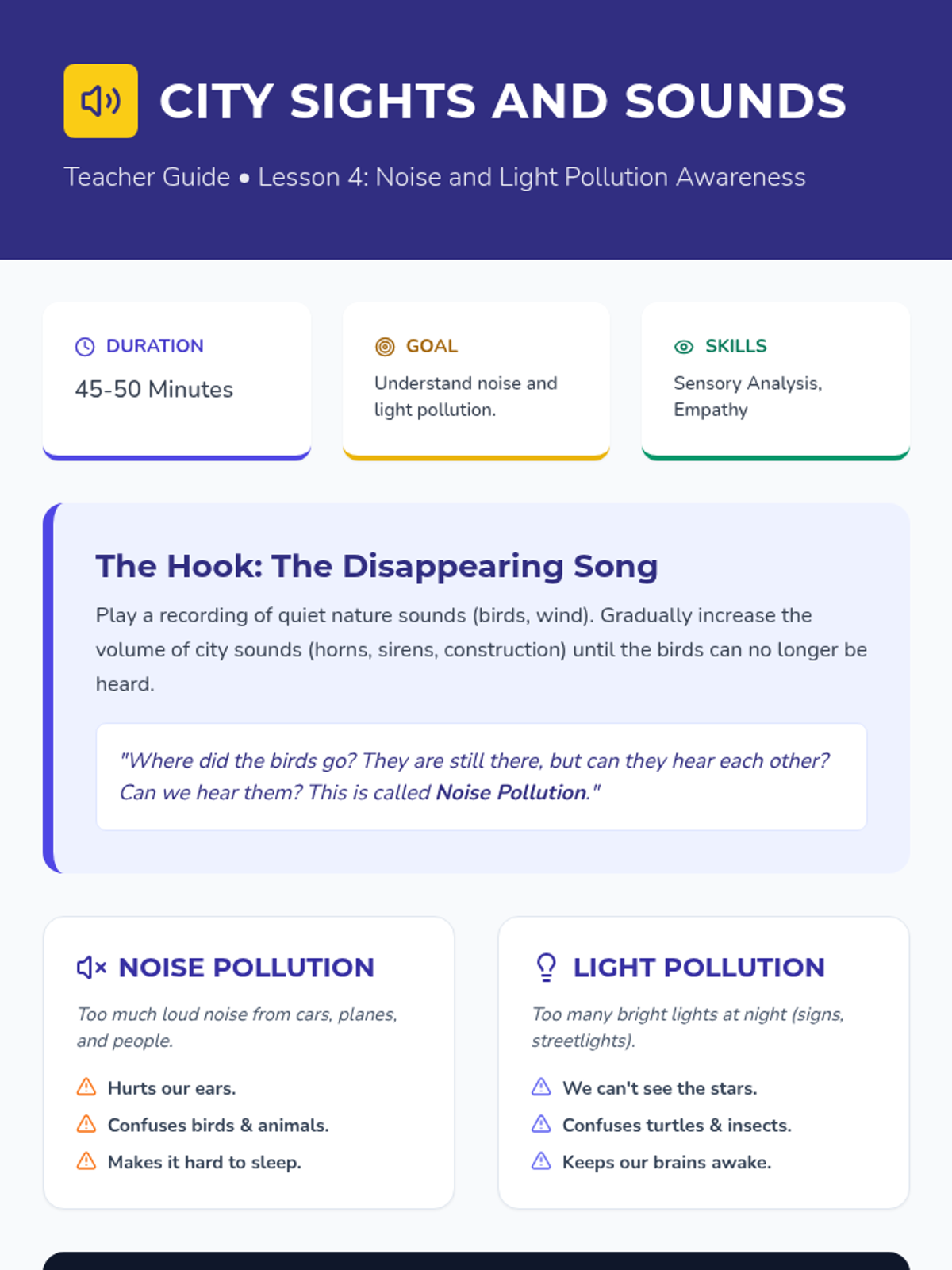 An inquiry-based exploration of how cities interact with the natural environment. Students investigate man-made vs. natural features, waste management, green spaces, and urban pollution to design a sustainable city of the future.
