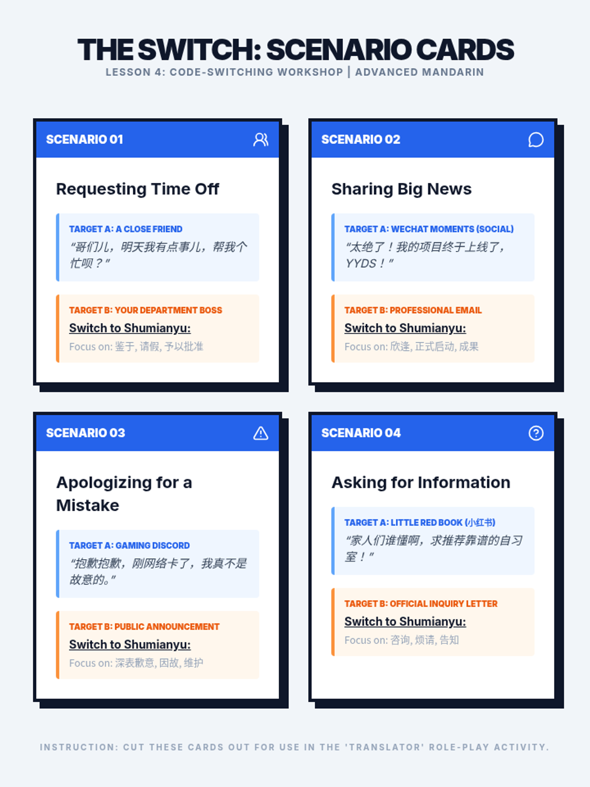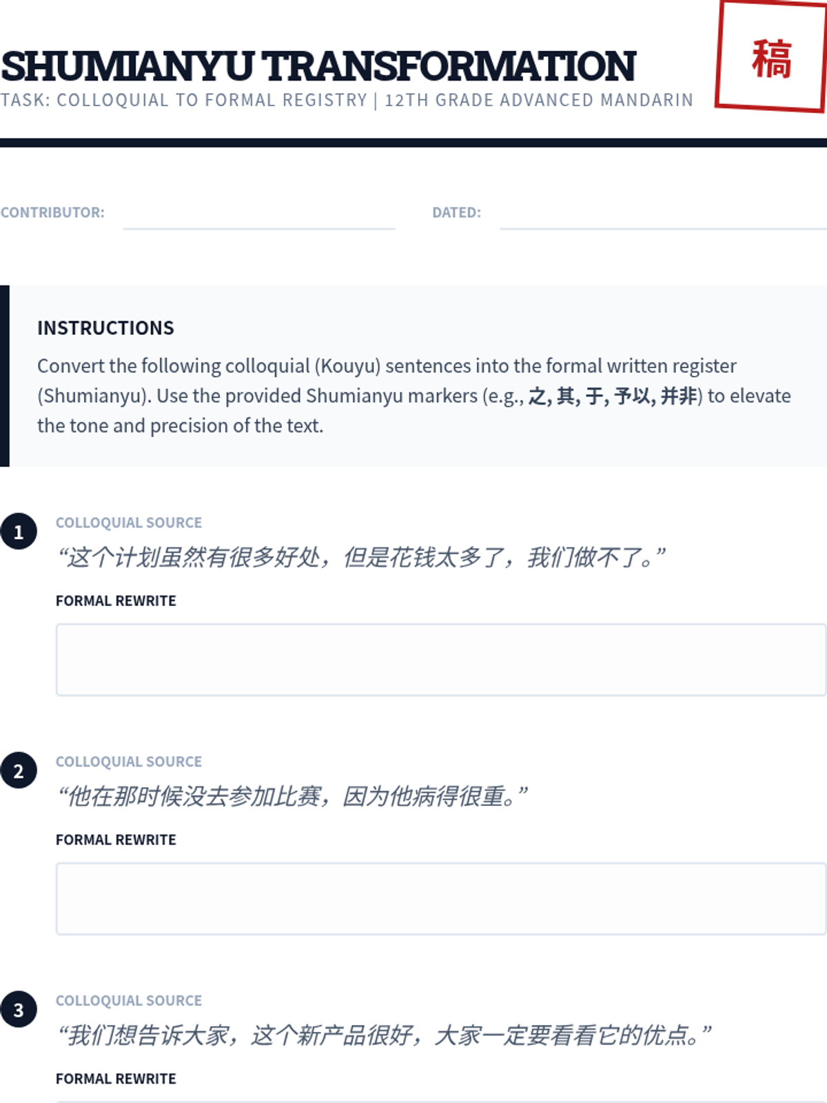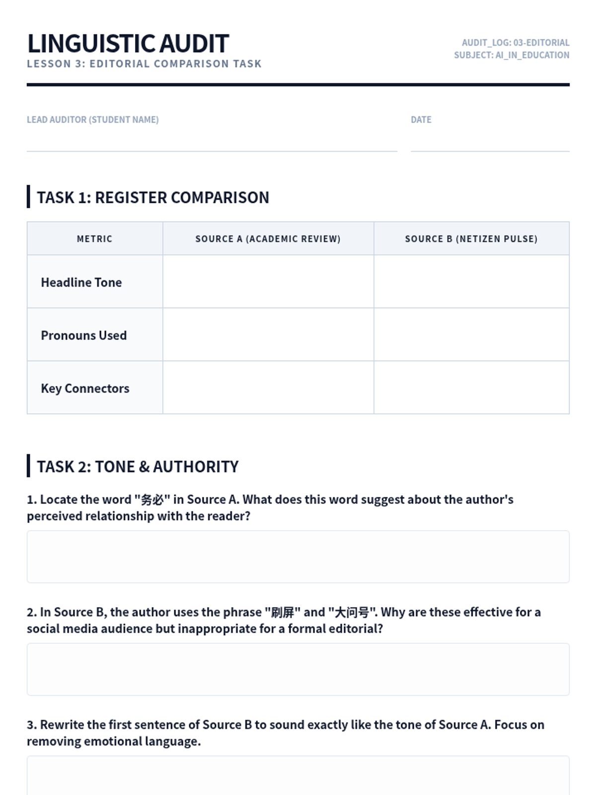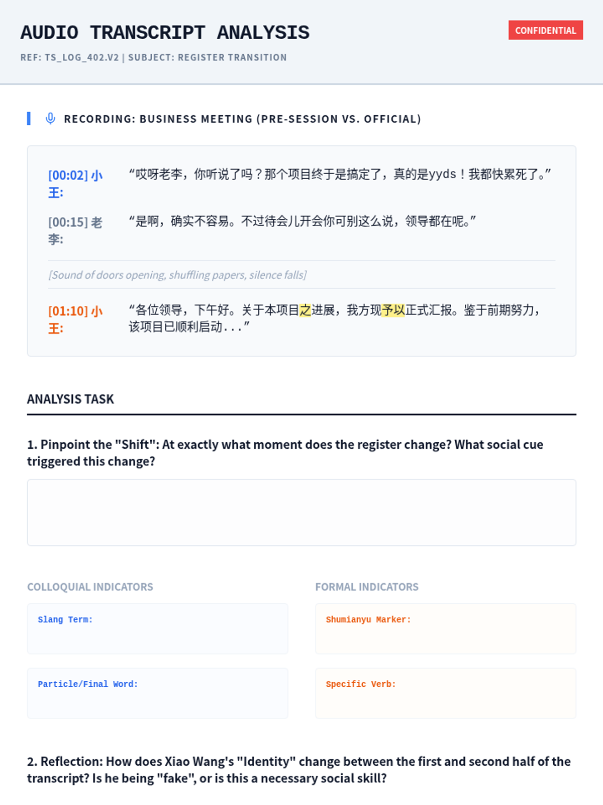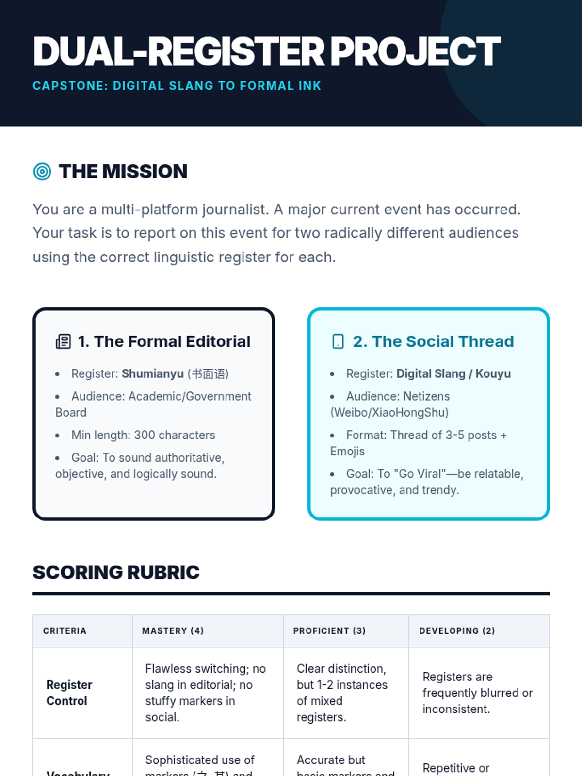 A 12th-grade Advanced Mandarin Chinese unit exploring the linguistic divide between digital netizen slang and formal academic/journalistic writing. Students develop code-switching proficiency by analyzing social media trends, mastering formal grammatical markers, and producing content for diverse audiences.
