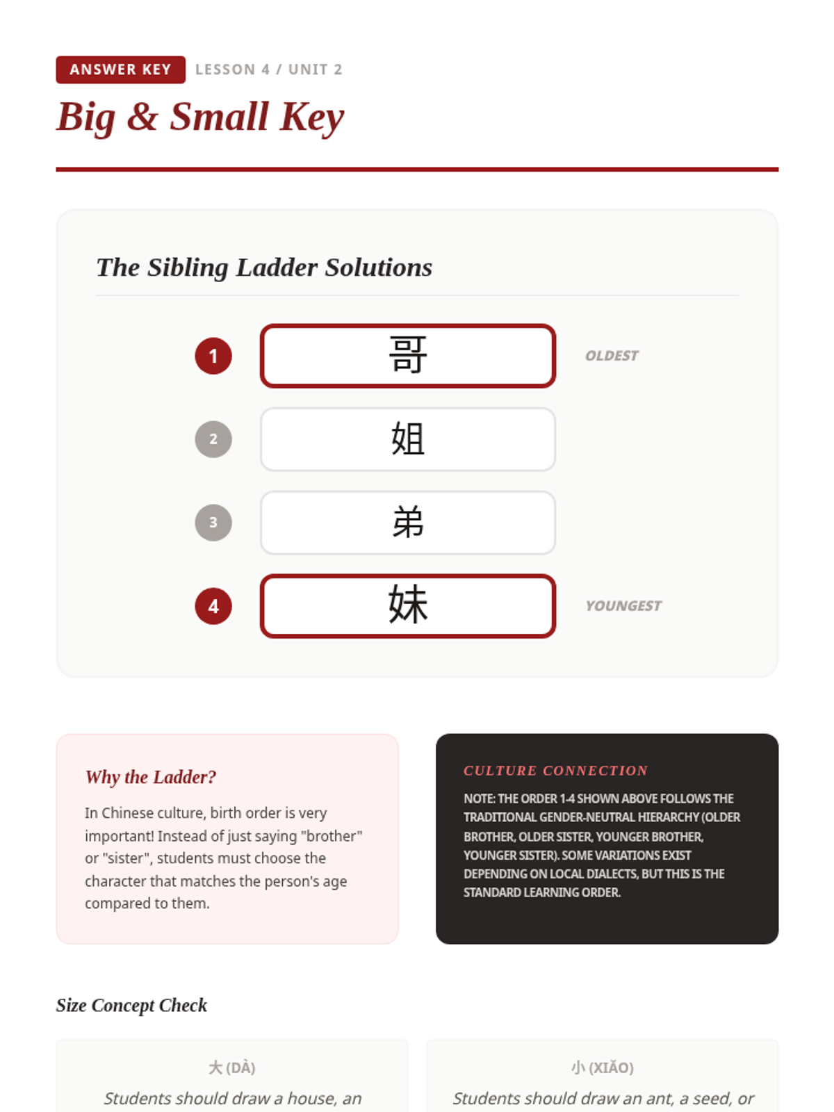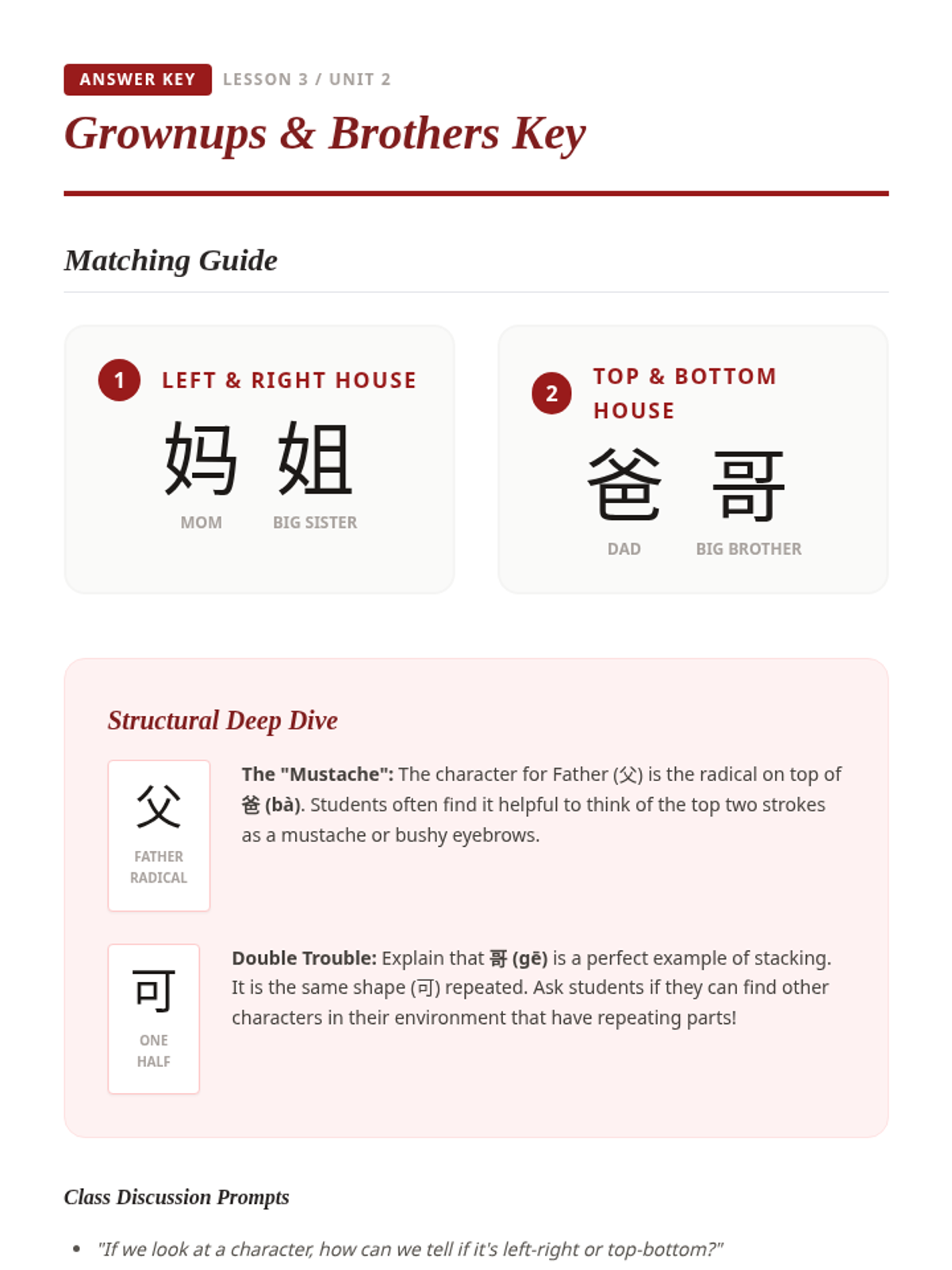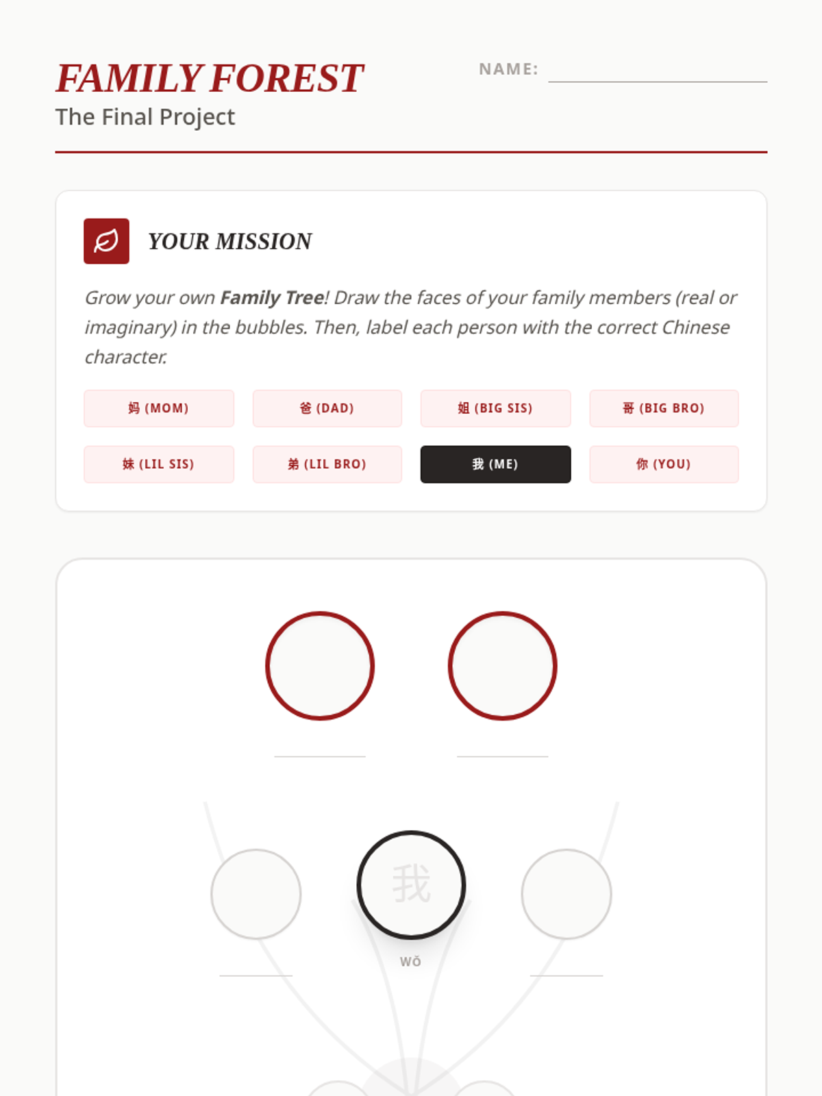 Students explore social structures and family relationships through Mandarin characters, focusing on the 'person' and 'female' radicals, pronouns, and familial hierarchy. The unit culminates in a project-based family tree where students apply their knowledge of character structure and labels.