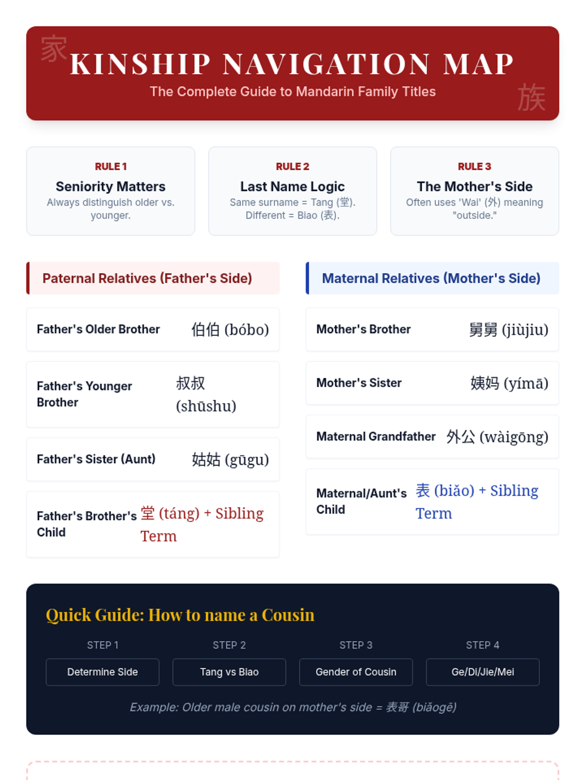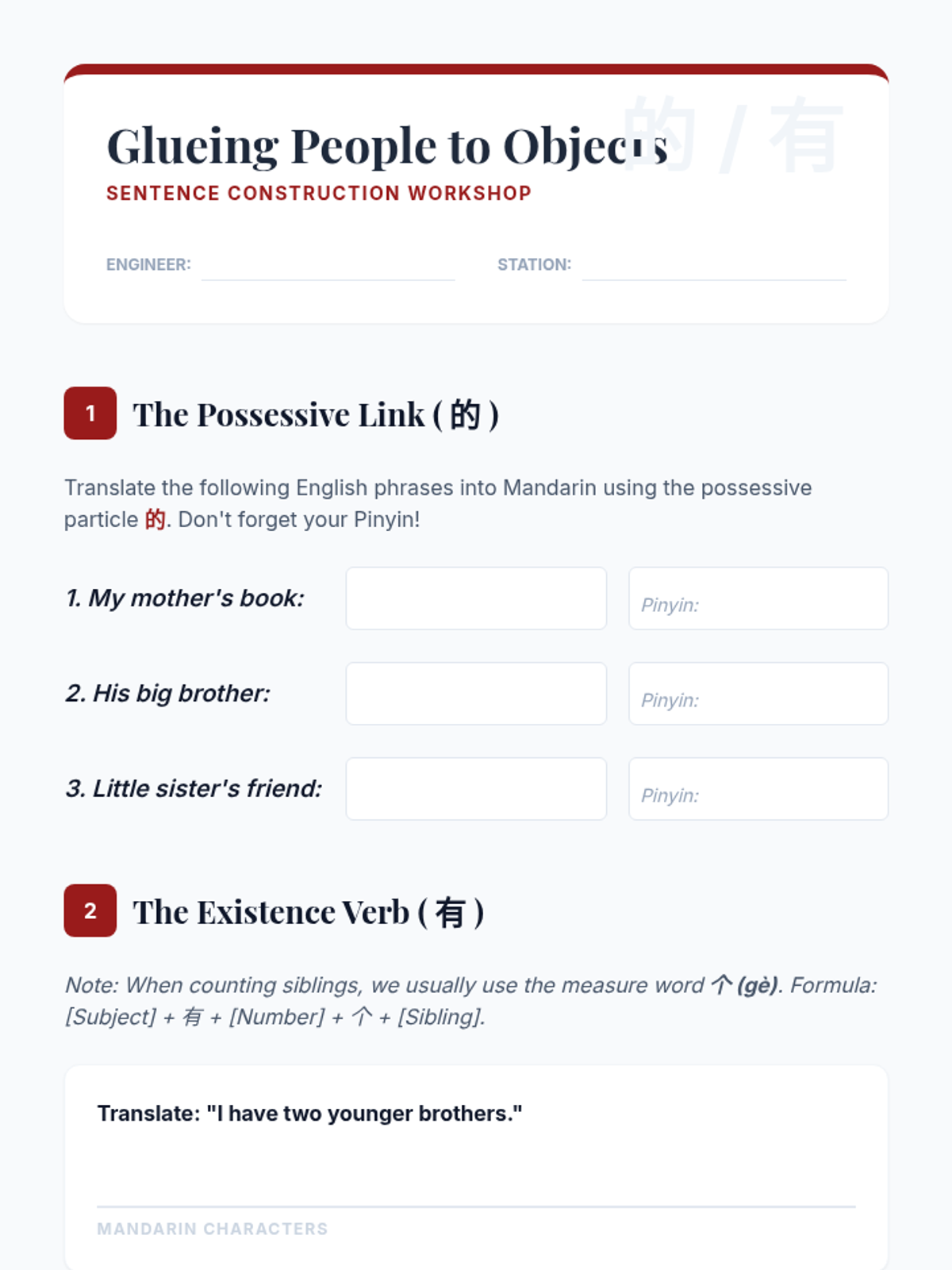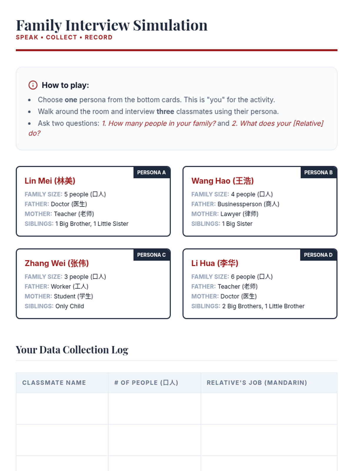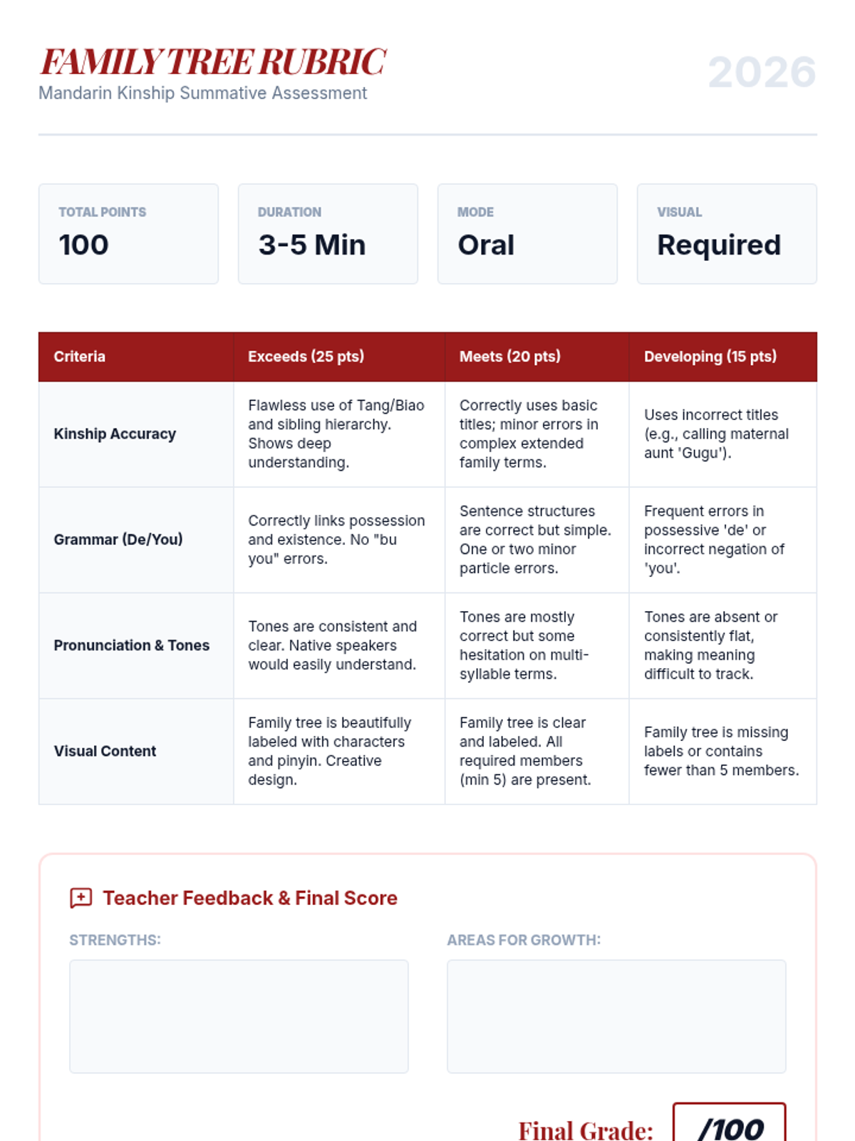A comprehensive unit for high school Mandarin learners focusing on kinship terms, possessive grammar, and the cultural significance of family hierarchy and lineage in Chinese society. Students progress from immediate family to complex extended relationships, culminating in a creative family tree presentation.