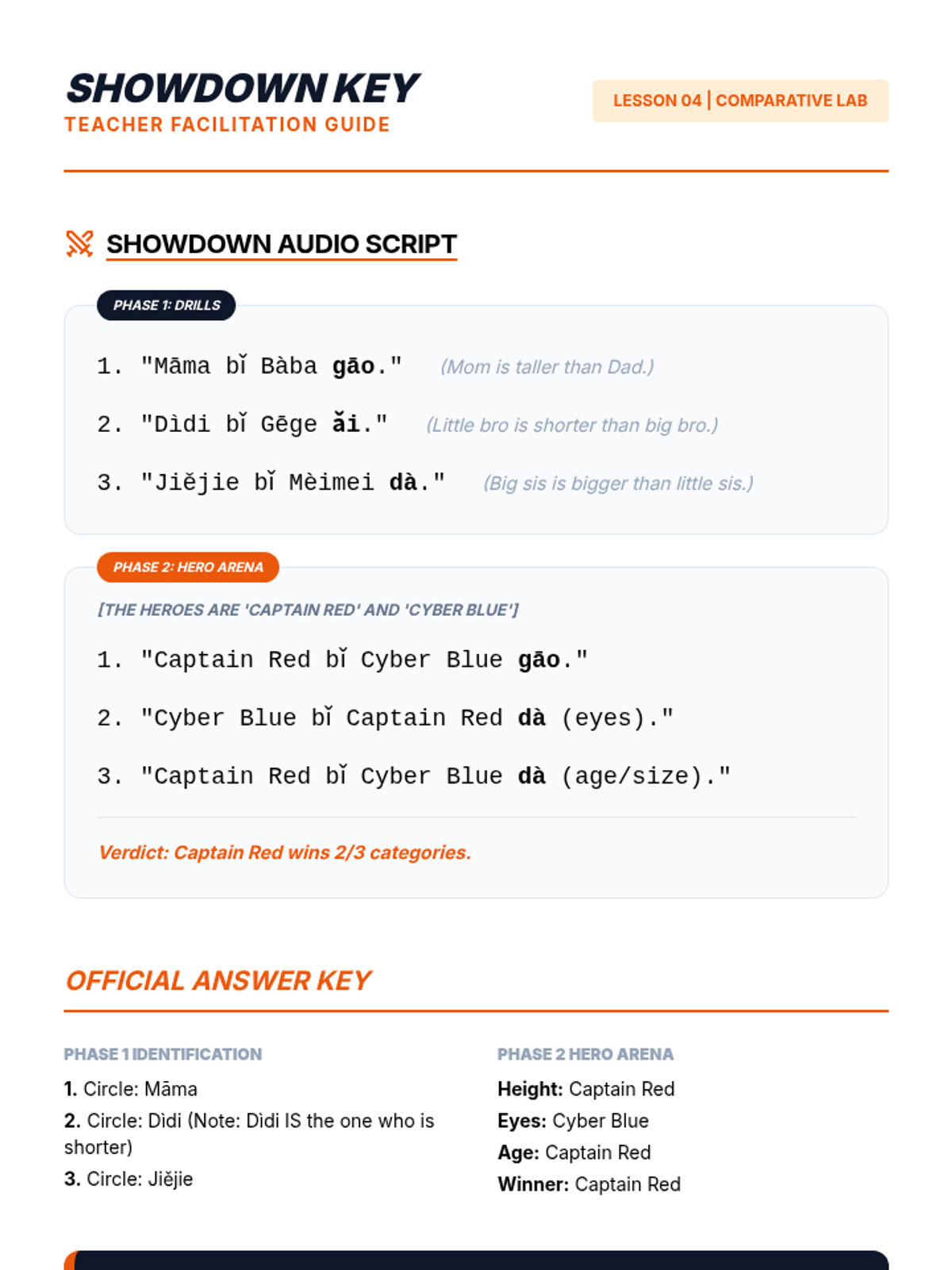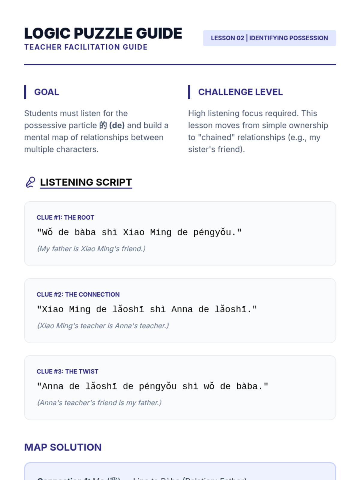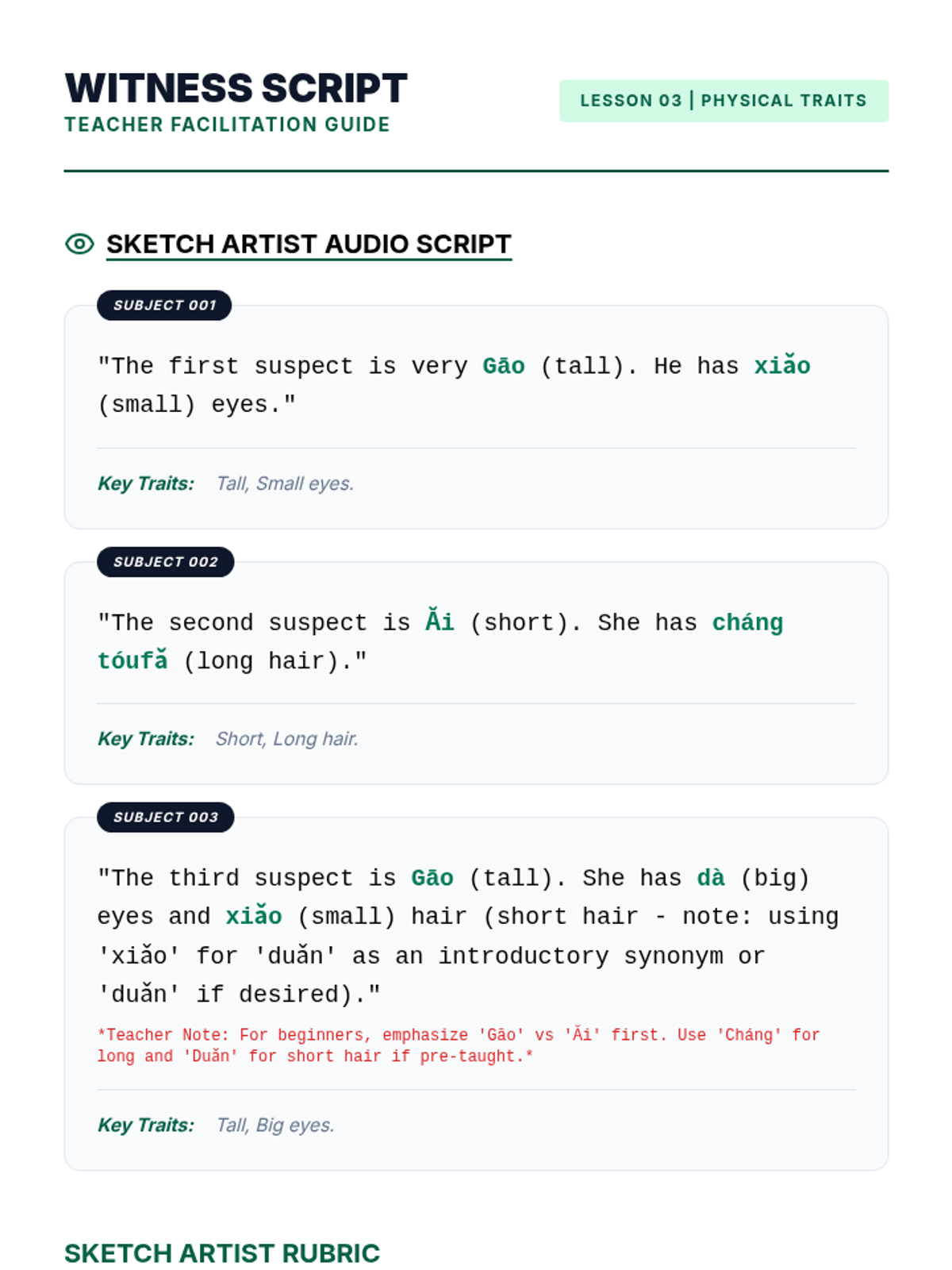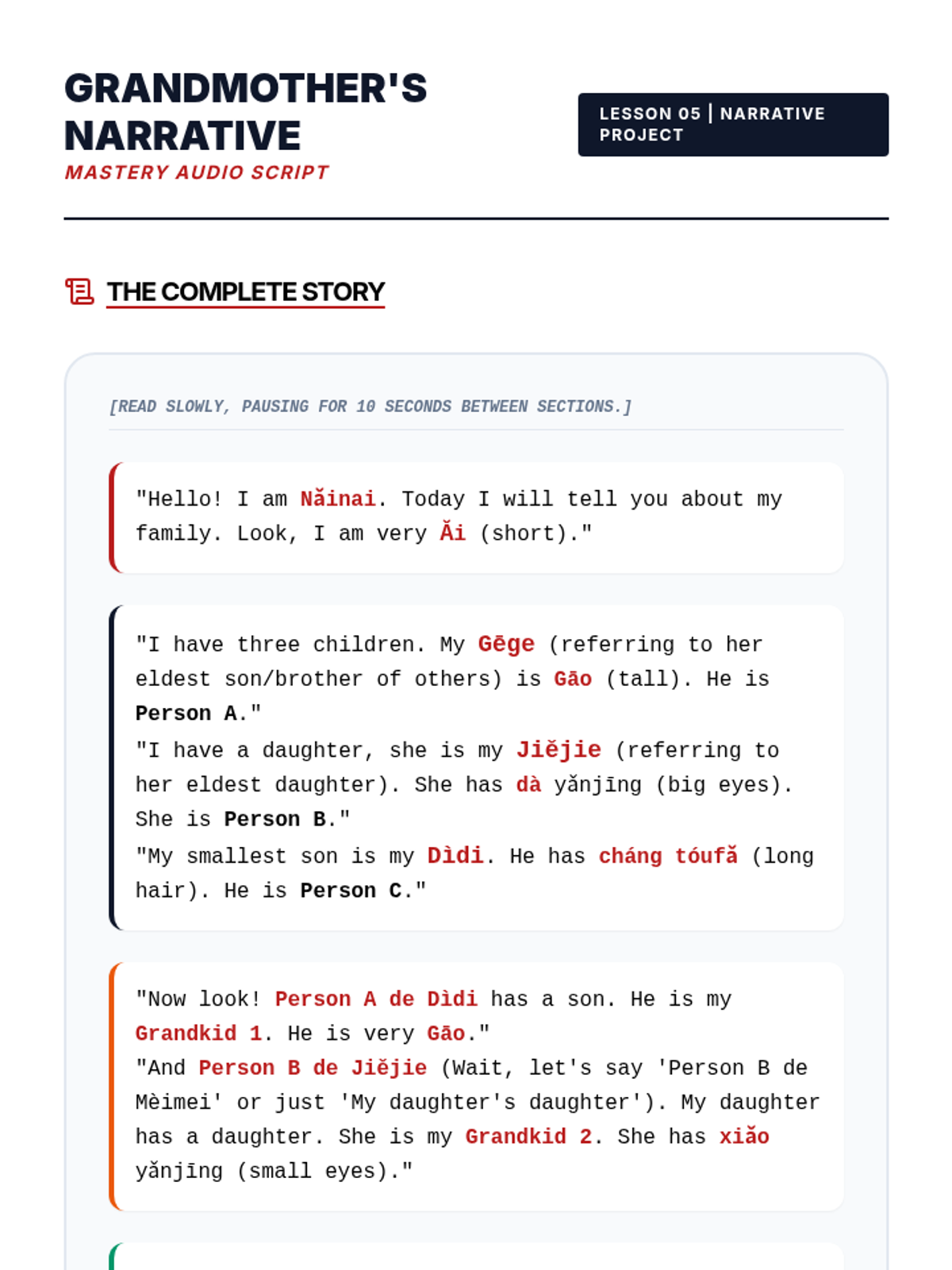 A 6th-grade Mandarin Chinese sequence focusing on listening comprehension for family members and physical descriptions. Students progress from basic kinship titles to complex comparative structures and narrative synthesis.